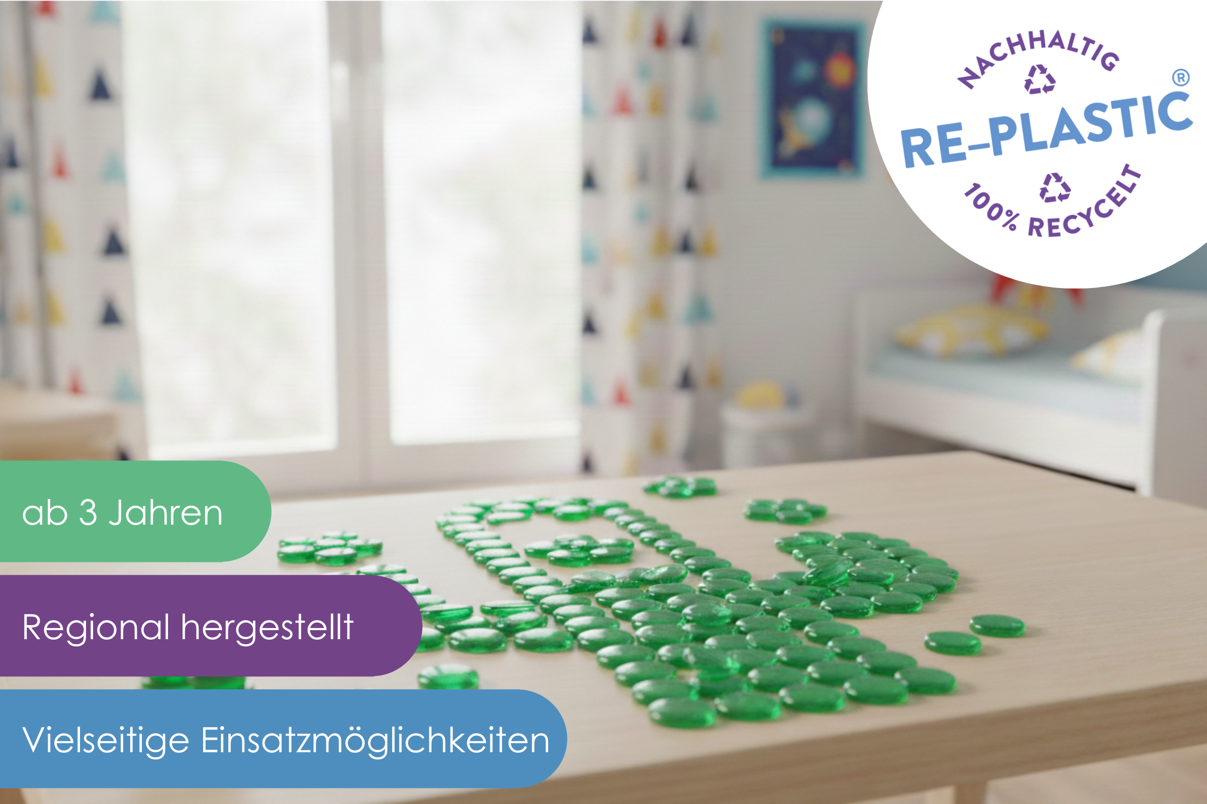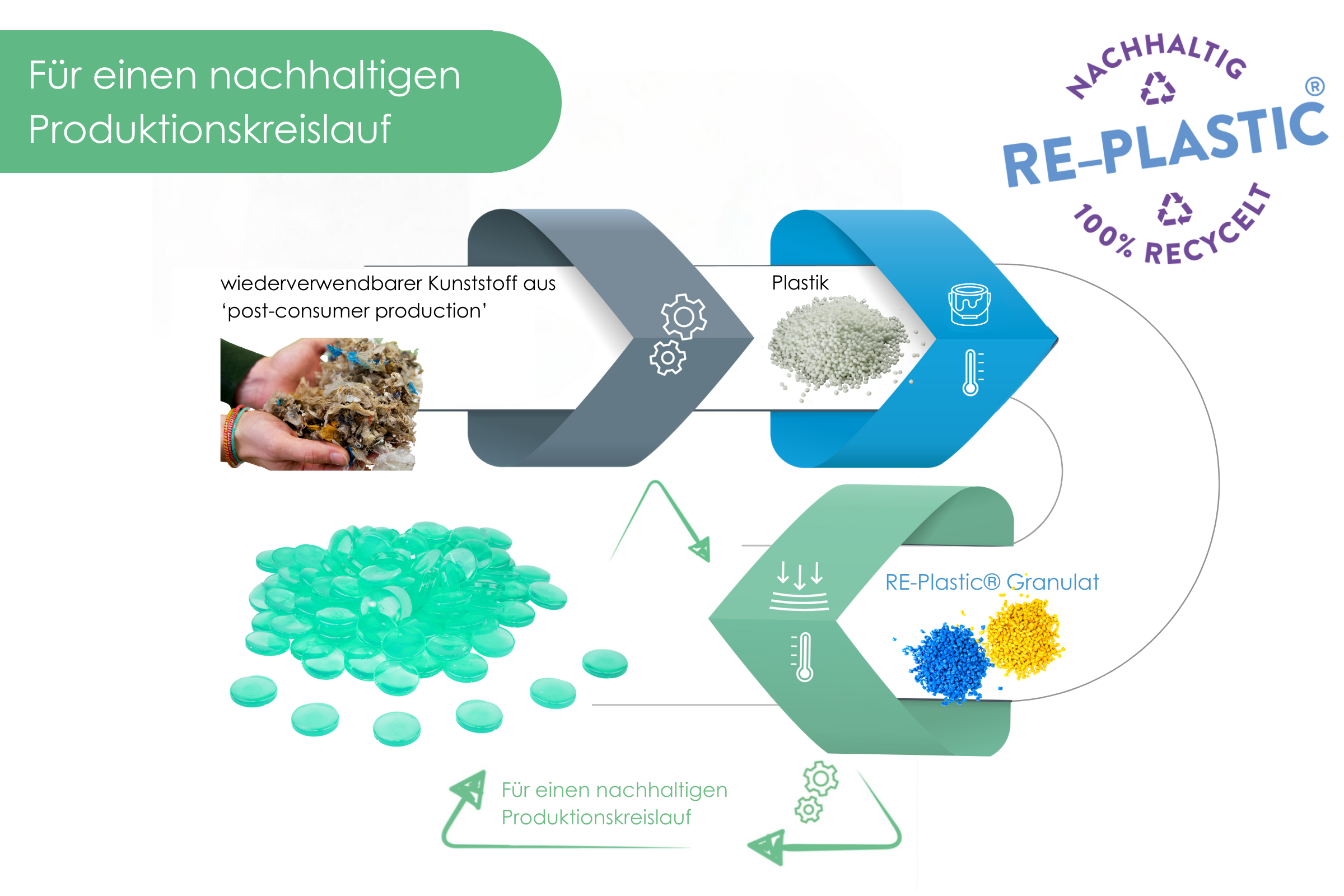 RE-Plastic ist 100% post-consumer-recycelter Kunstoff, der immer wieder zu 100% recycelbar ist.