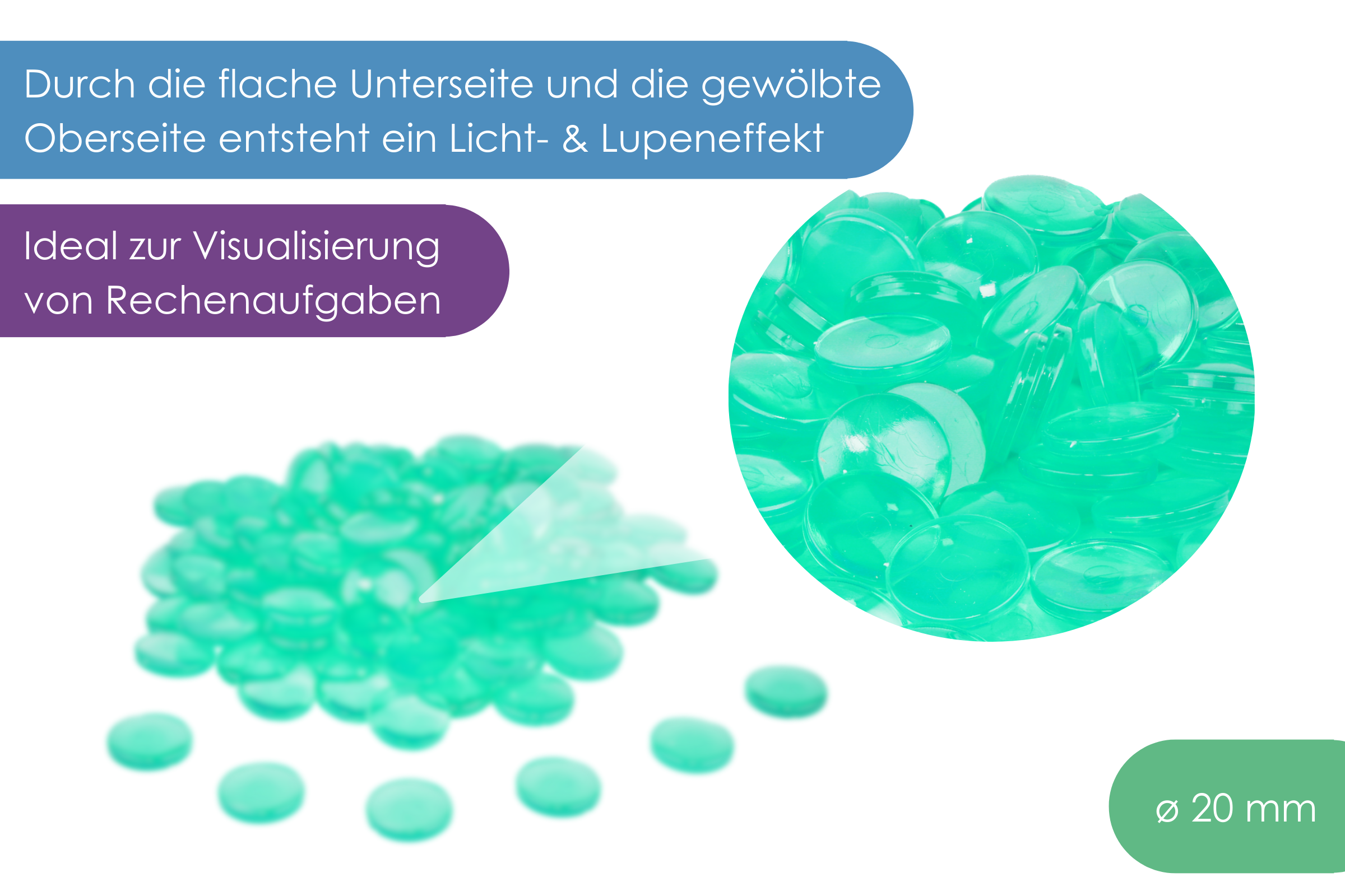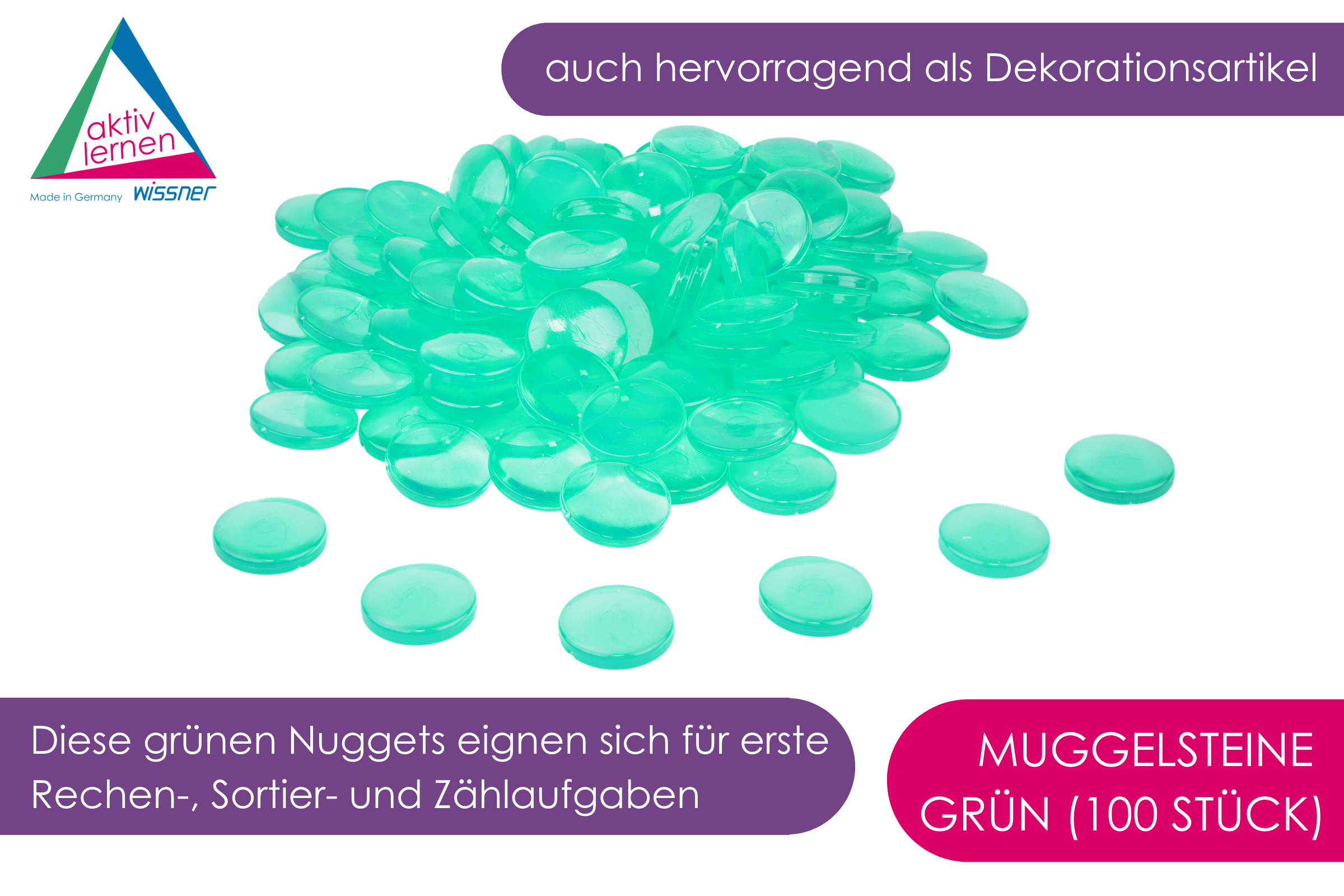 Diese grünen Nuggets eignen sich für erste Rechen-, Sortier- und Zählaufgaben. Durch die flache Unterseite und die gewölbte Oberseite entsteht ein Lichteffekt, wodurch sich die Muggelbausteine auch als Lupe und für den Optikunterricht eig- nen. Das Legematerial eignet sich auch hervorragend als Dekorationsartikel und bietet zahlreiche Bastel- und Gestaltungsideen.