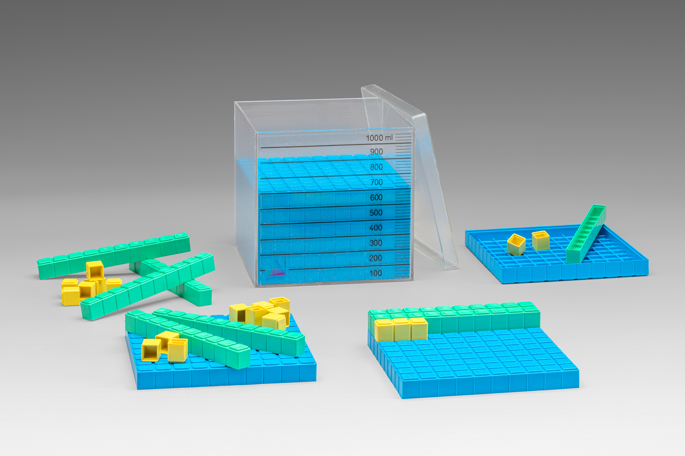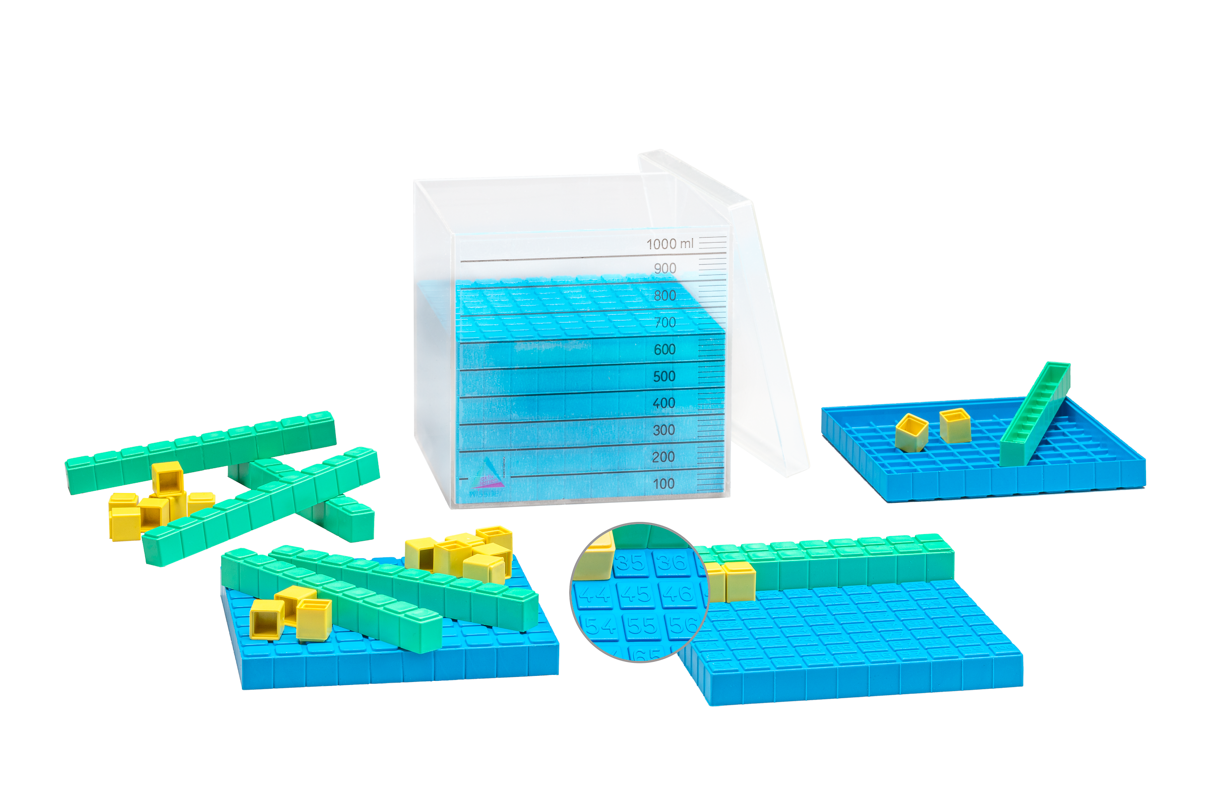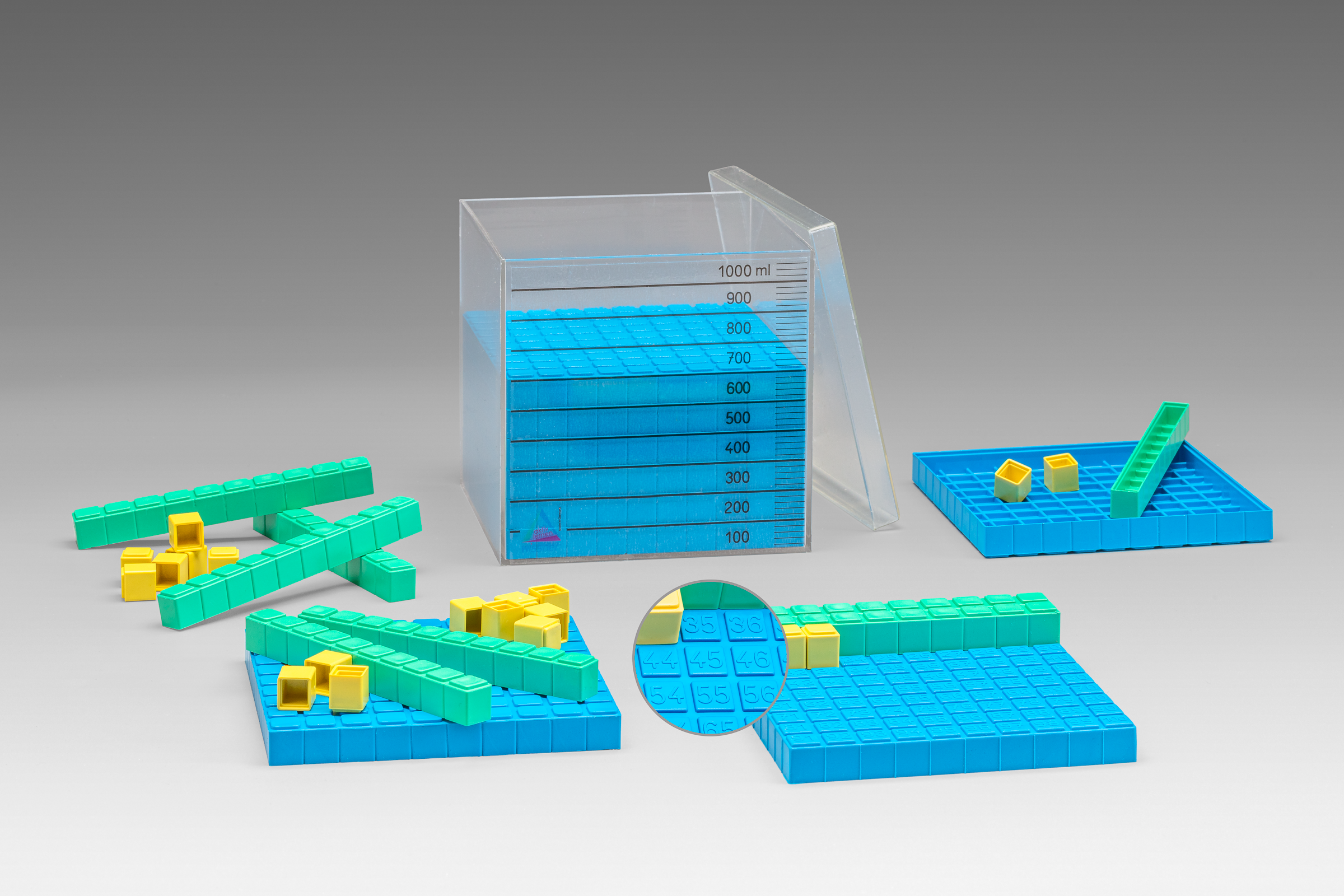 9 blue hundred flats (8 plain and one with raised numbers from 1 to 100), 8 green rods, 20 yellow single cubes in a decimeter cube with scale and lid.