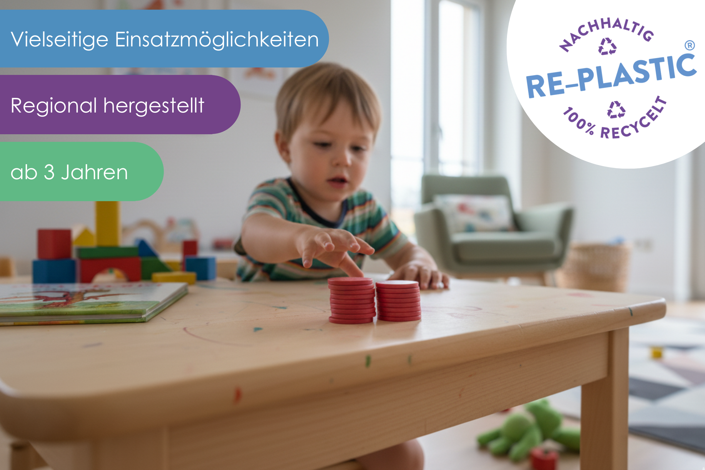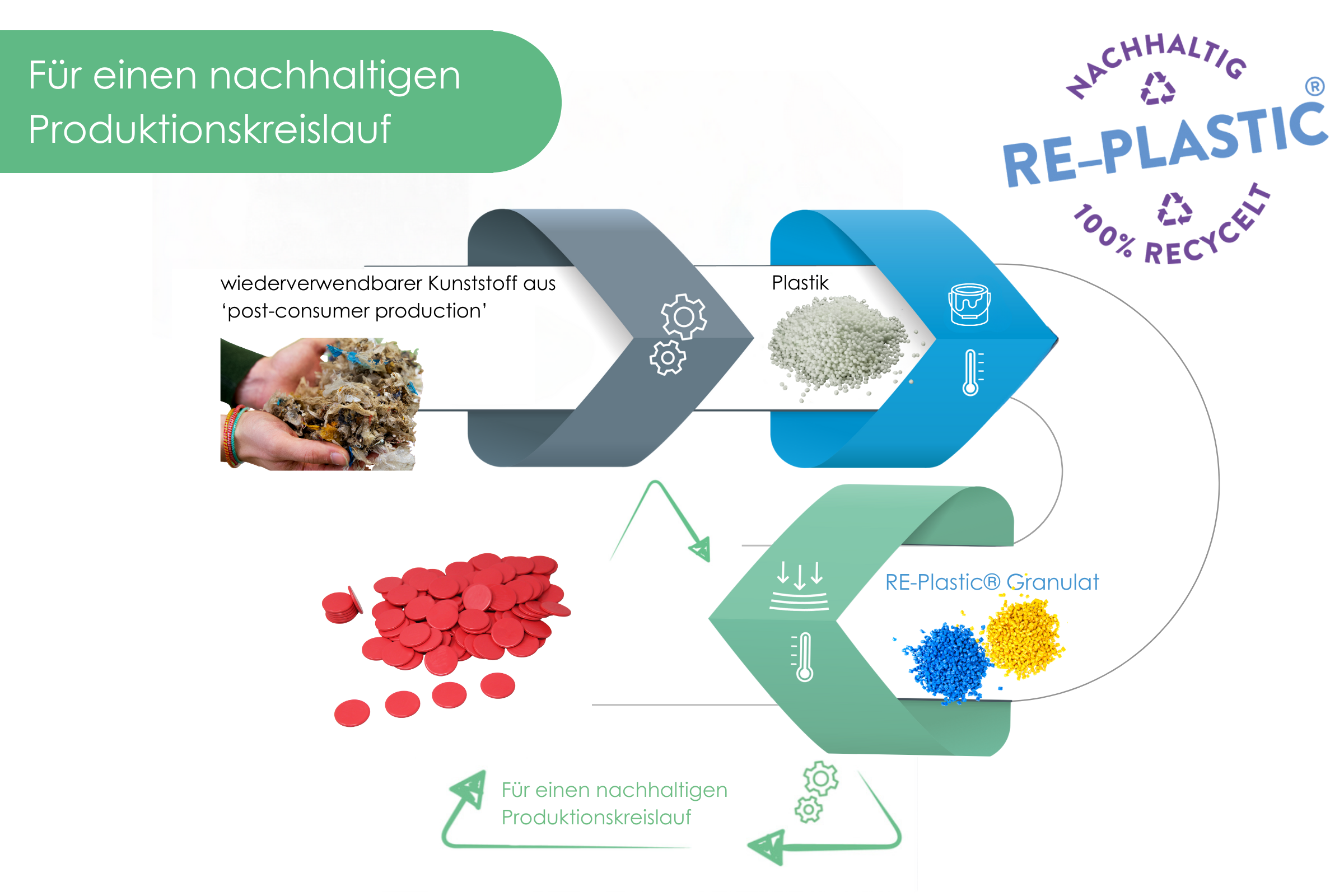 RE-Plastic ist 100% post-consumer-recycelter Kunstoff, der immer wieder zu 100% recycelbar ist.