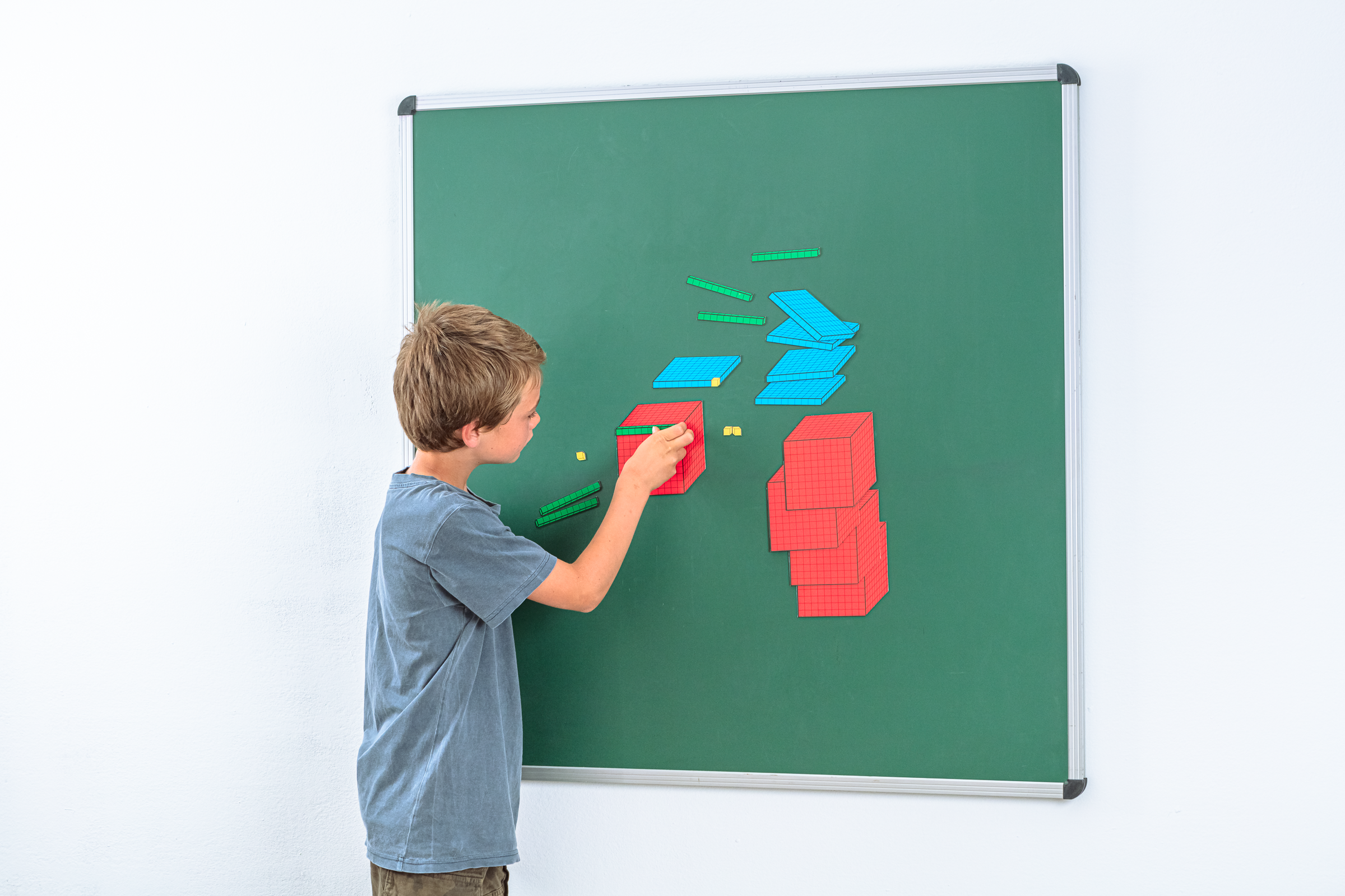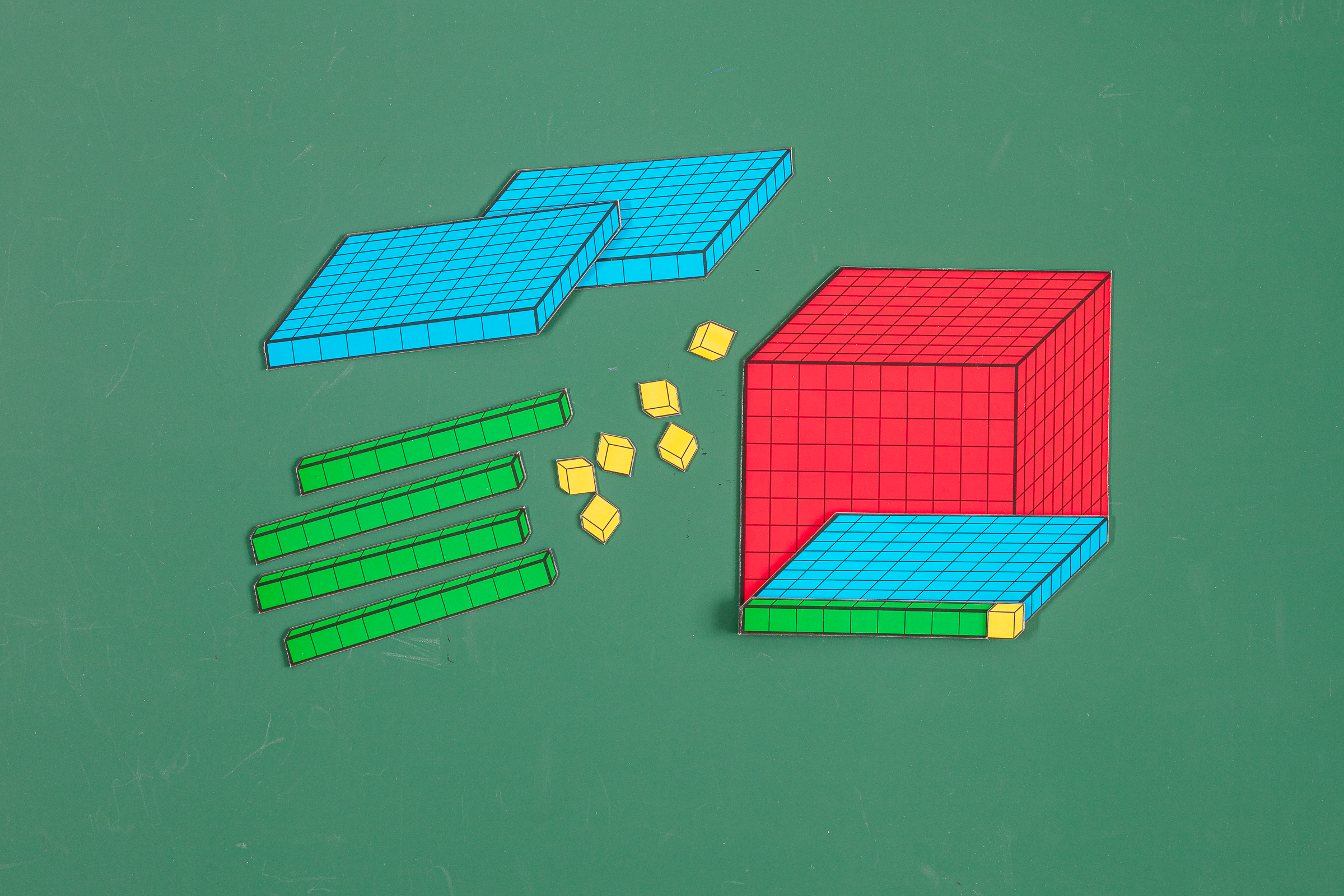 Inhalt (insgesamt 54 Teile): 25 gelbe Einerwürfelchen, 12 grüne Zehnerstäbe, 12 blaue Hunderterplatten und 5 rote Tausenderwürfel.