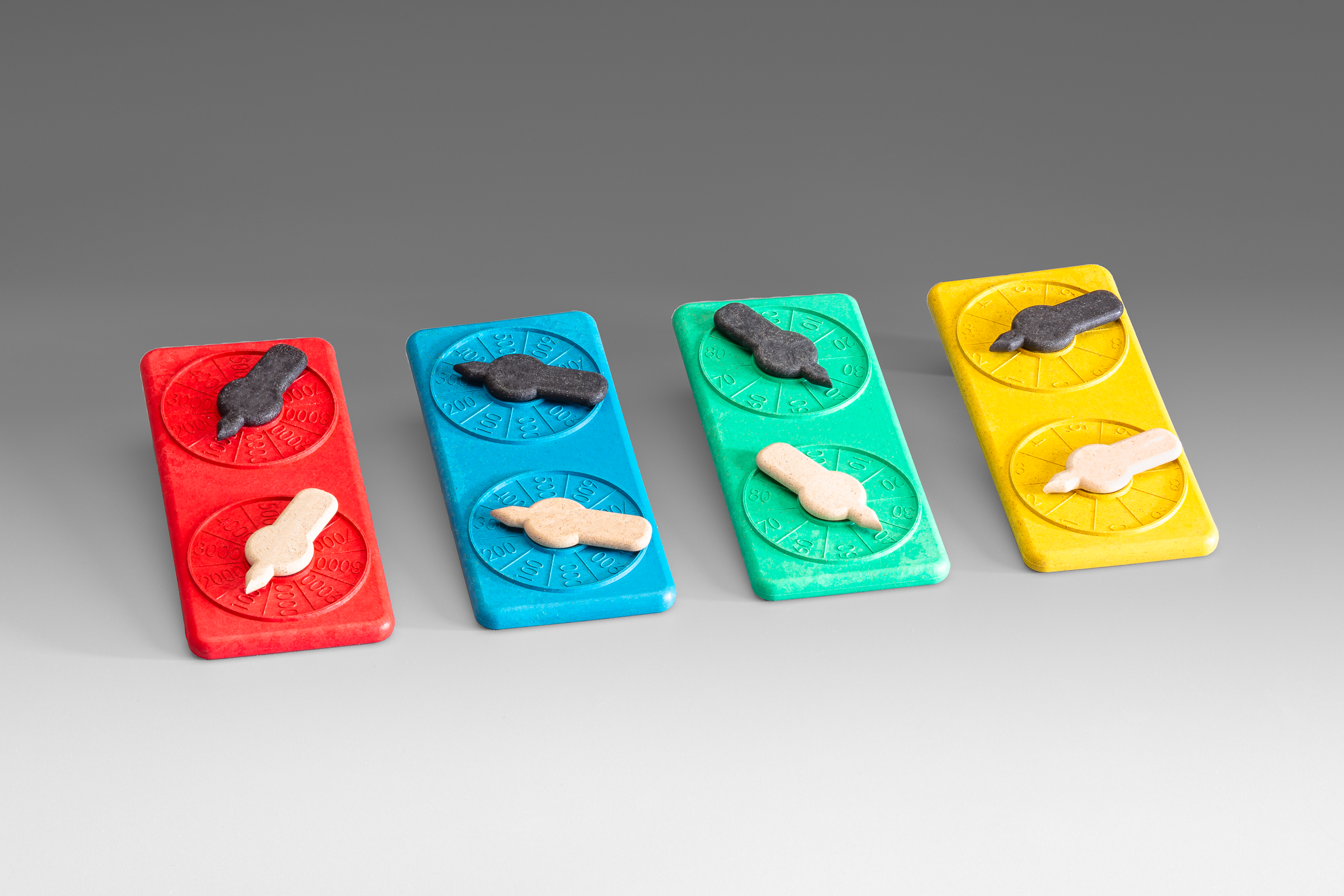 4 Doppel-Drehräder für Einer- (gelb), Zehner- (grün), Hunderter- (blau) und Tausender-Stellenwerte (rot).