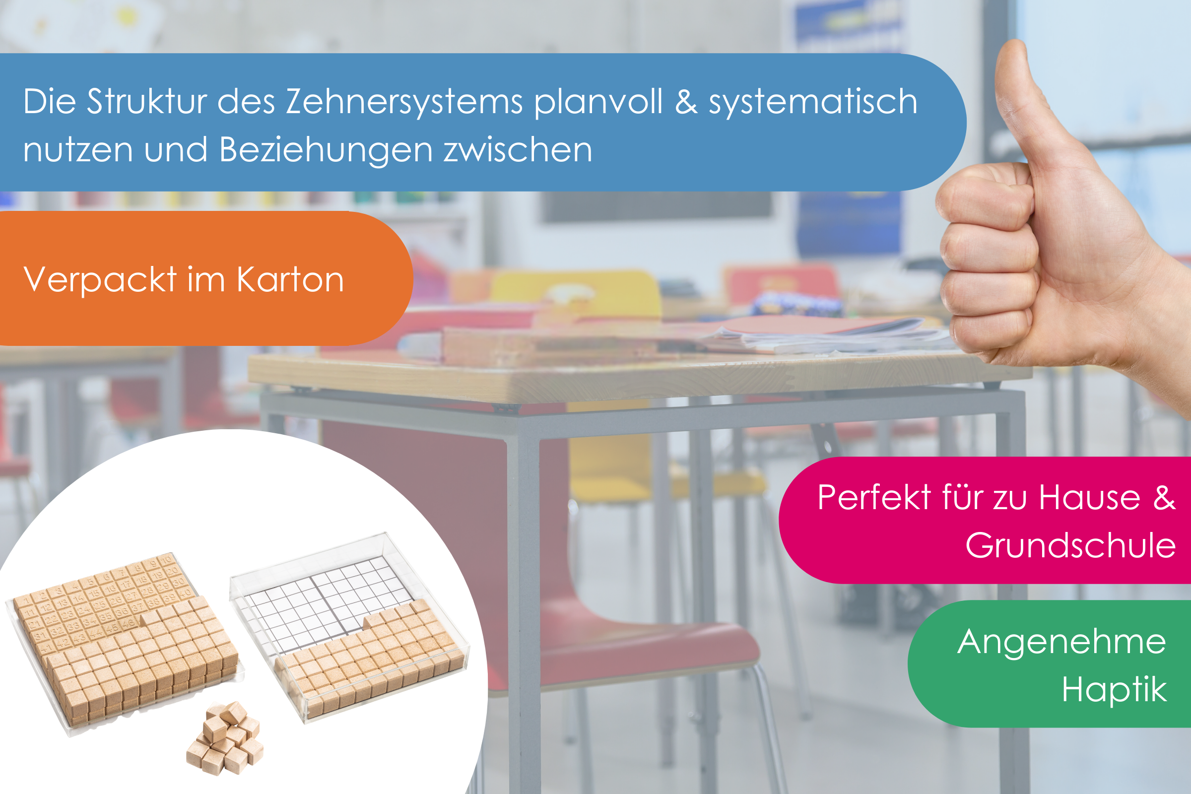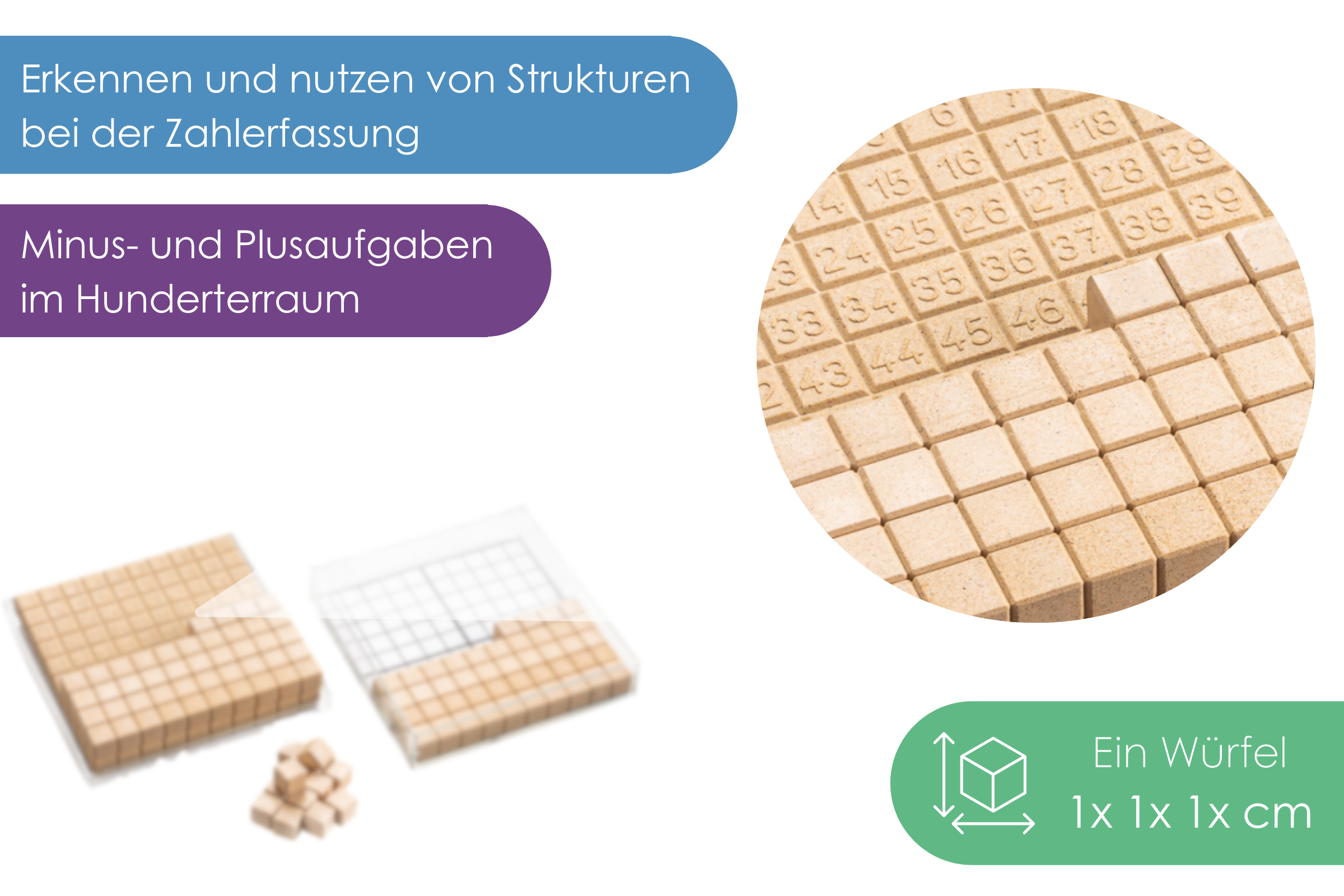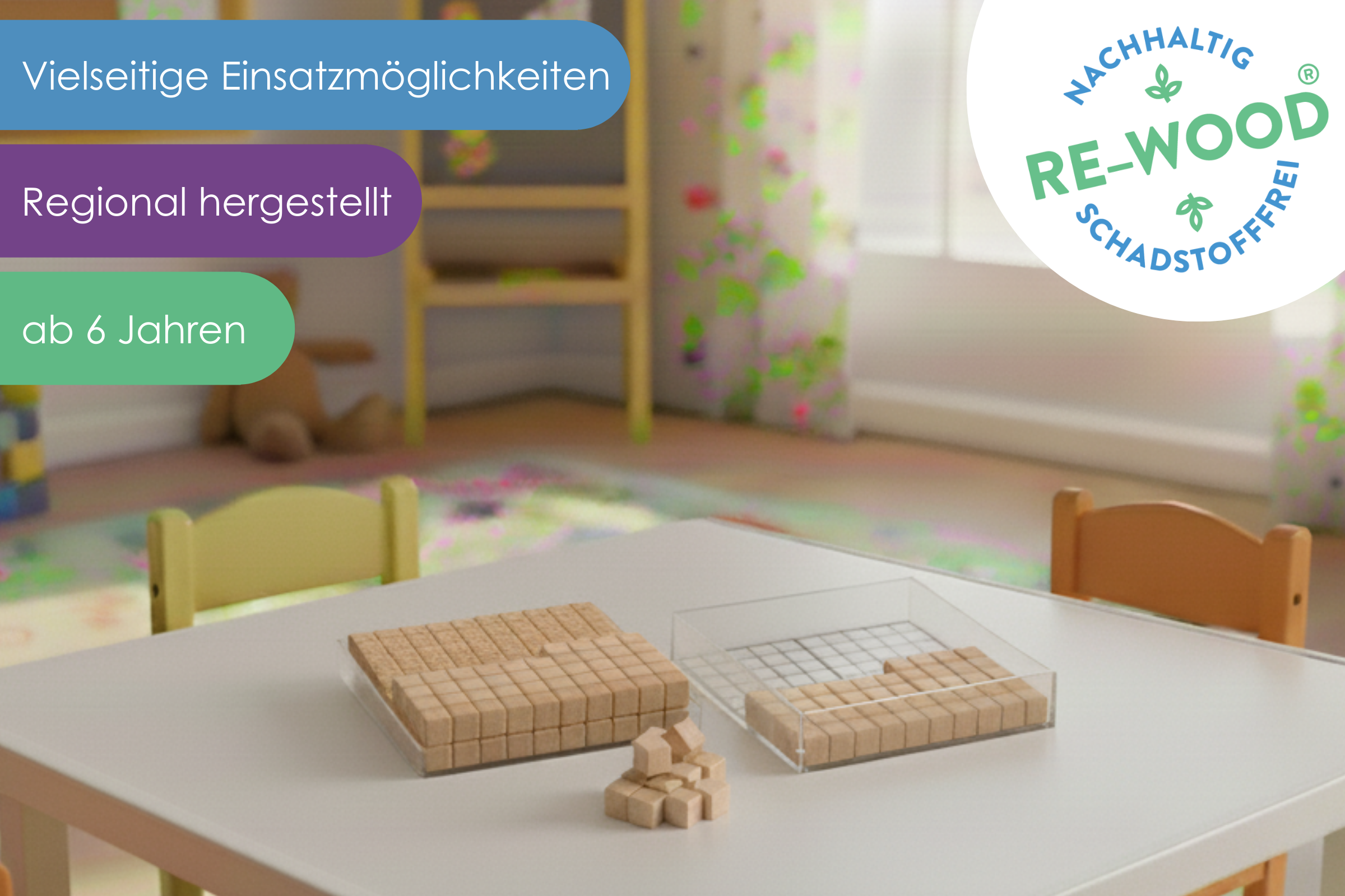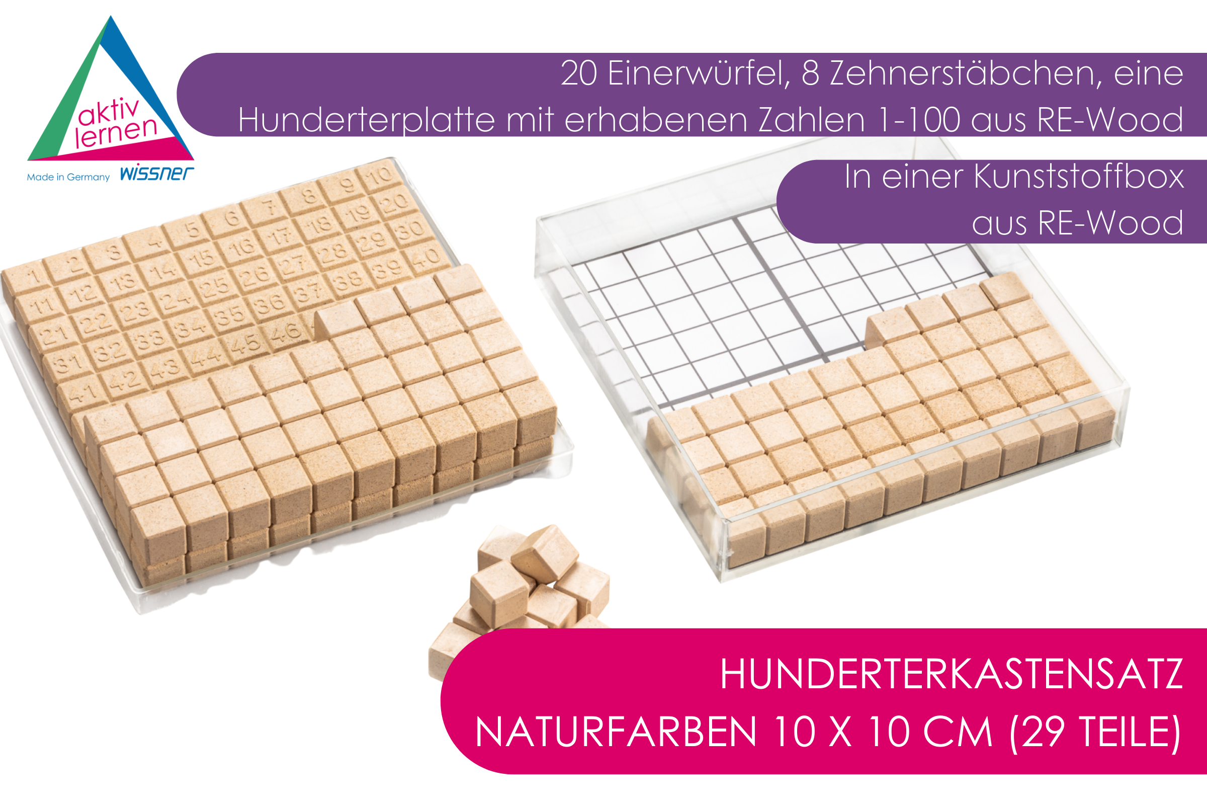 Mit 20 Einerwürfeln, 8 Zehnerstäbchen, einer Hunderterplatte mit erhabenen Zahlen 1-100 aus RE-Wood und einem Einlegeblatt mit 100er Gitter in einer Kunststoffbox aus RE-Plastic.
