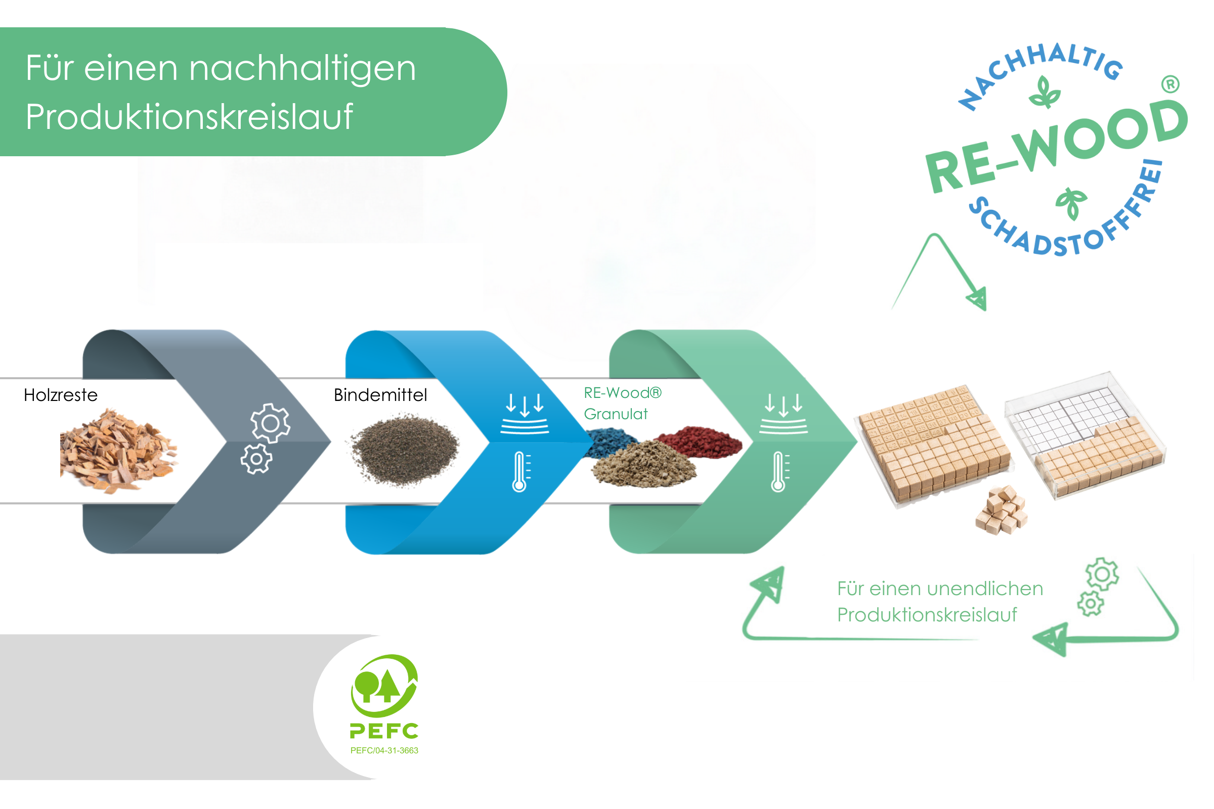 RE-Wood besteht zu 100% aus recycelten Materialien (bis zu 80% aus regionalen Holzabfällen), ist PEFC zertifiziert und nach Gebrauch immer wieder recycelbar.