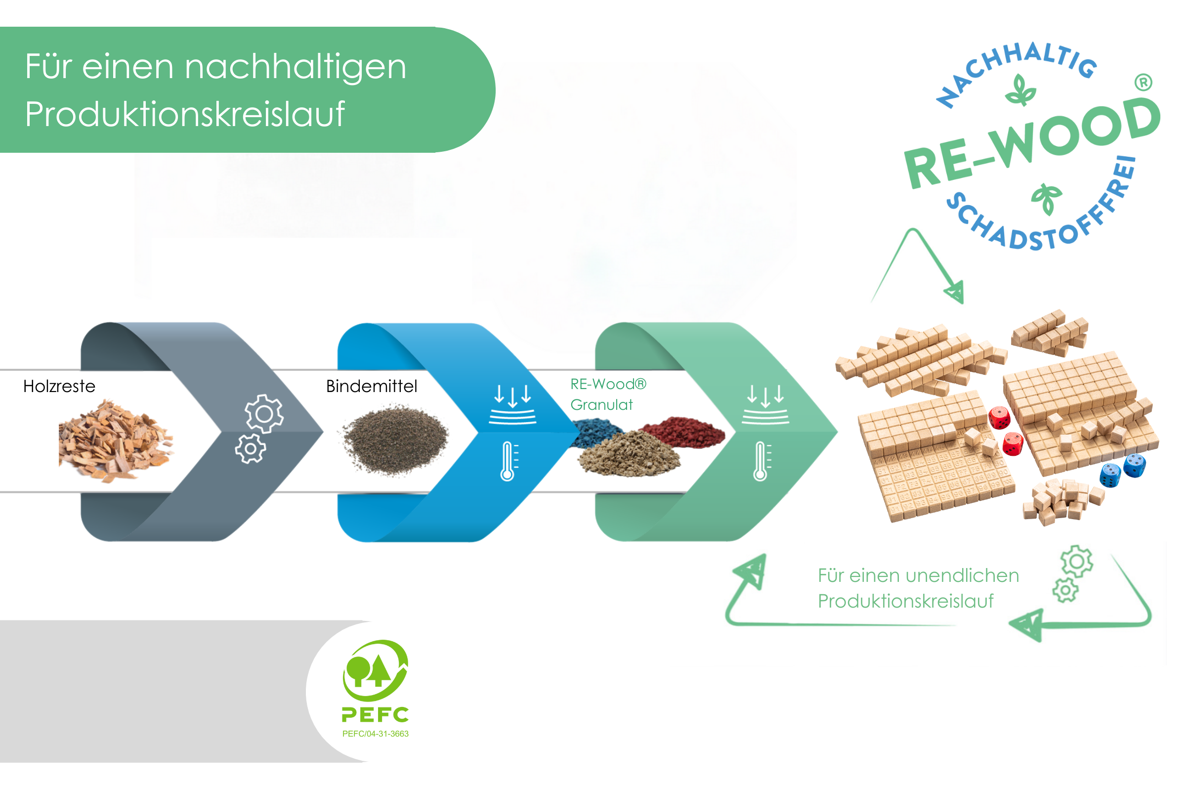 RE-Wood besteht zu 100% aus recycelten Materialien (bis zu 80% aus regionalen Holzabfällen), ist PEFC zertifiziert und nach Gebrauch immer wieder recycelbar.