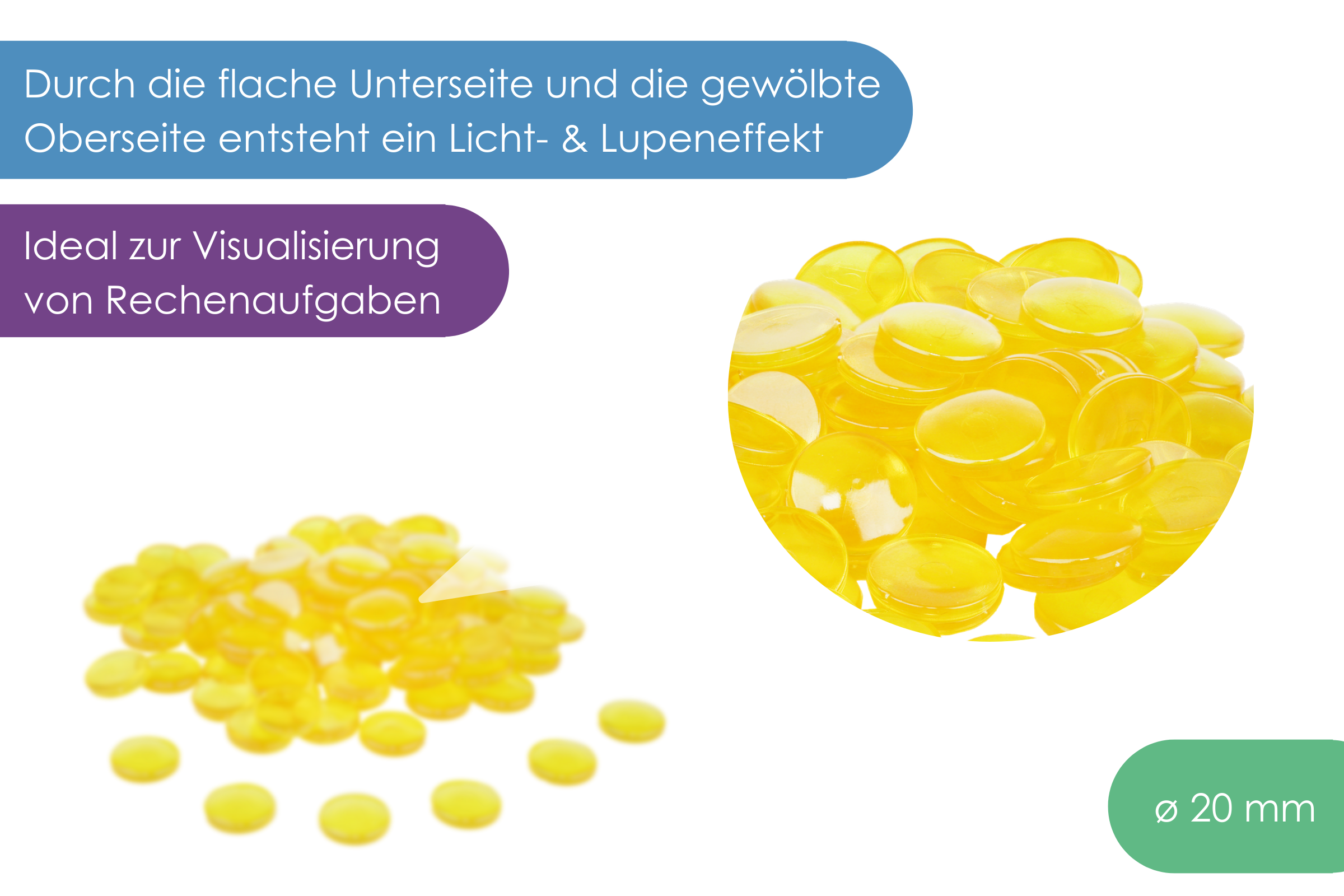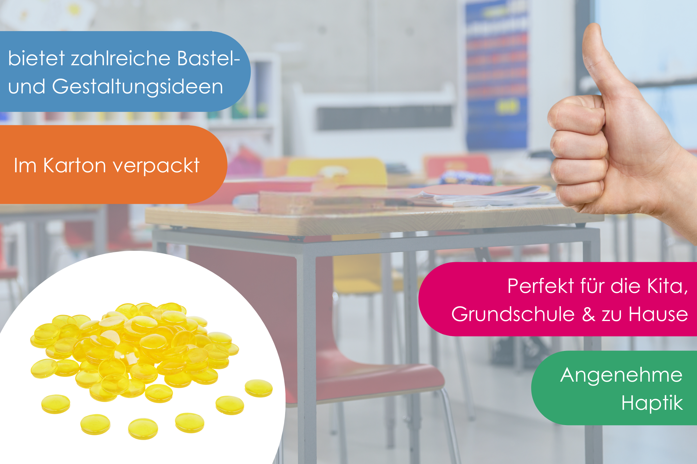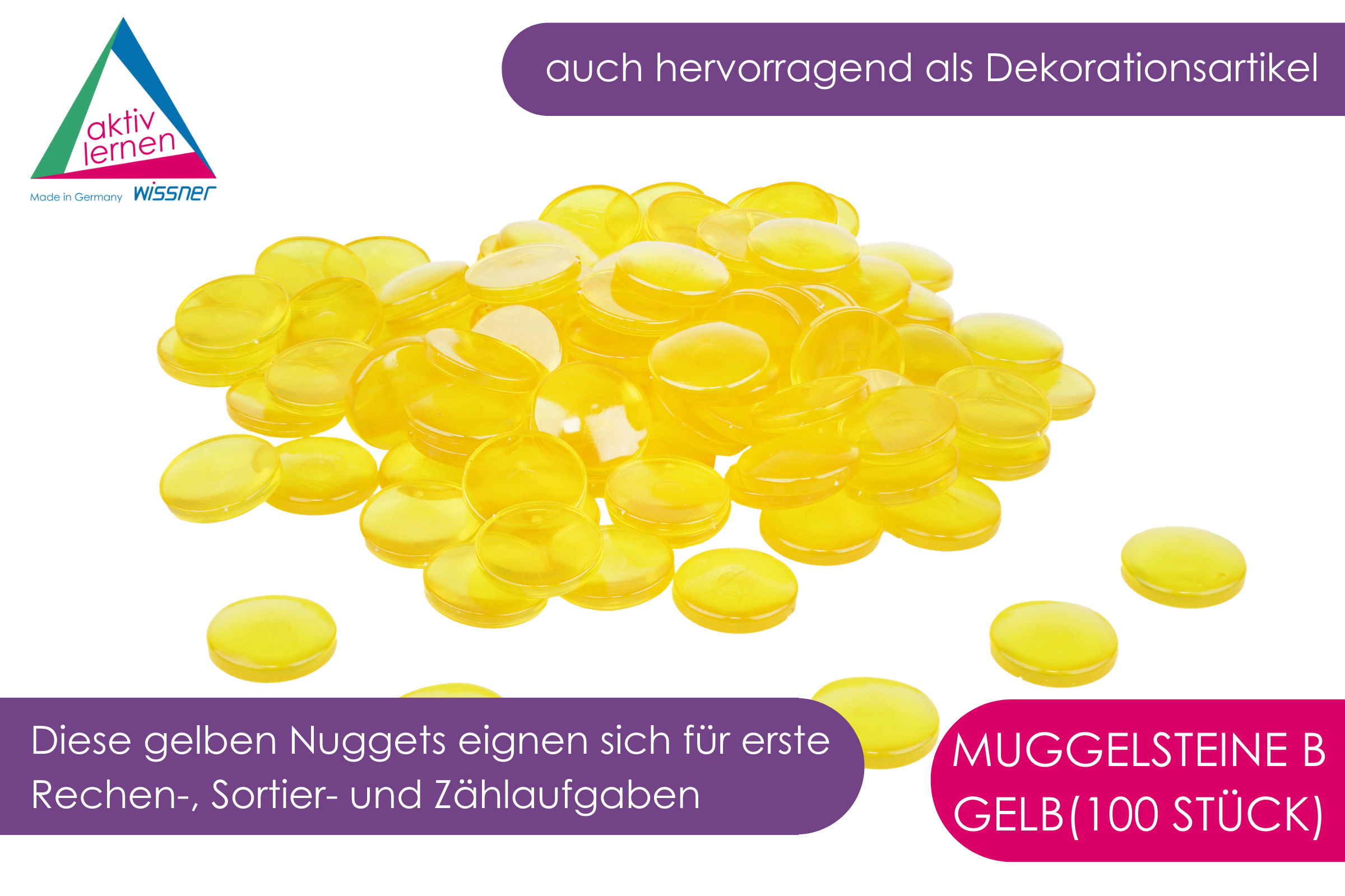 Diese gelben Nuggets eignen sich für erste Rechen-, Sortier- und Zählaufgaben. Durch die flache Unterseite und die gewölbte Oberseite entsteht ein Lichteffekt, wodurch sich die Muggelbausteine auch als Lupe und für den Optikunterricht eig- nen. Das Legematerial eignet sich auch hervorragend als Dekorationsartikel und bietet zahlreiche Bastel- und Gestaltungsideen.