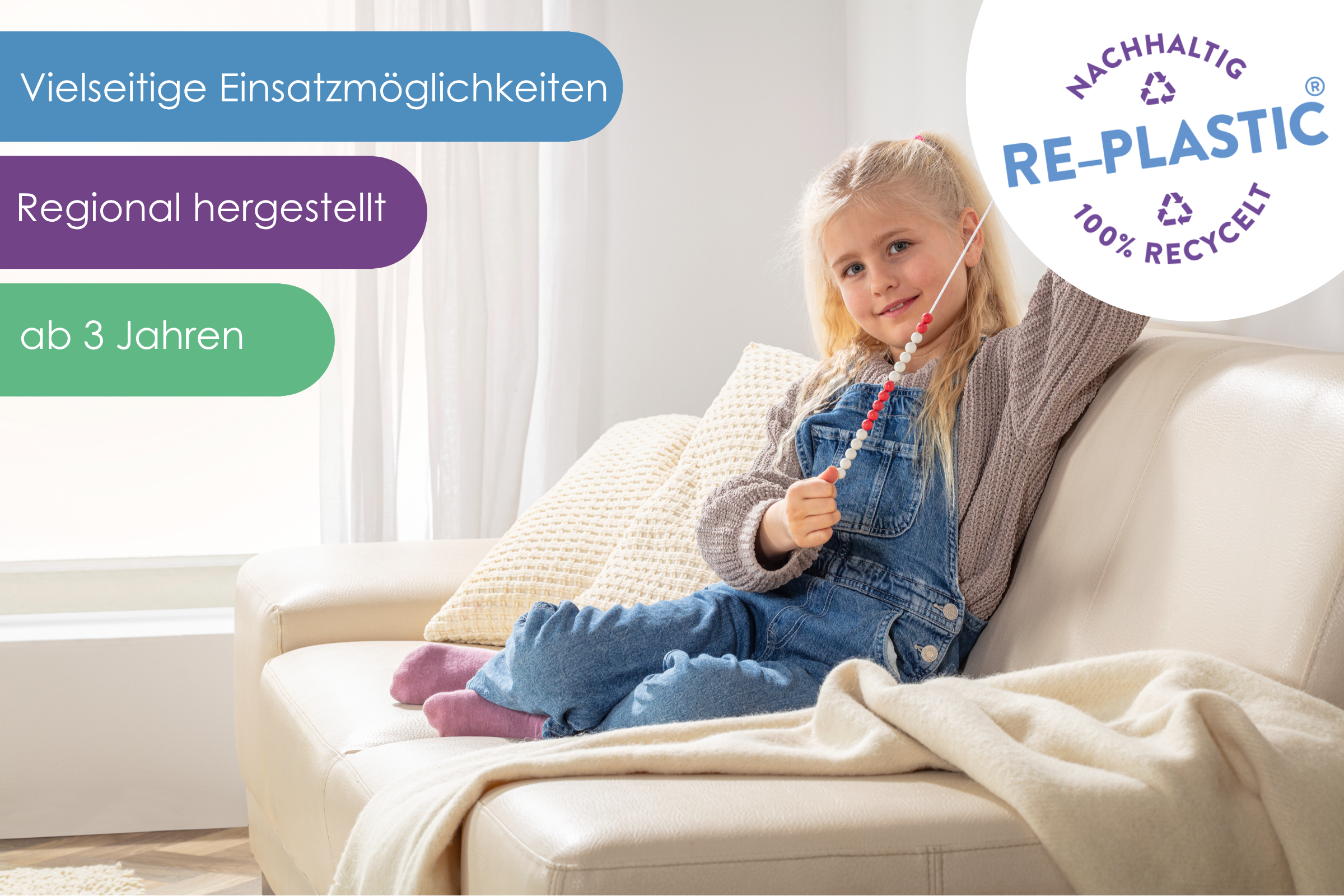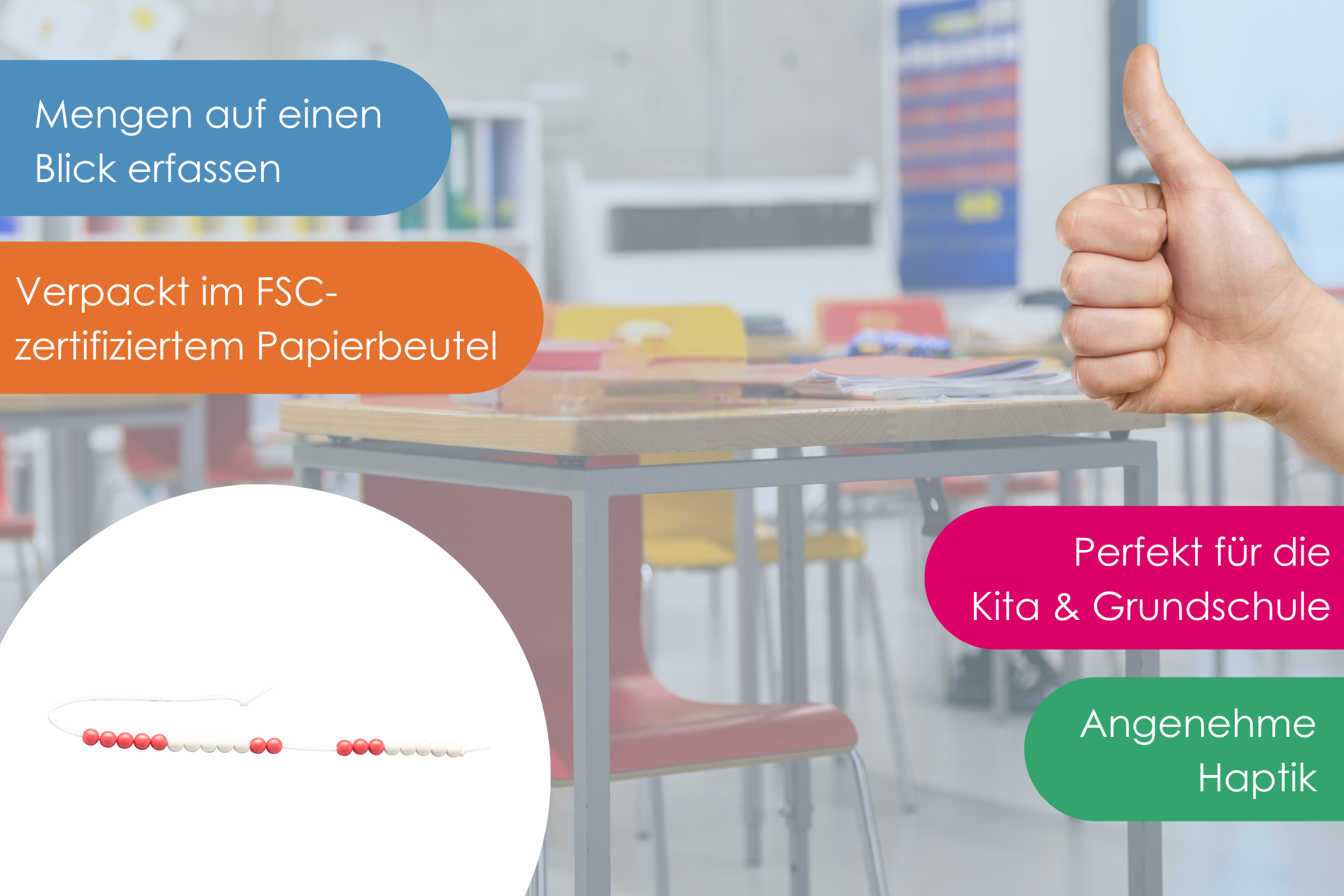 Rechenkette (ca. 45 cm) mit 20 Kugeln, die im 5er- Schritt auf einer reißfesten, dehnbaren Schnur aufgefädelt sind. Die Kugeln haben einen Durchmesser von 10 mm.