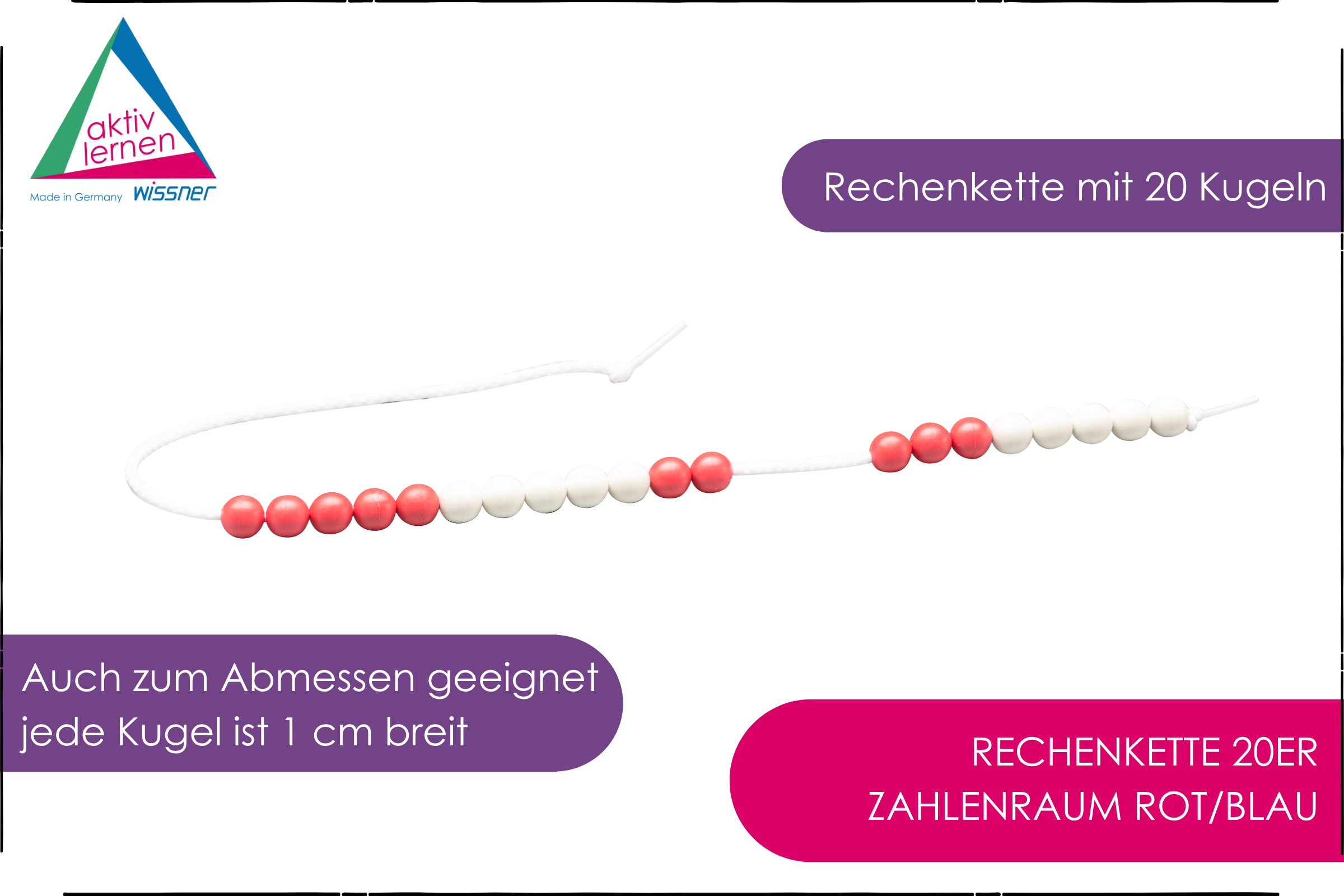 Unsere Rechenkette mit rot-weißen Kugeln ist die perfekte Hilfe für erste Mathe Aufgaben und hilft vom Zählen mit den Fingern wegzukommen. Ideal für Schulanfänger, um das Rechnen bis 20 sicher (auch mit Zehnerübergang) zu meistern und sich in der Feinmotorik zu üben. Macht Mathe lernen einfach: Addition & Subtraktion werden durch Verschieben der Kugeln sichtbar.