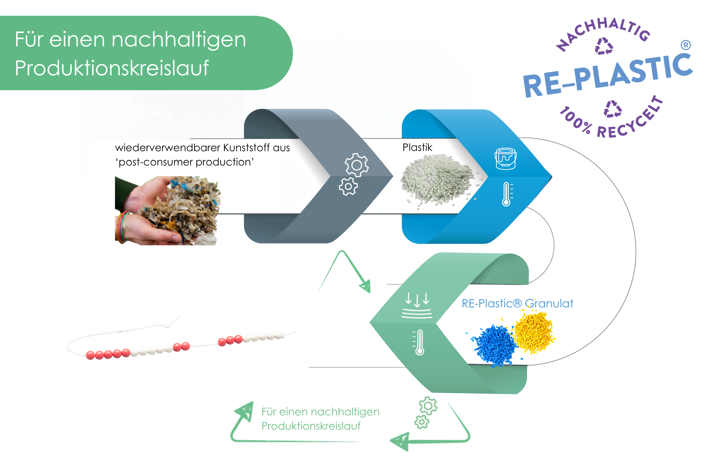 RE-Plastic ist 100% post-consumer-recycelter Kunstoff, der immer wieder zu 100% recycelbar ist.