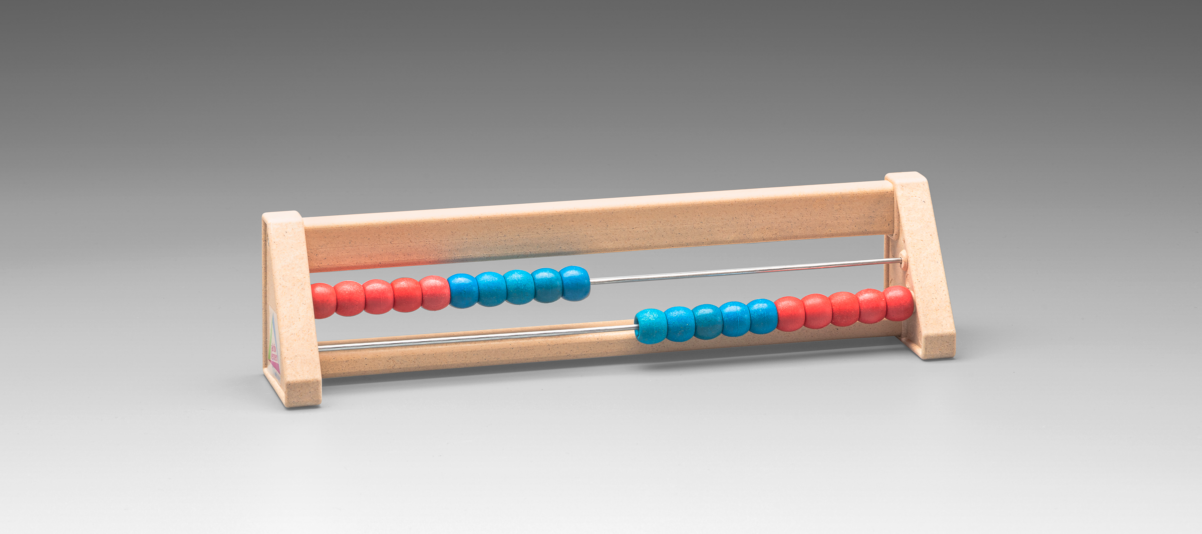 Unser Rechenrahmen 20 aus nachhaltigem RE-Wood® visualisiert mit rot-blauen Kugeln erste Rechenaufgaben. Ideal für Vorschule und 1. Klasse.