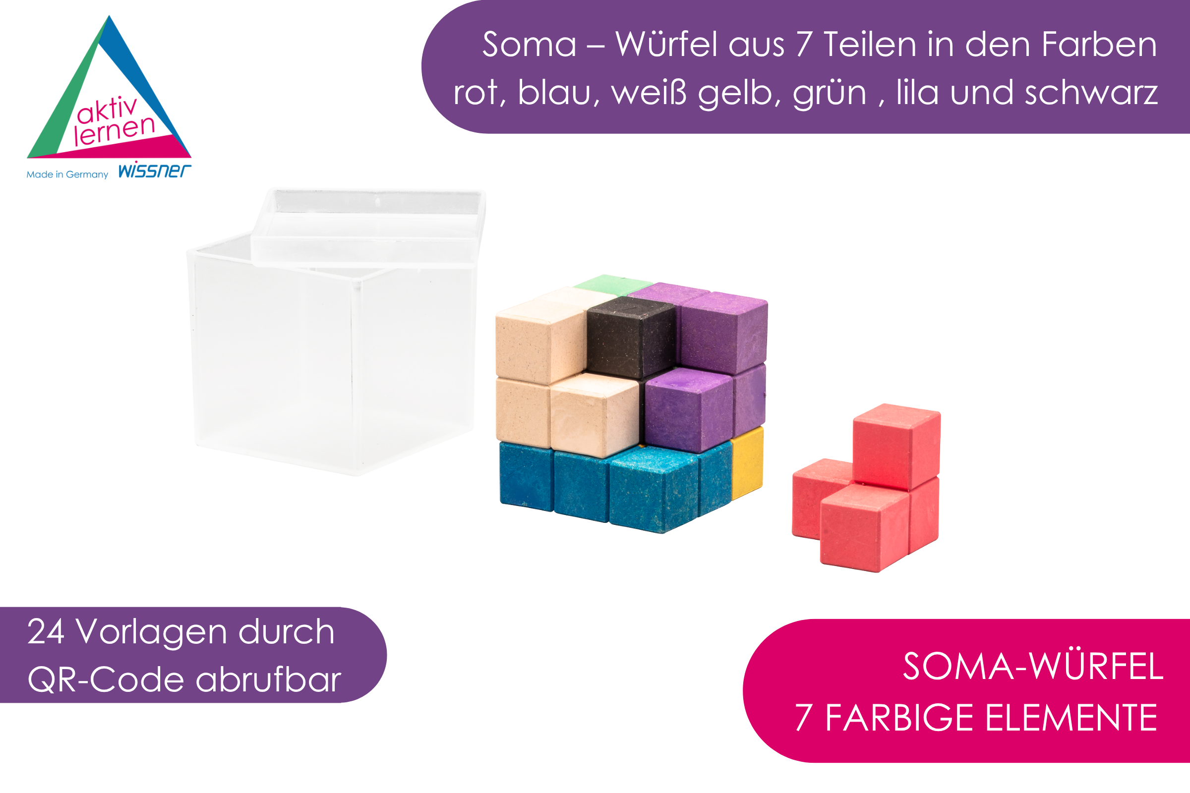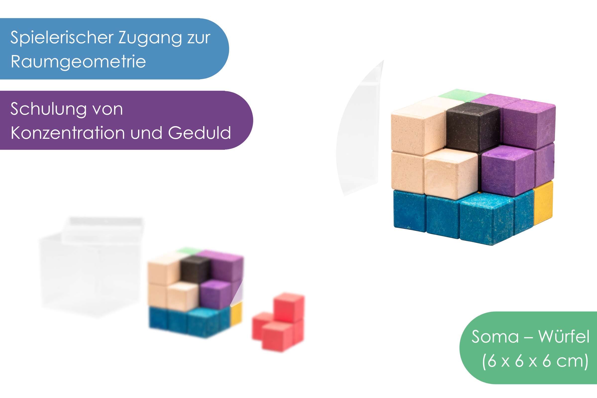Soma – Würfel (6 x 6 x 6 cm) aus RE-Wood® aus 7 Teilen in den Farben rot, blau, weiß gelb, grün , lila und schwarz. Die unterschiedlichen Teile sind jeweils aus 4 bzw. 3 Einzelsteinen zusammengesetzt.