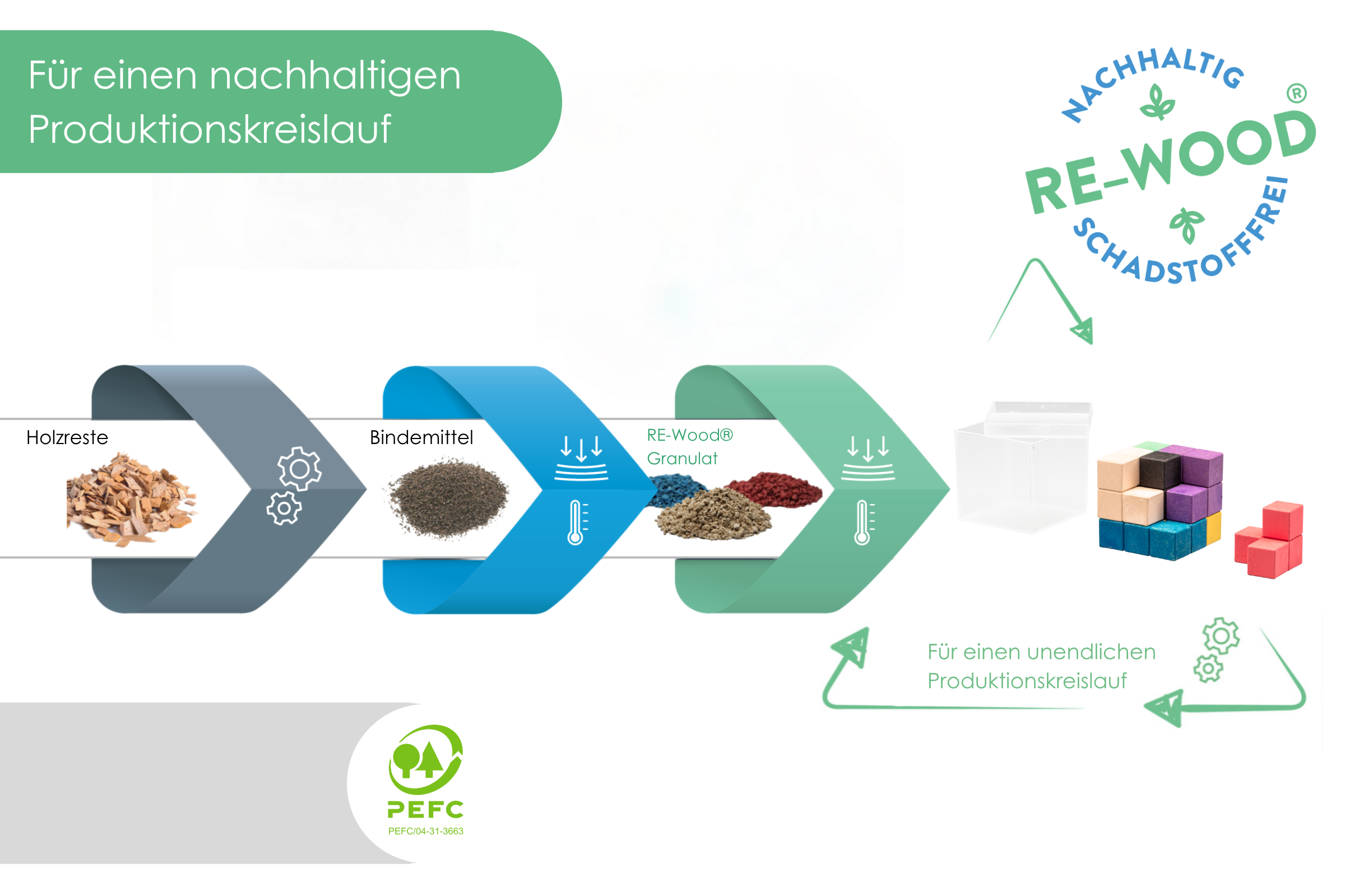 RE-Wood besteht zu 100% aus recycelten Materialien (bis zu 80% aus regionalen Holzabfällen), ist PEFC zertifiziert und nach Gebrauch immer wieder recycelbar.