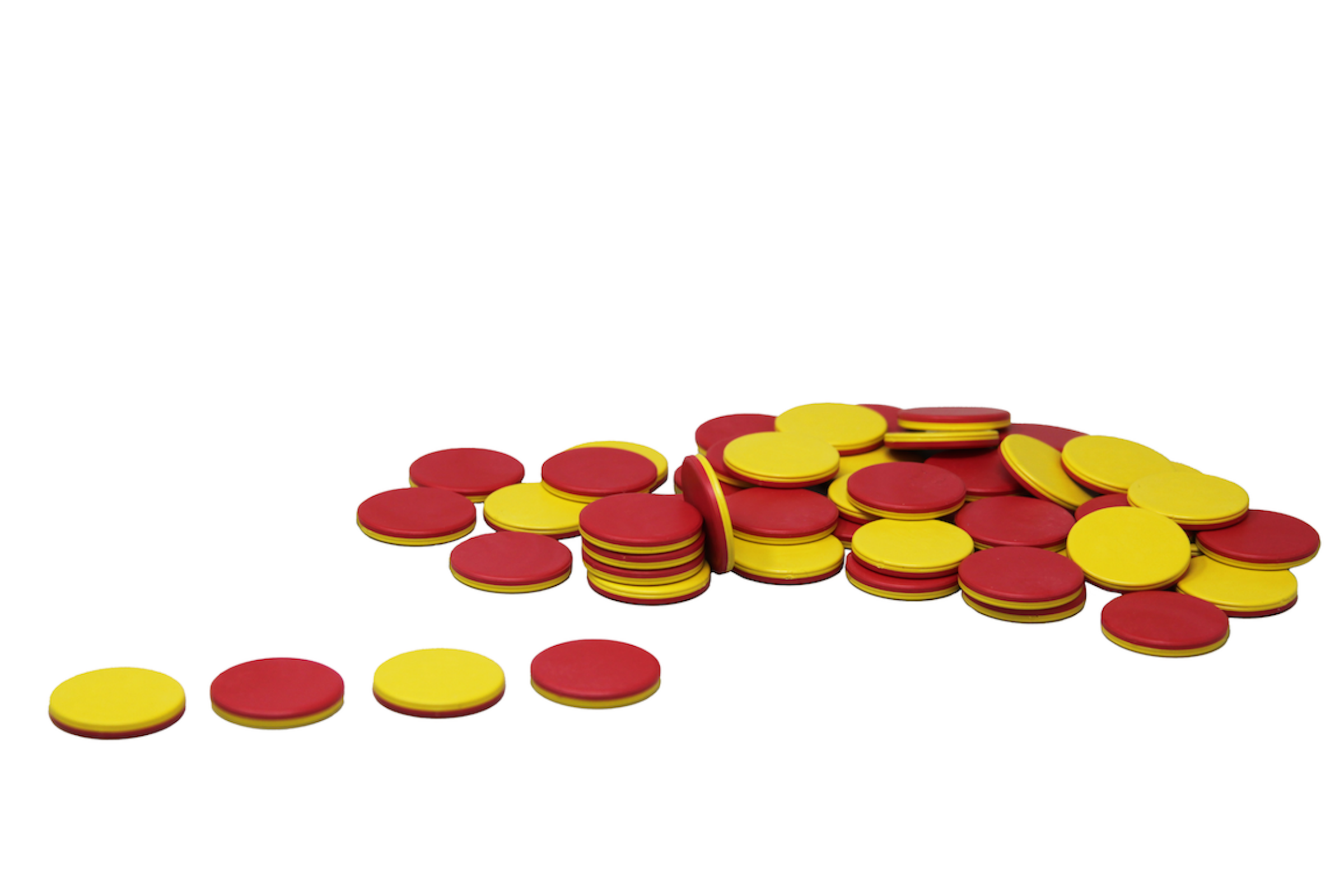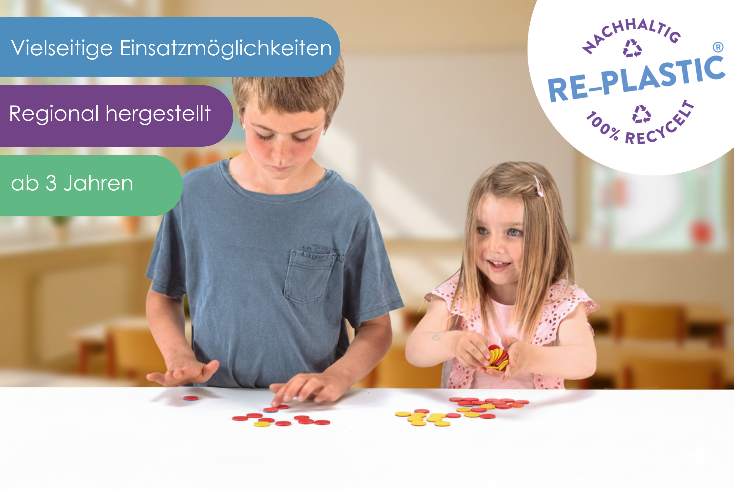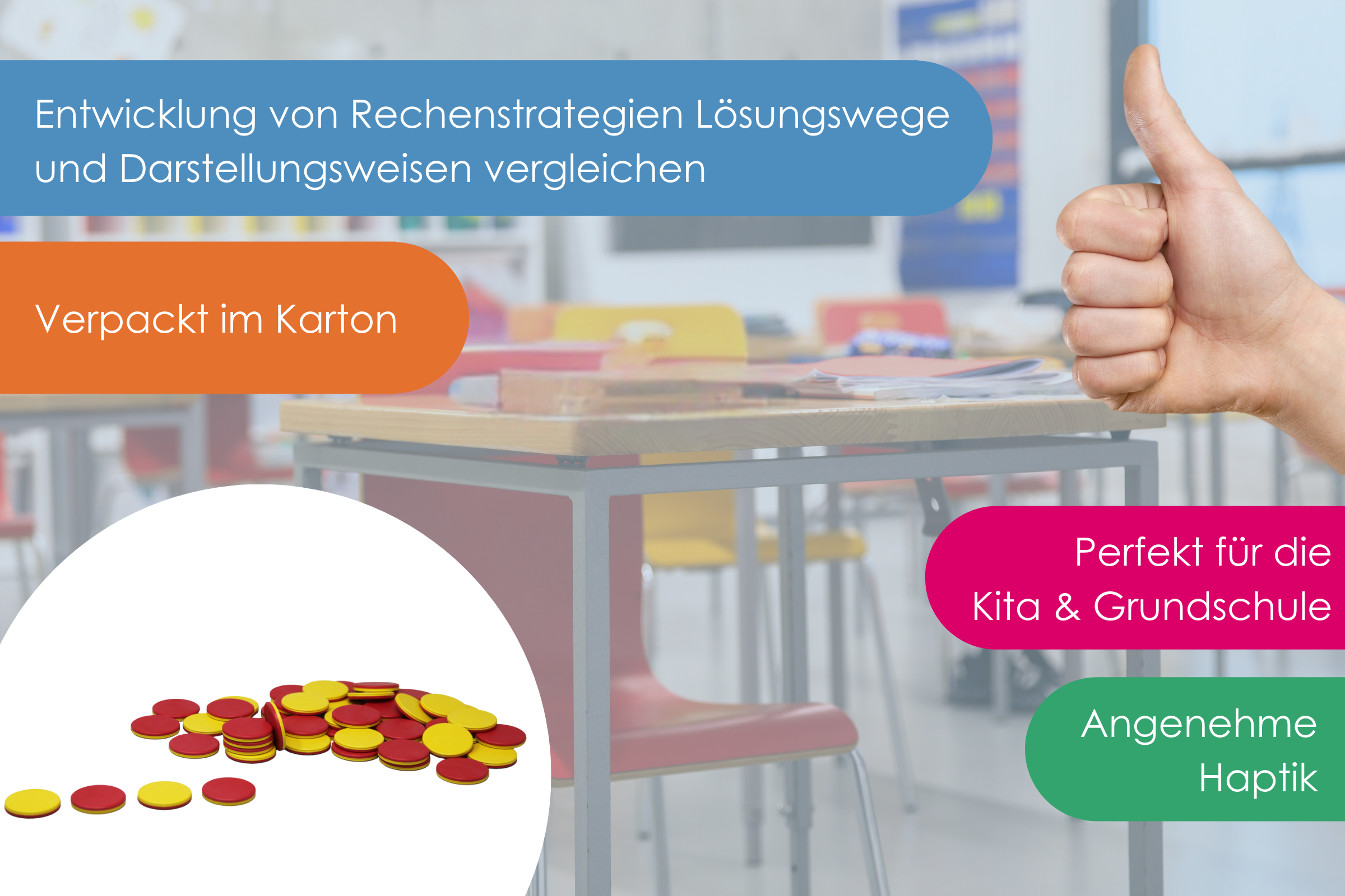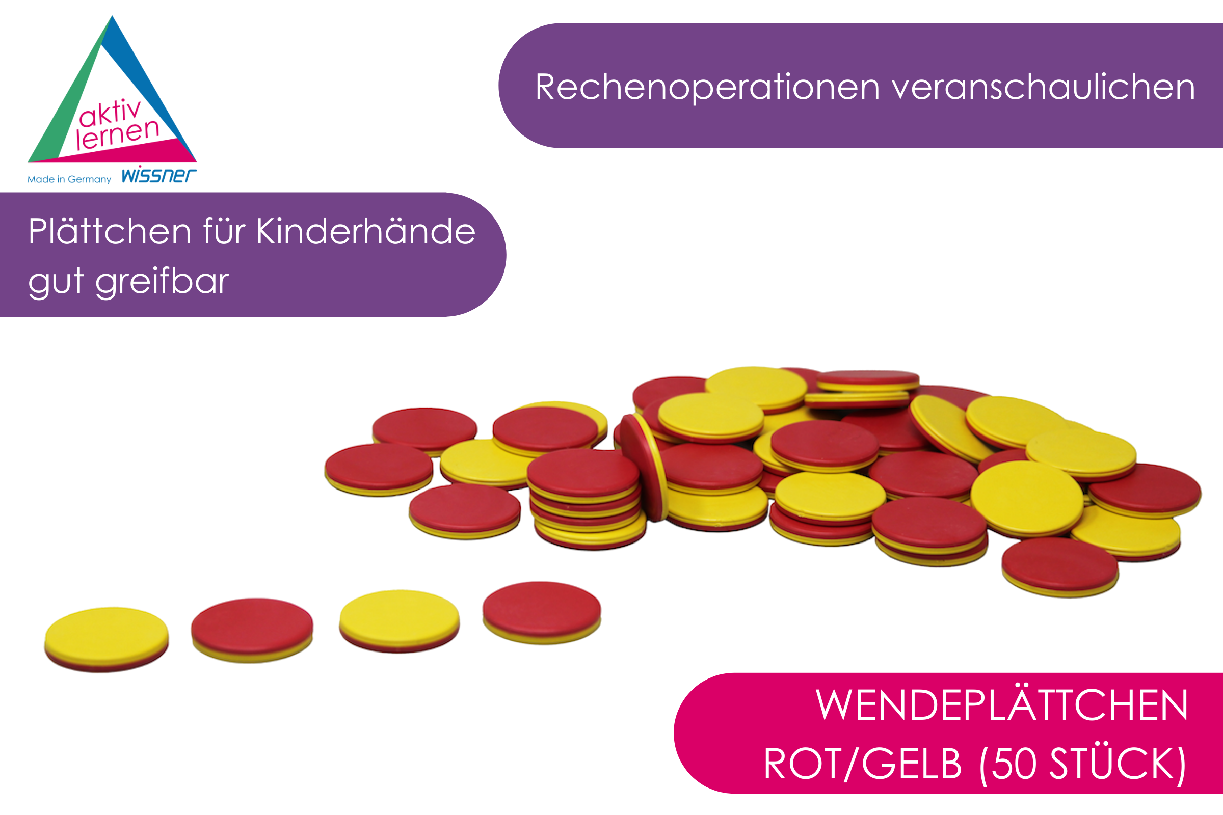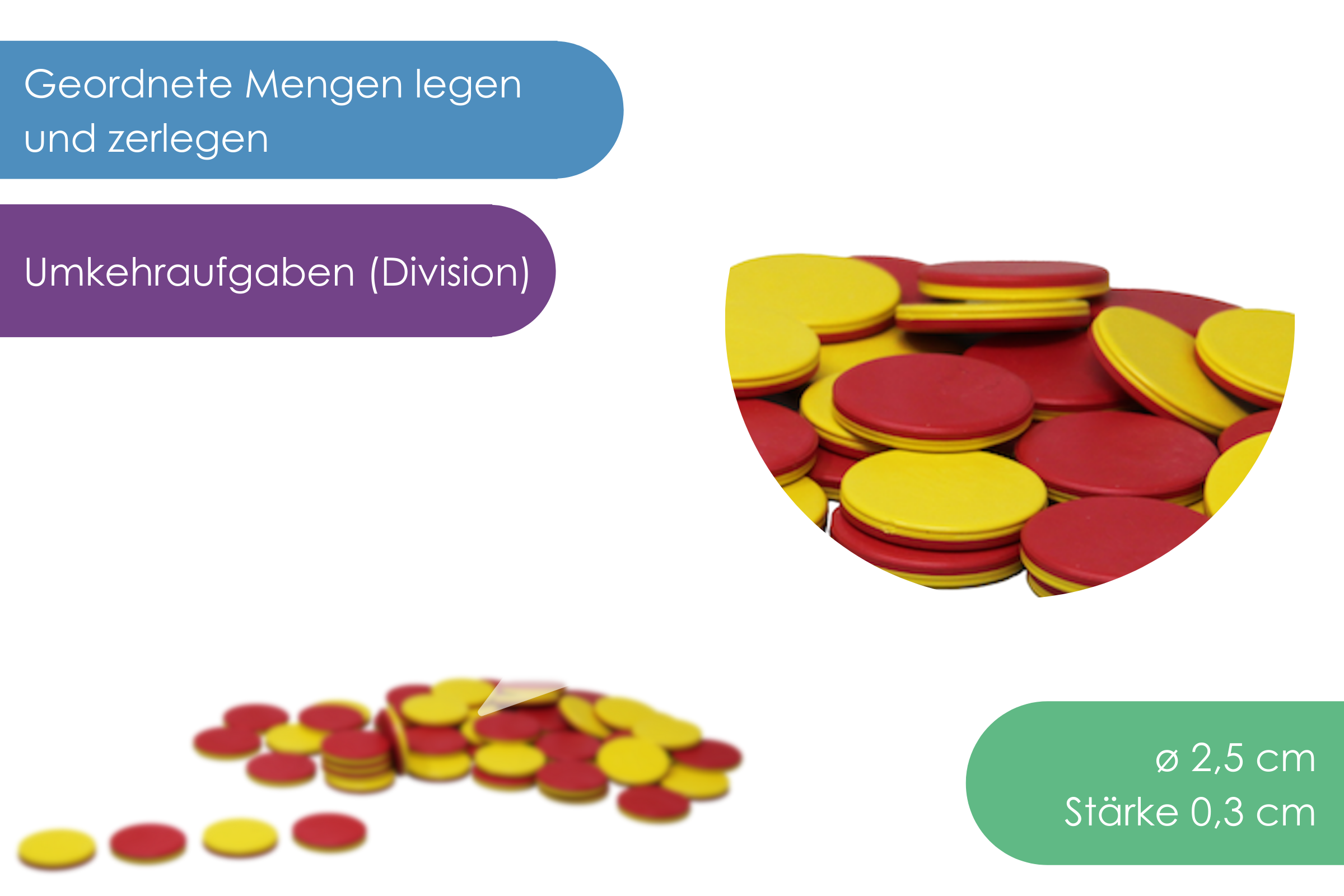 50 rot/gelbe WendeplättchenMit einem Durchmesser von 2,5 cm und einer Stärke von 0,3 cm sind die Plättchen für Kinderhände gut greifbar.