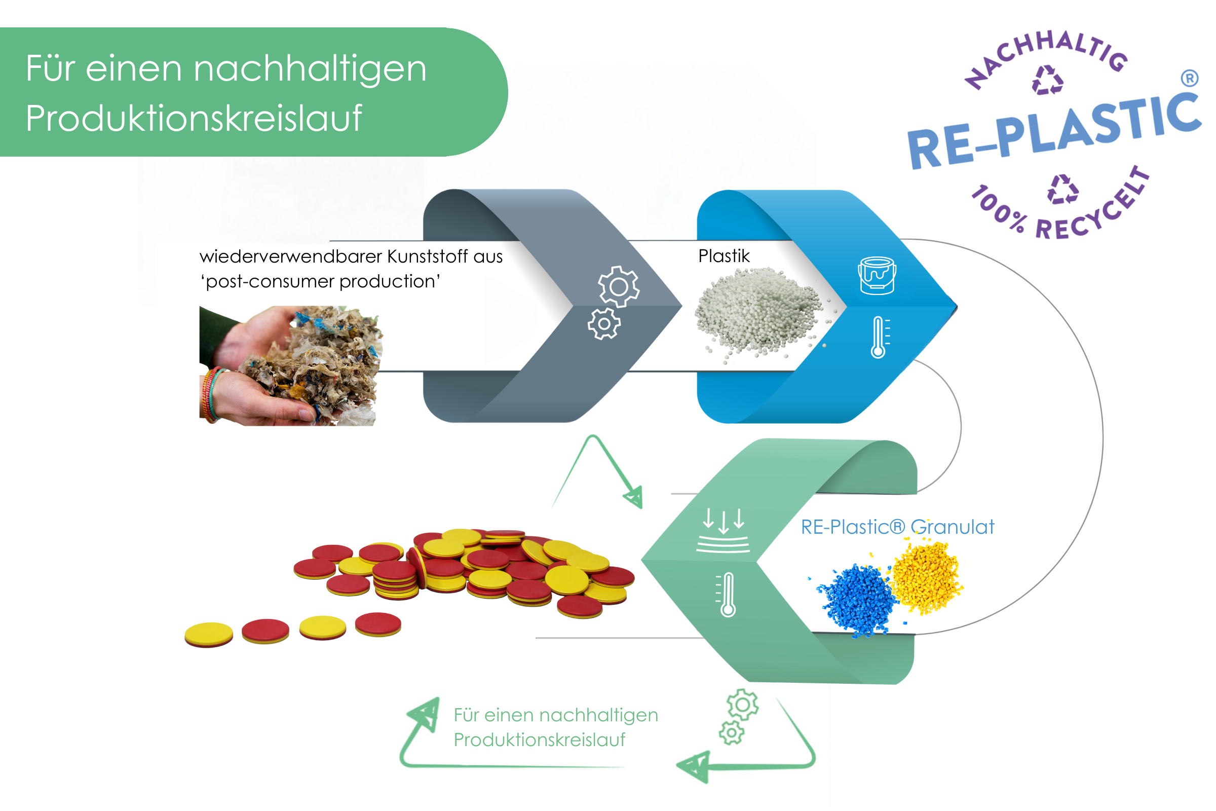 RE-Plastic ist 100% post-consumer-recycelter Kunstoff, der immer wieder zu 100% recycelbar ist.
