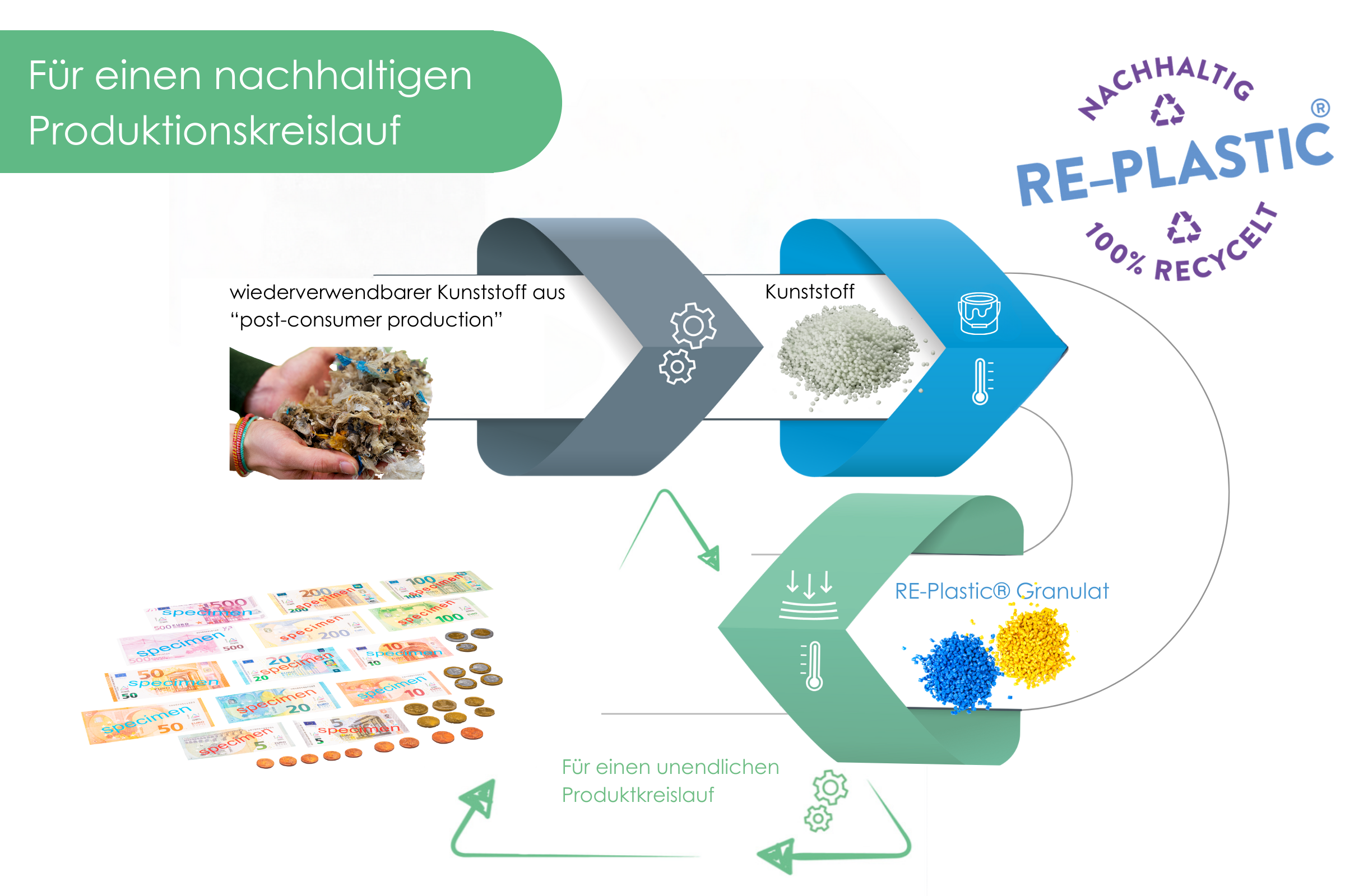 RE-Plastic ist 100% post-consumer-recycelter Kunstoff, der immer wieder zu 100% recycelbar ist.