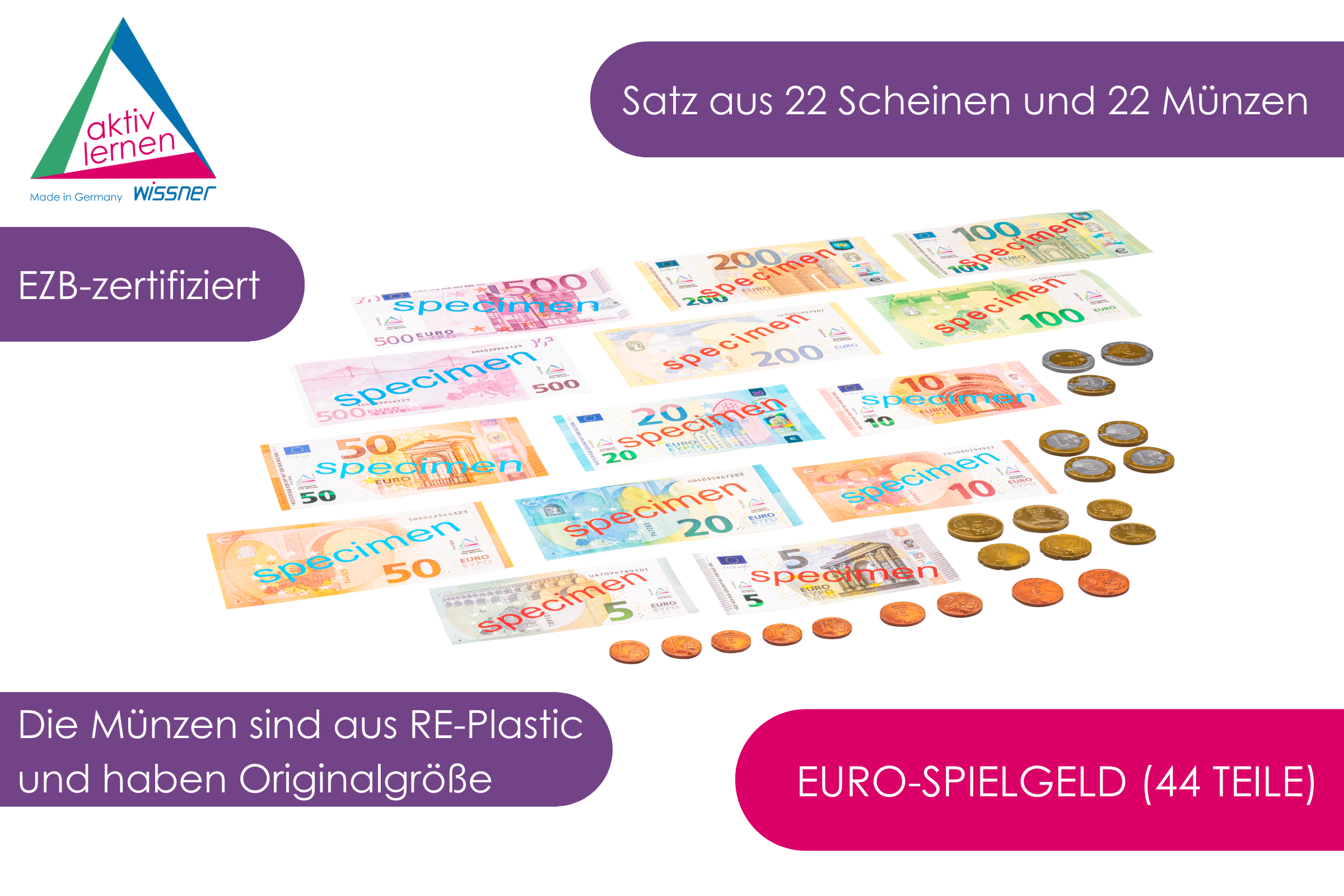 Satz aus 22 Scheinen (5 x 5€, 5 x 10€, 3 x 20€, 3 x 50€, 2 x 100€, 2 x 200€ und 2 x 500€) und 22 Münzen (5 x 1 Cent, je 2x 2, 5, 10, 20 und 50 Cent , 5 x 1€ und 2 x 2€).