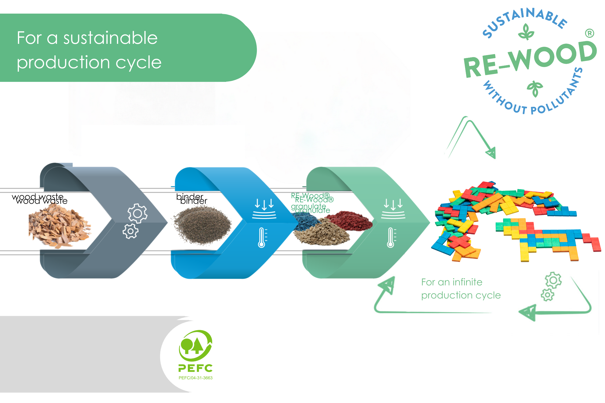 RE-Wood besteht zu 100% aus recycelten Materialien (bis zu 80% aus regionalen Holzabfällen), ist PEFC zertifiziert und nach Gebrauch immer wieder recycelbar.