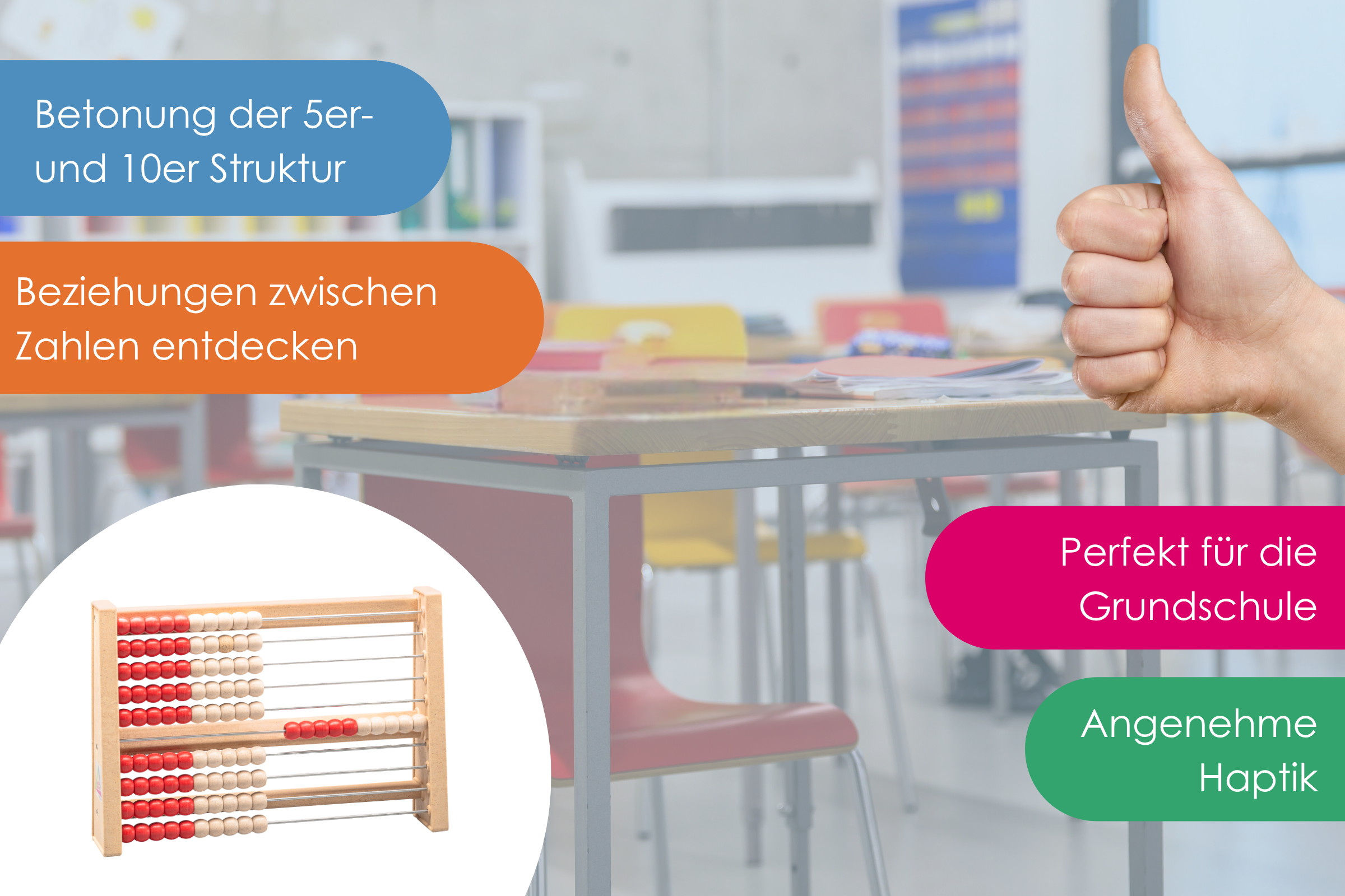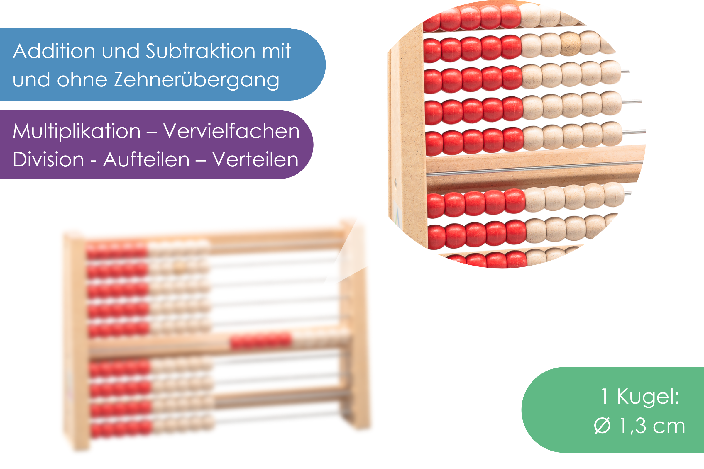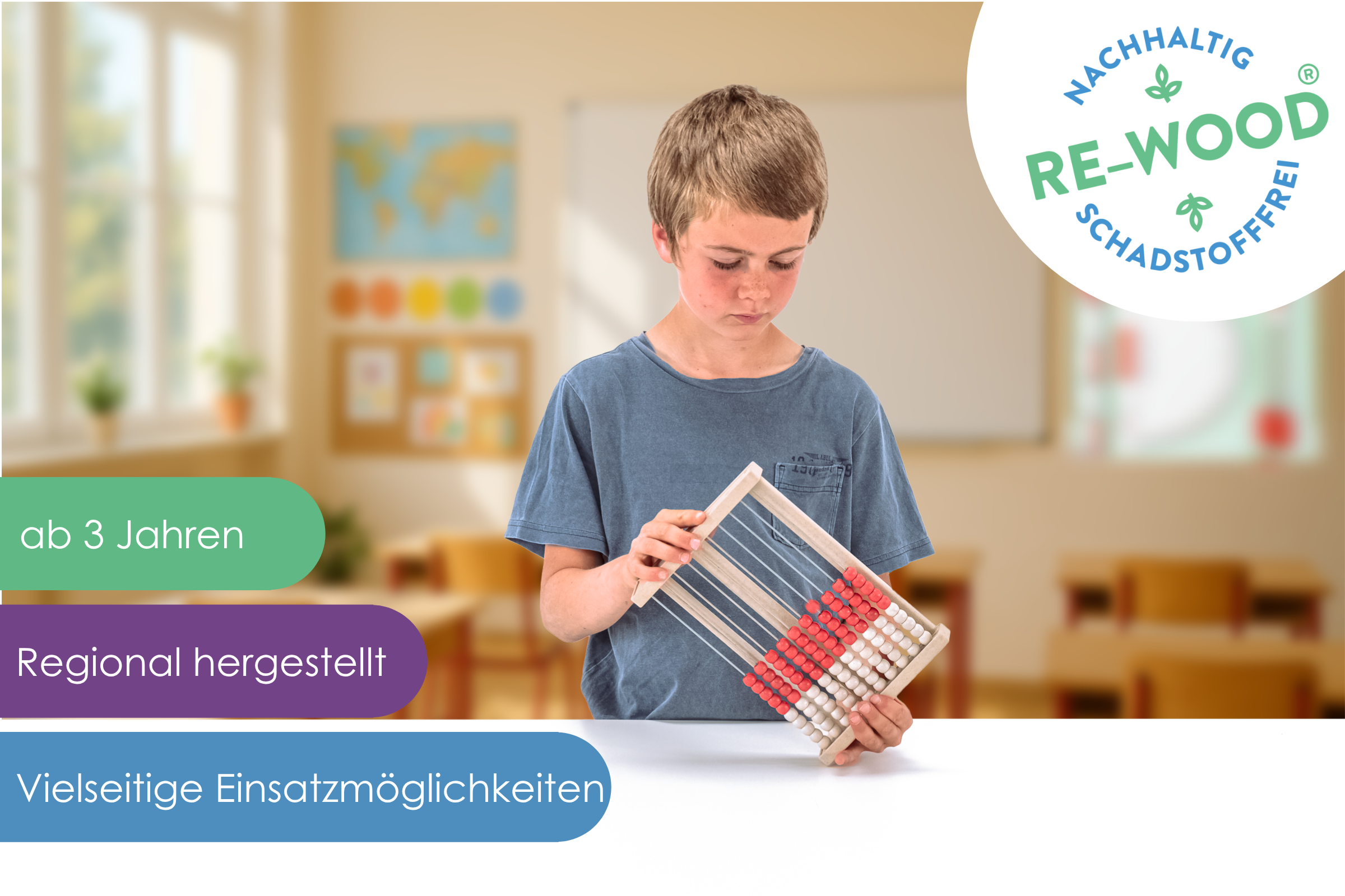 Unser Rechenrahmen 100 aus nachhaltigem RE-Wood® macht das Rechnen kinderleicht. Die rot-weiße 5er-Struktur hilft, den Zahlenraum bis 100 sicher zu erobern. Zahlen vergleichen, Addieren mit Zehnerübergang, Subtrahieren, Multiplizieren, Dividieren, Vorgänger/Nachfolger erkennen, doppelt/halb, Vielfache & Teiler nutzen – mit Fokus auf 5er- und 10er-Struktur.