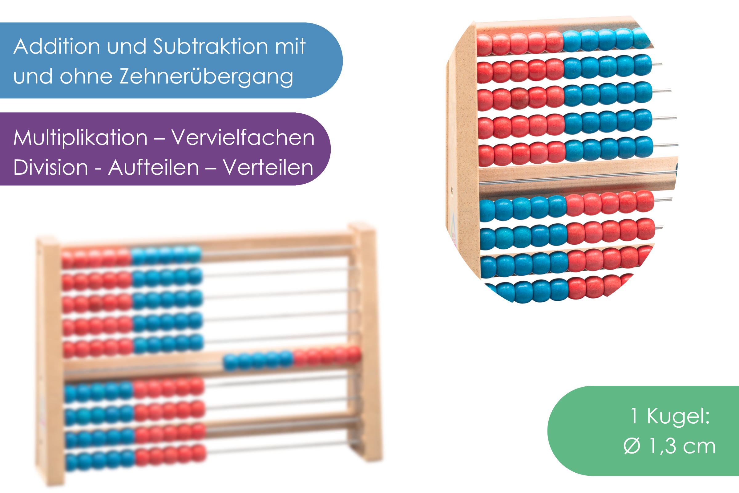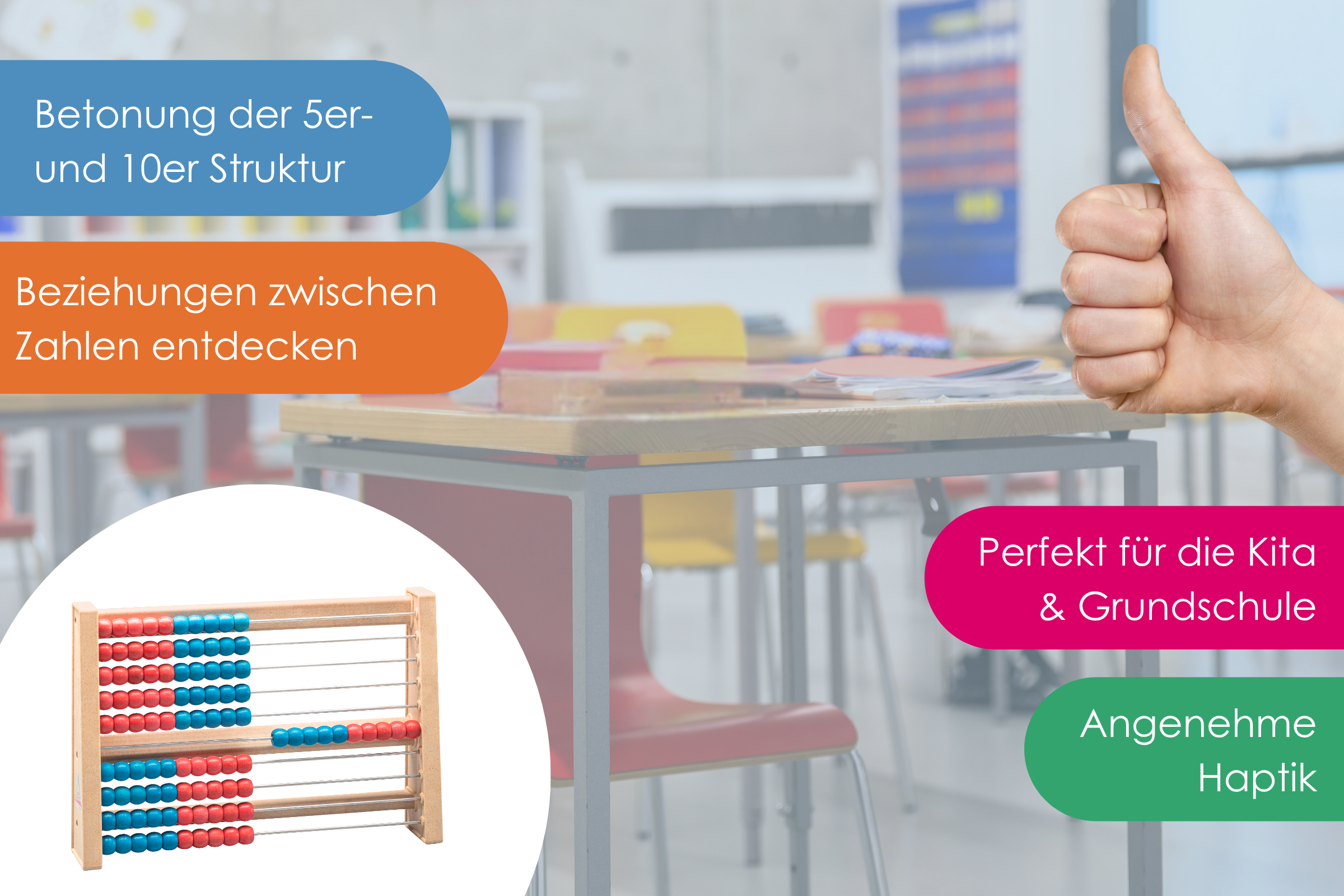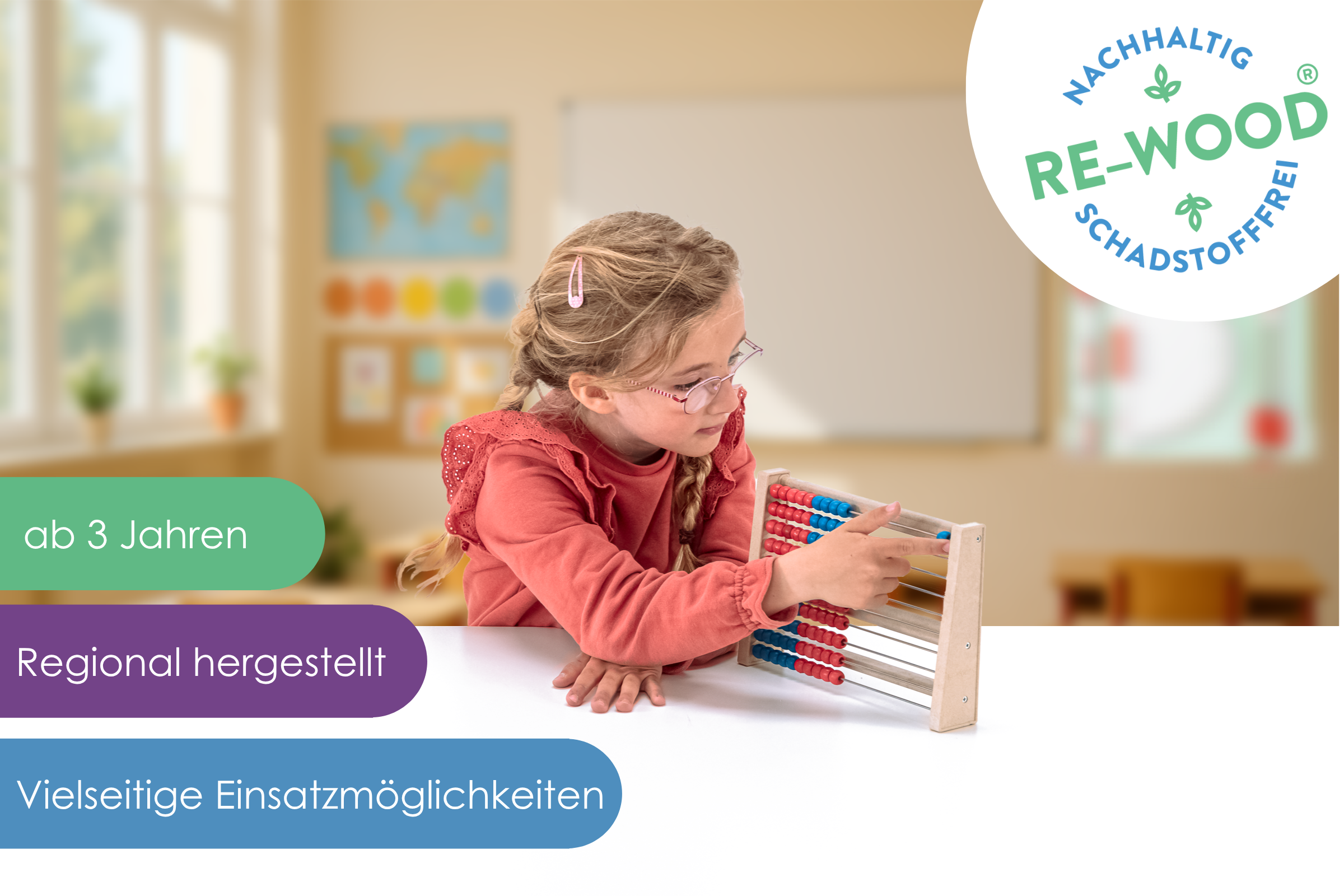 Unser Rechenrahmen 100 aus nachhaltigem RE-Wood® macht das Rechnen kinderleicht. Die rot-blaue 5er-Struktur hilft, den Zahlenraum bis 100 sicher zu erobern. Zahlen vergleichen, Addieren mit Zehnerübergang, Subtrahieren, Multiplizieren, Dividieren, Vorgänger/Nachfolger erkennen, doppelt/halb, Vielfache & Teiler nutzen – mit Fokus auf 5er- und 10er-Struktur.
