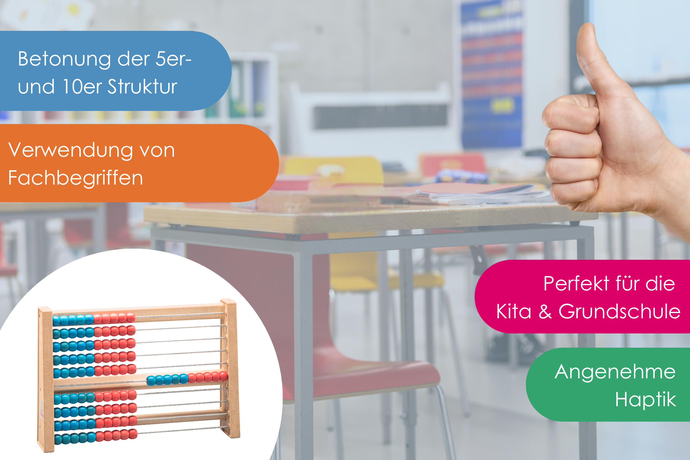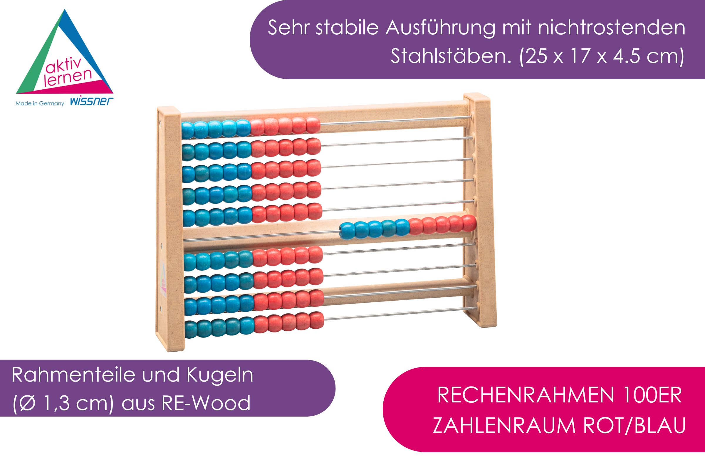 Unser Rechenrahmen 100 aus nachhaltigem RE-Wood® macht das Rechnen kinderleicht. Die rot-blaue 5er-Struktur hilft, den Zahlenraum bis 100 sicher zu erobern. Zahlen vergleichen, Addieren mit Zehnerübergang, Subtrahieren, Multiplizieren, Dividieren, Vorgänger/Nachfolger erkennen, doppelt/halb, Vielfache & Teiler nutzen – mit Fokus auf 5er- und 10er-Struktur.