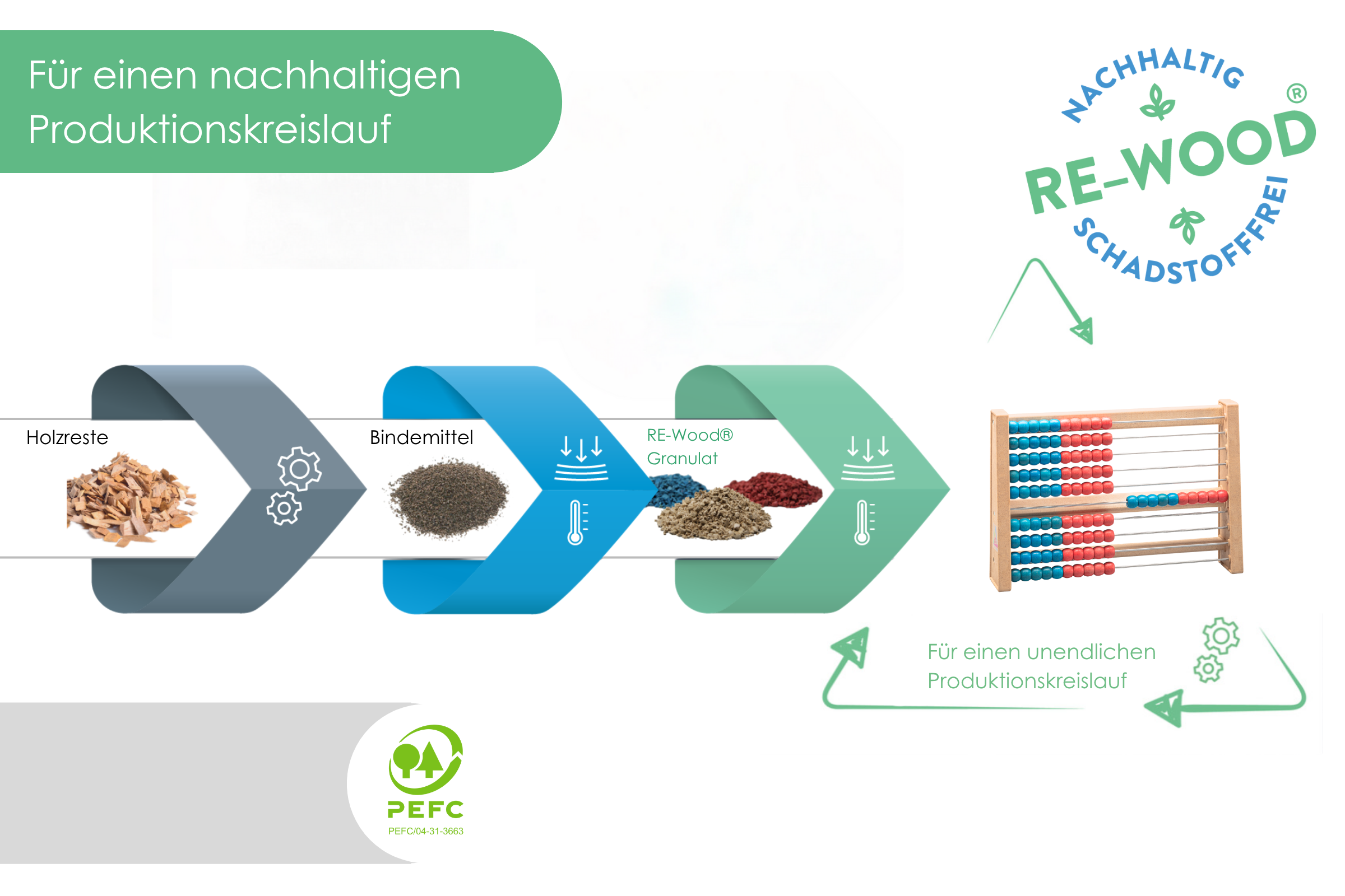 RE-Wood besteht zu 100% aus recycelten Materialien (bis zu 80% aus regionalen Holzabfällen), ist PEFC zertifiziert und nach Gebrauch immer wieder recycelbar.