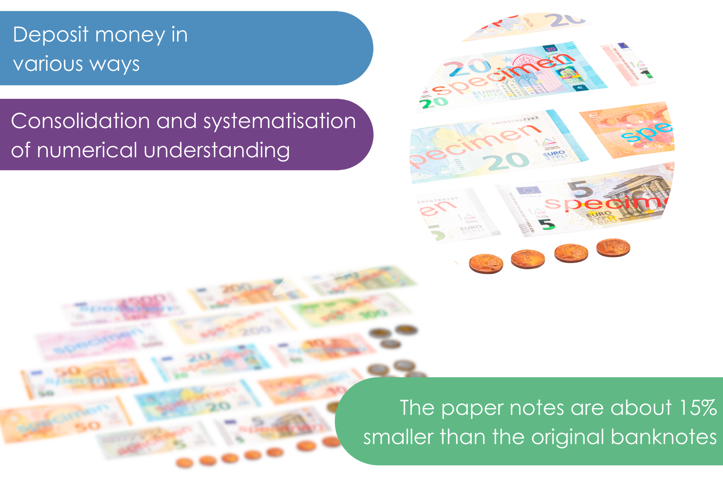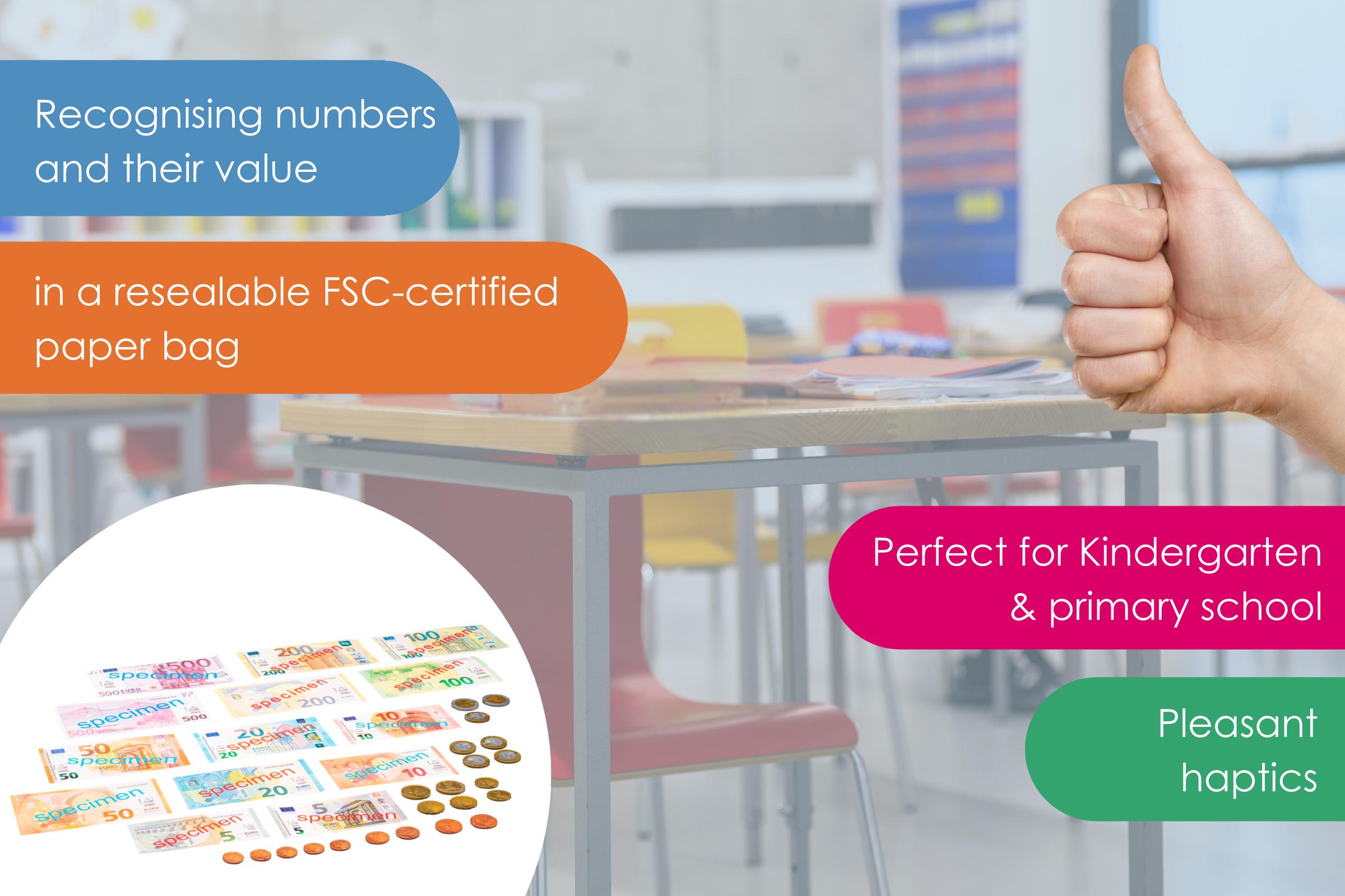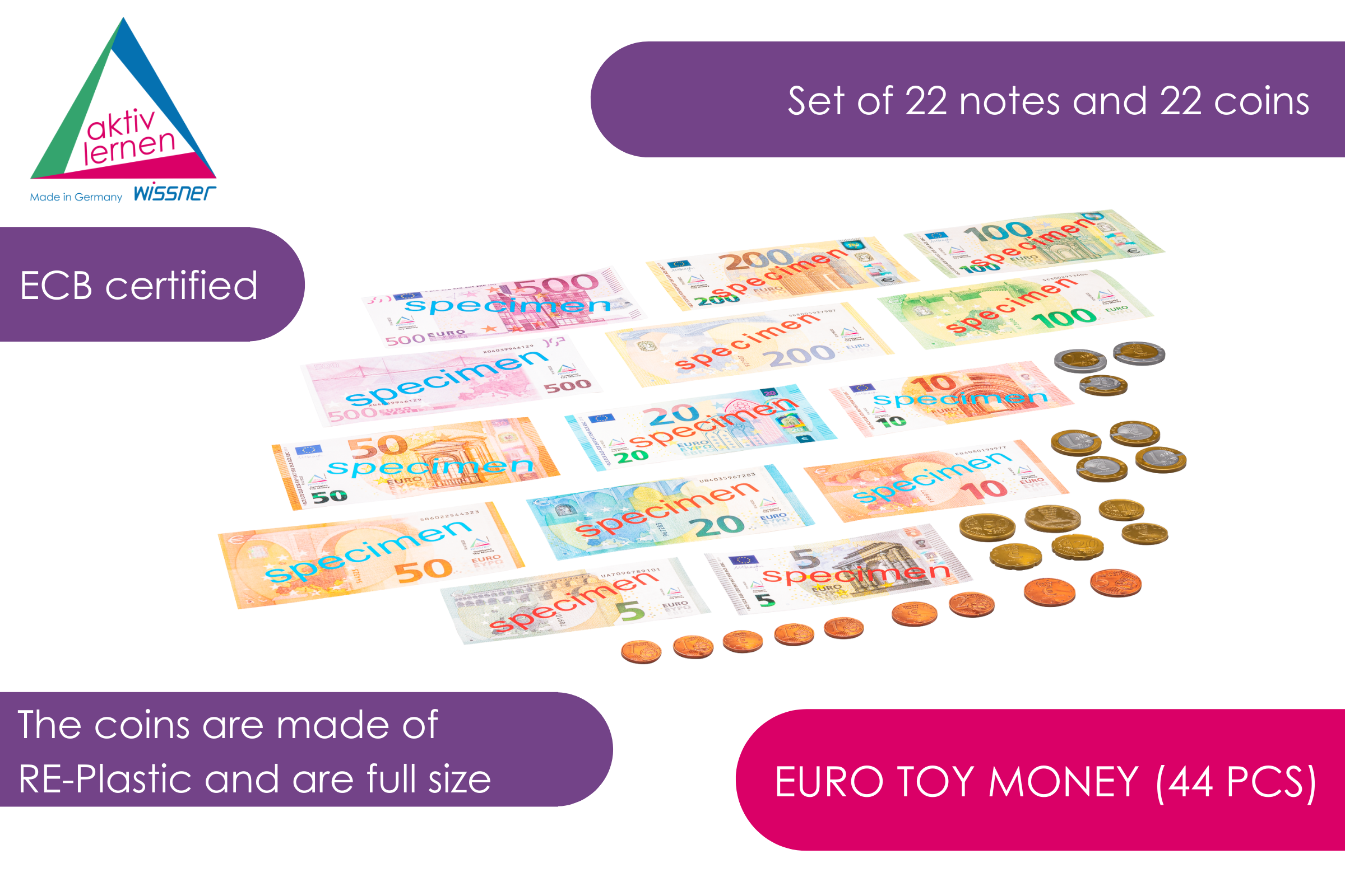 Set of 22 banknotes (5 x 5€, 5 x 10€, 3 x 20€, 3 x 50€, 2 x 100€, 2 x 200€ and 2 x 500€) and 22 coins (5 x 1 cent, 2x each 2, 5, 10, 20 and 50 cents , 5 x 1€ and 2 x 2€).