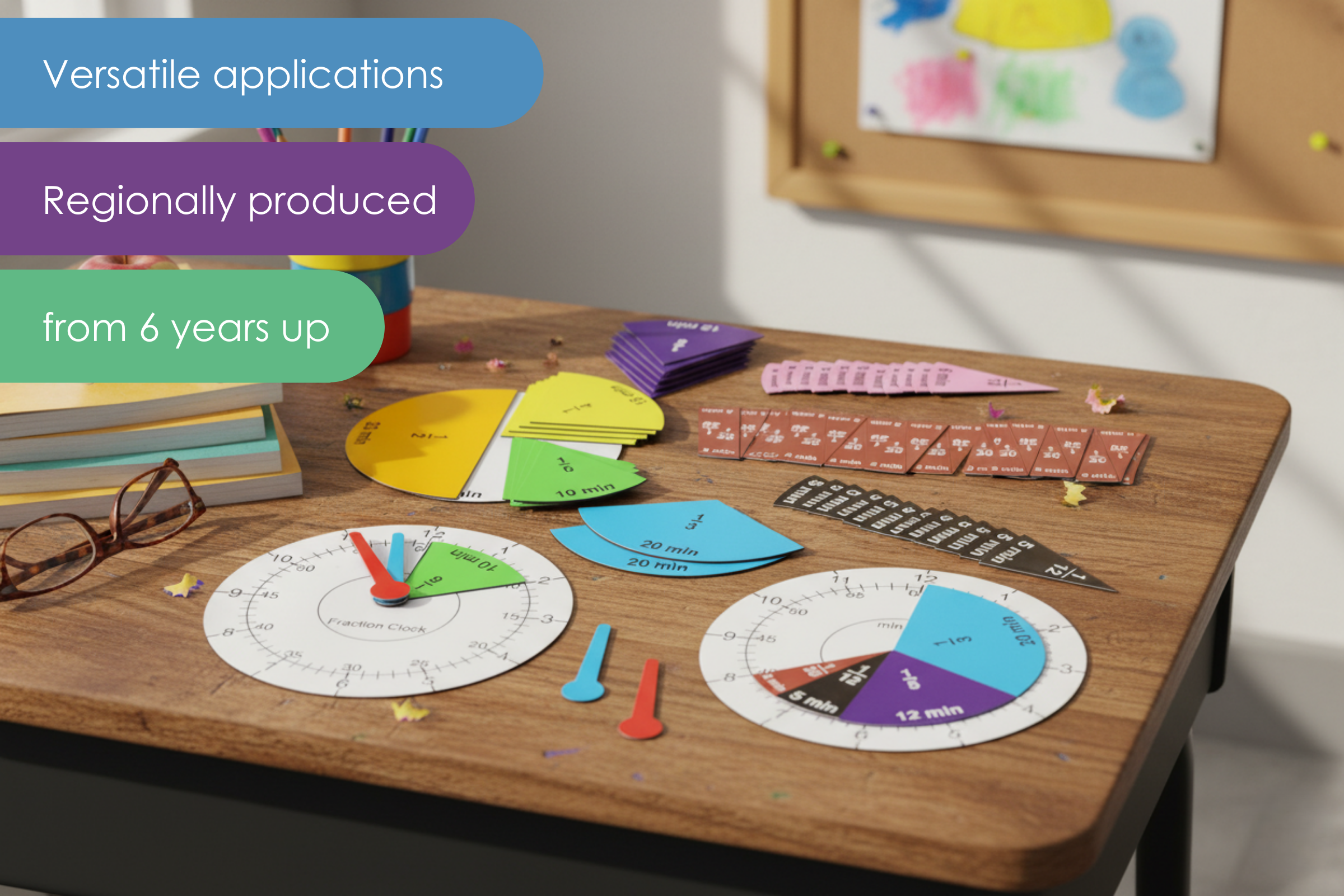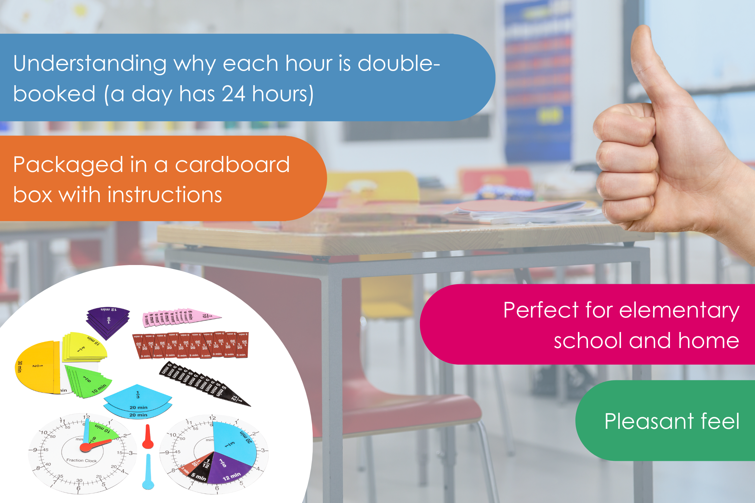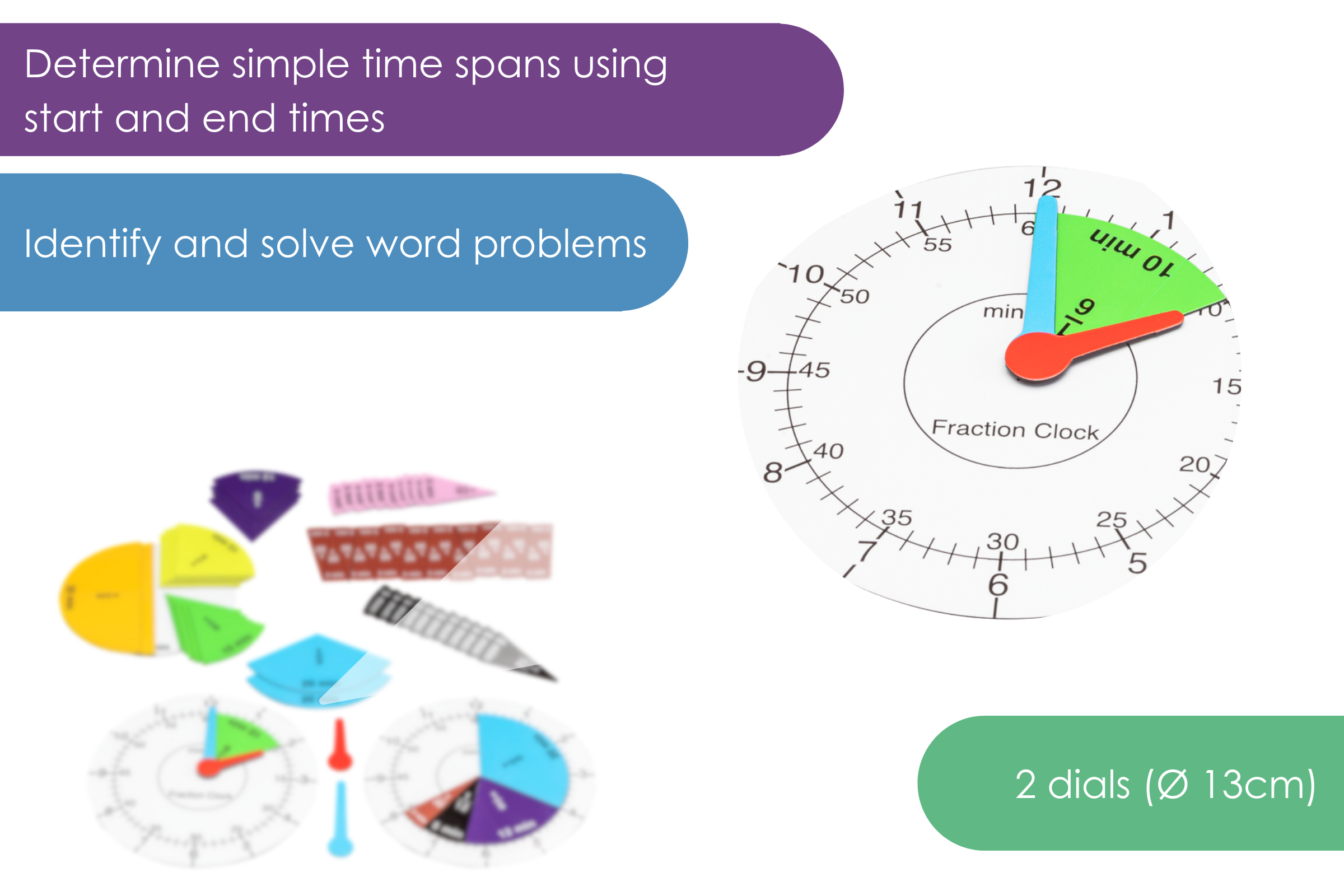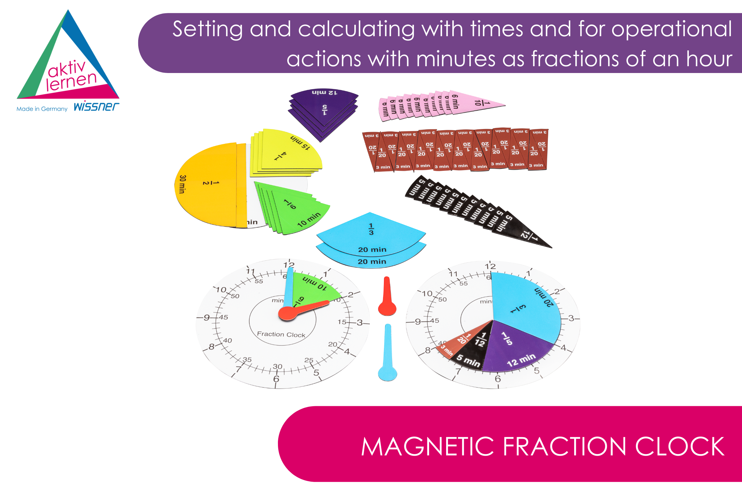 2 dials (Ø 13cm) and magnetic additional material for reading, adjusting and calculation with times and for the operational trading with minutes as fractions of an hour.