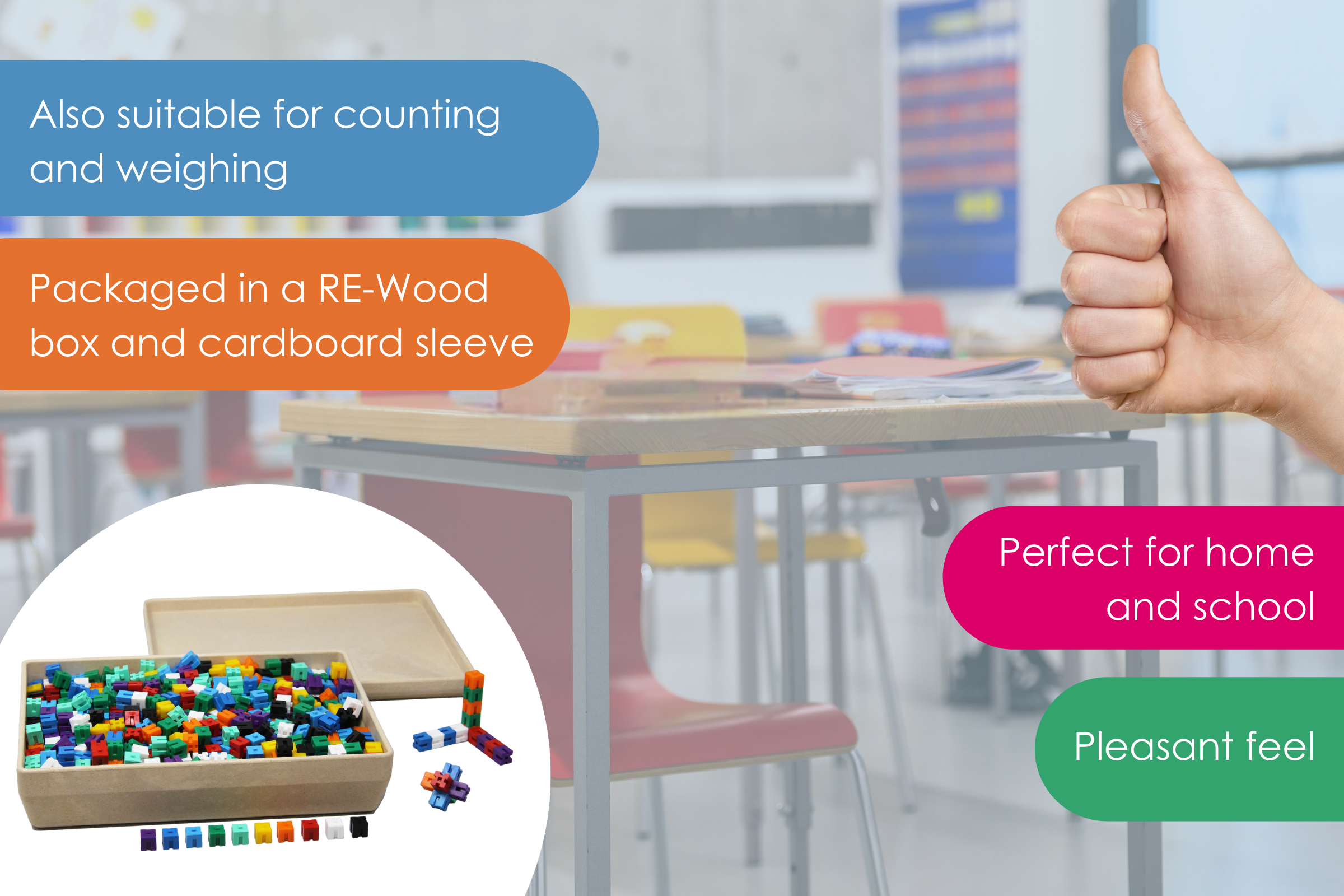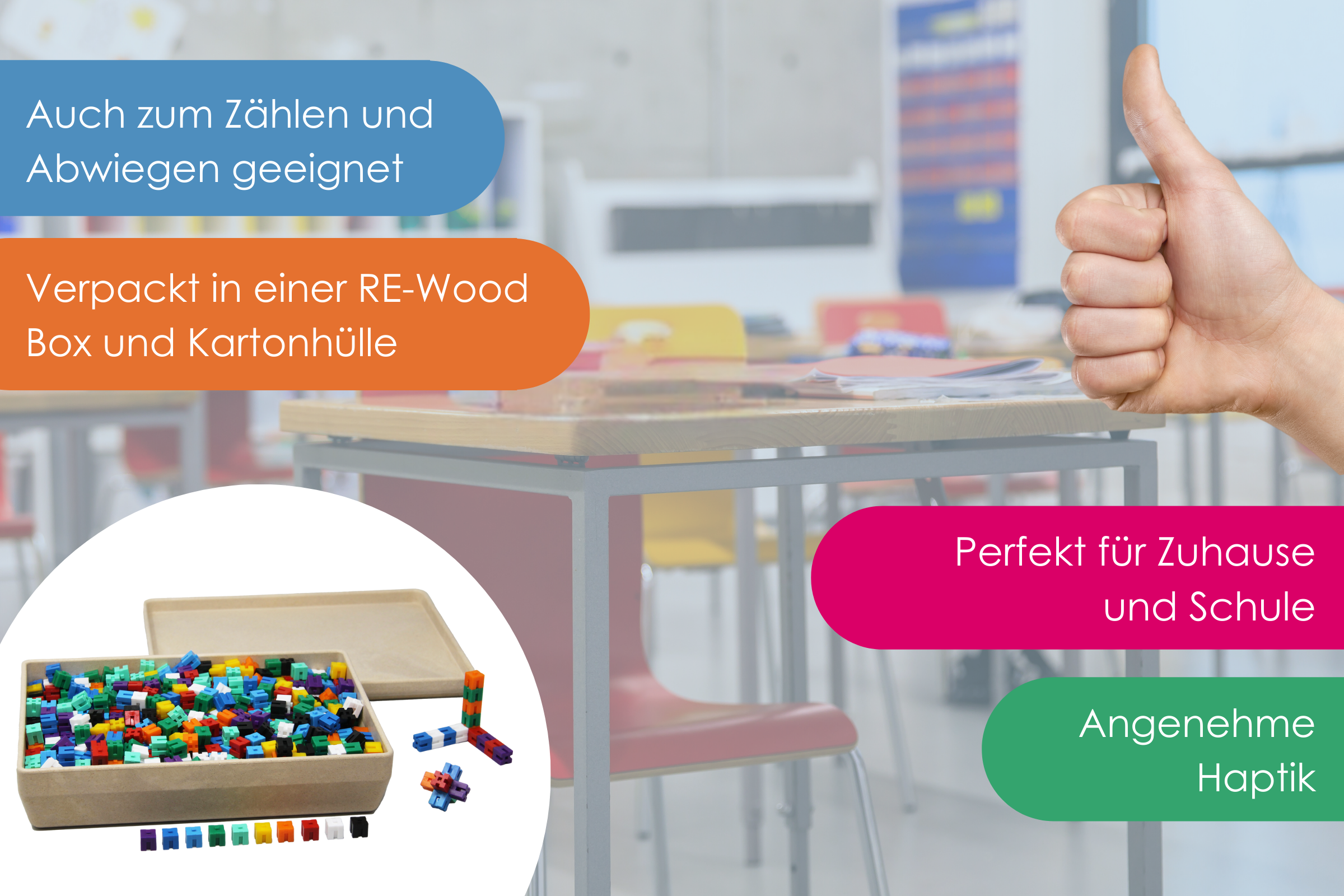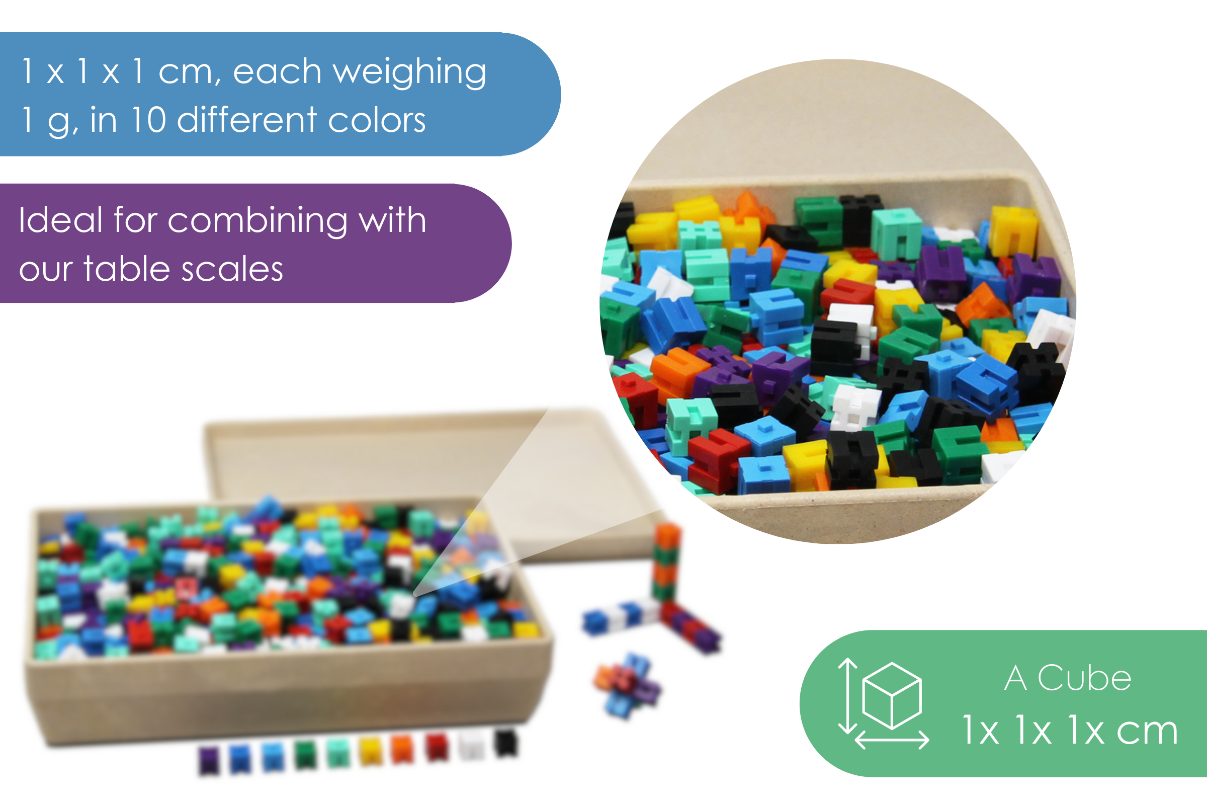 Can be ideally combined with our balances, as each cube weighs exactly 1 g and is 1 cubic centimeter in size.