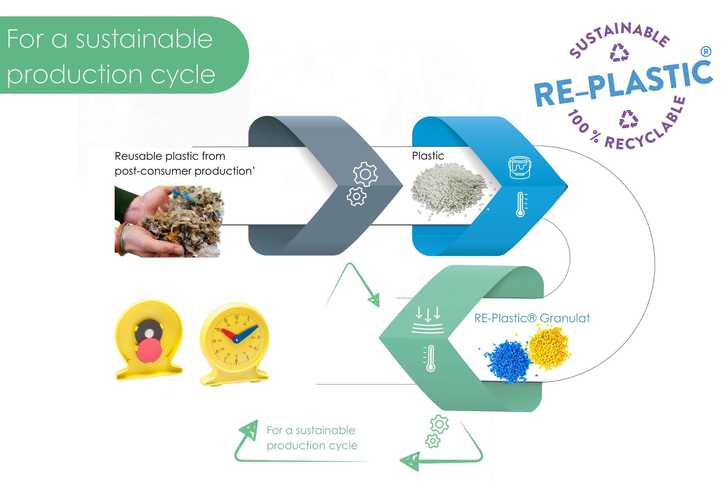 RE-Plastic is 100% post-consumer recycled plastic which is 100% recyclable again.