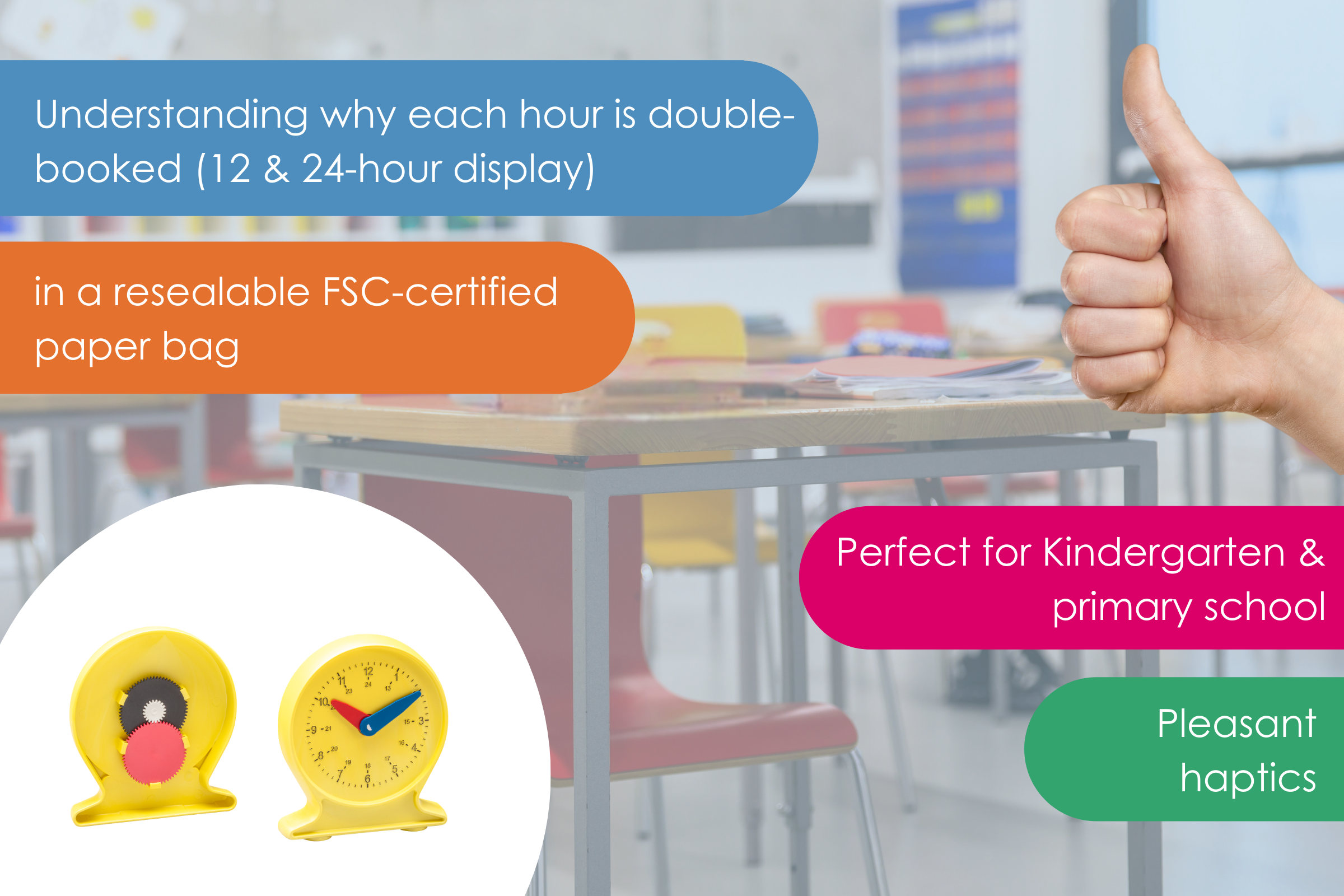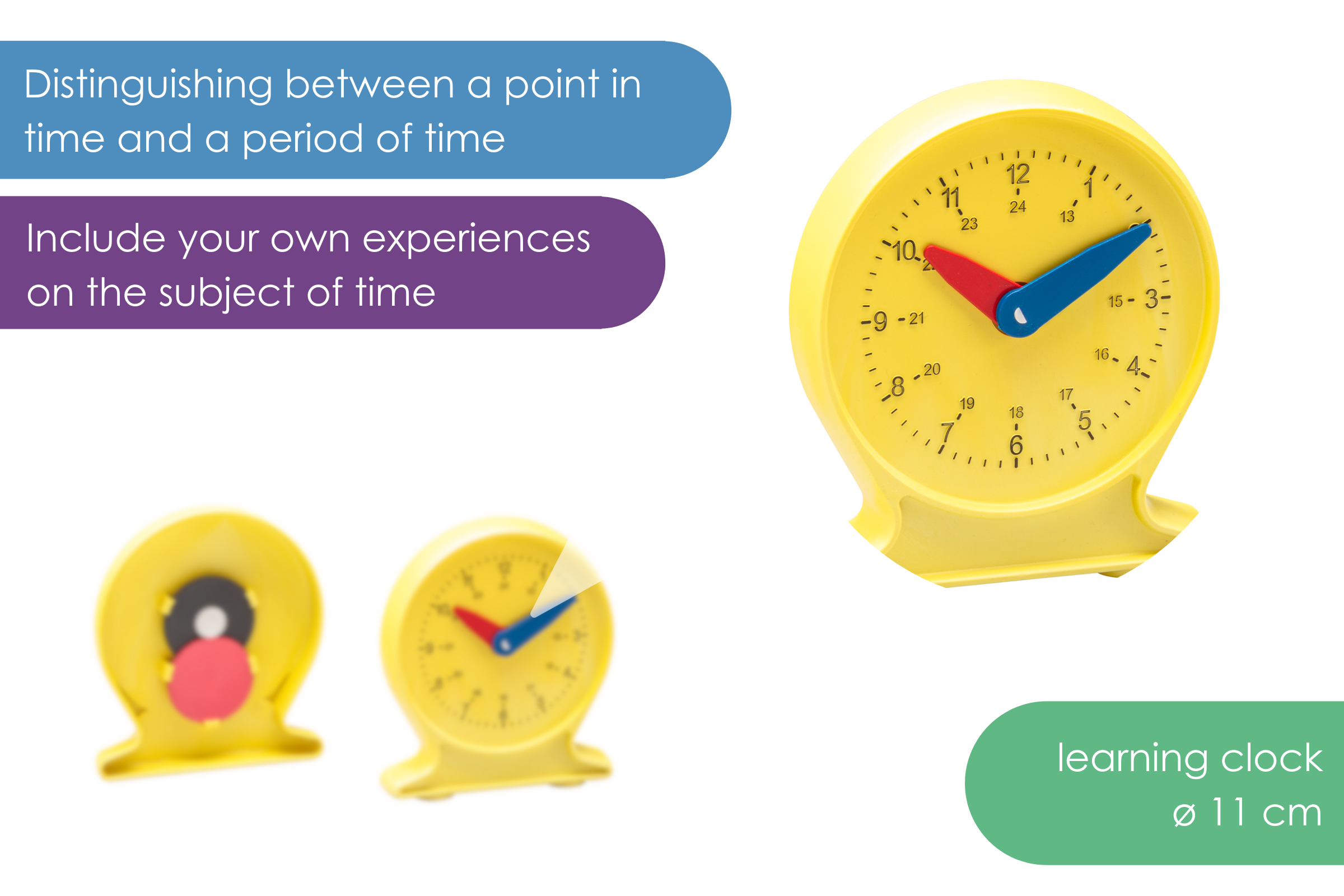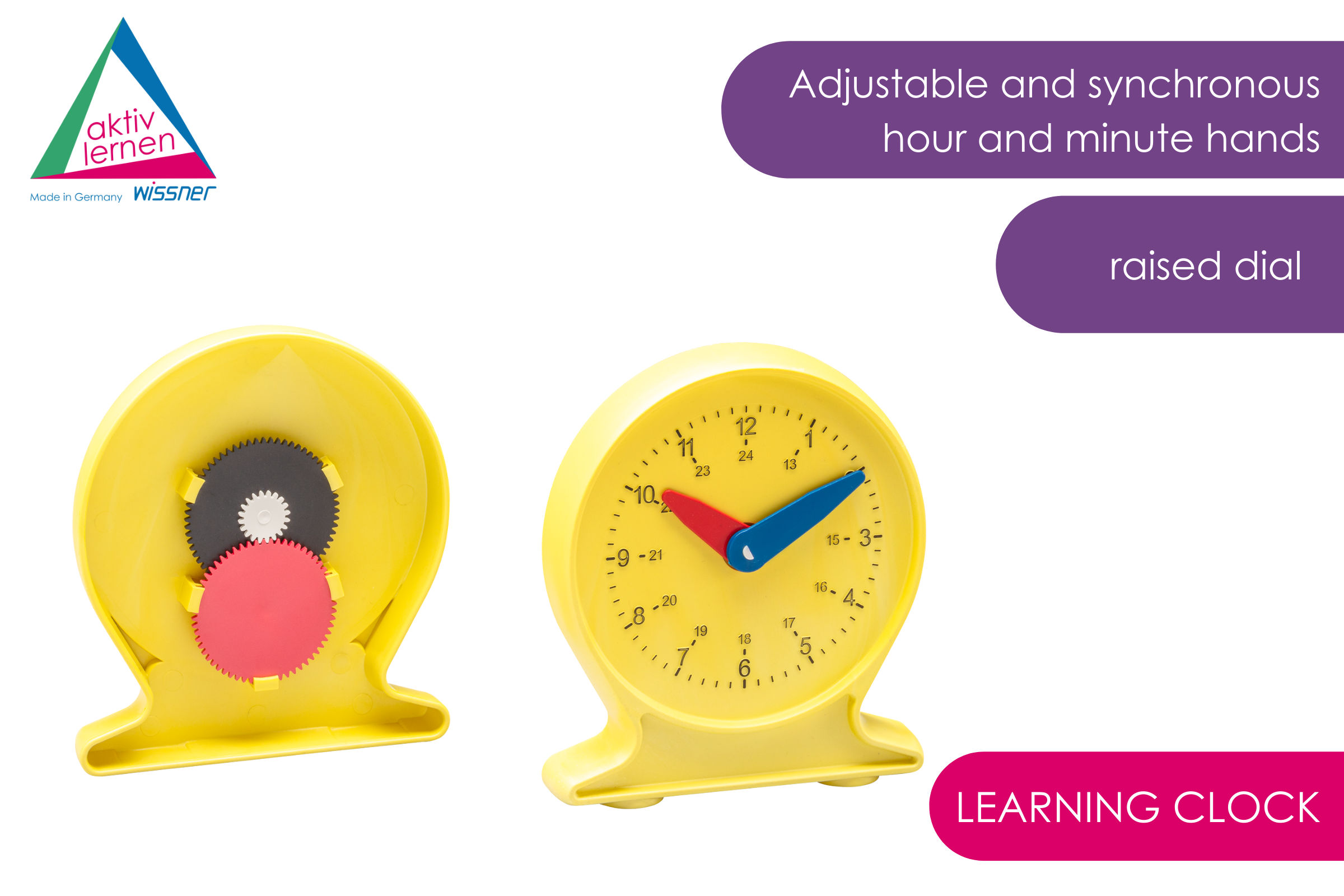 Learning clock (ø 10cm) made of RE-Plastic with embossed dial as well as adjustable and synchronized hour and minute hands.
