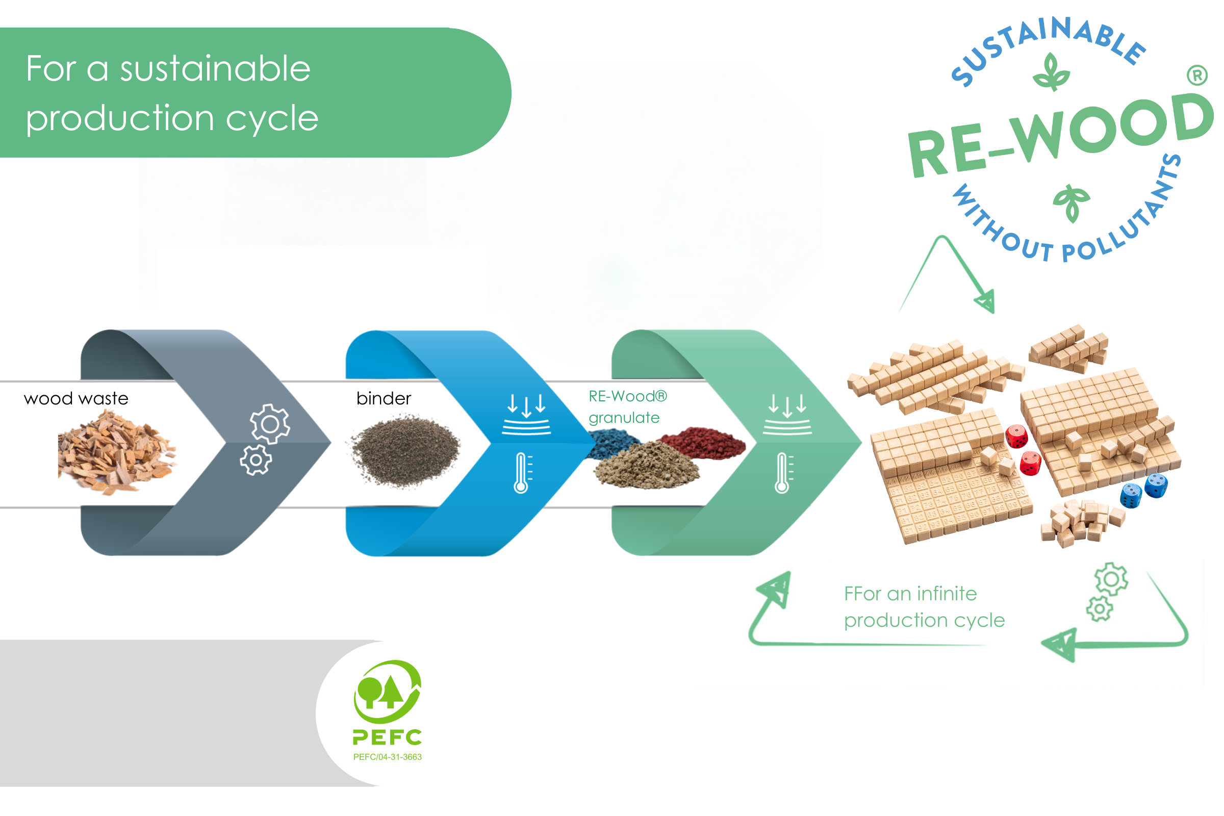 RE-Wood is made from 100% recycled materials (up to 80% from regional wood waste), PEFC certified and can be recycled again and again after use.