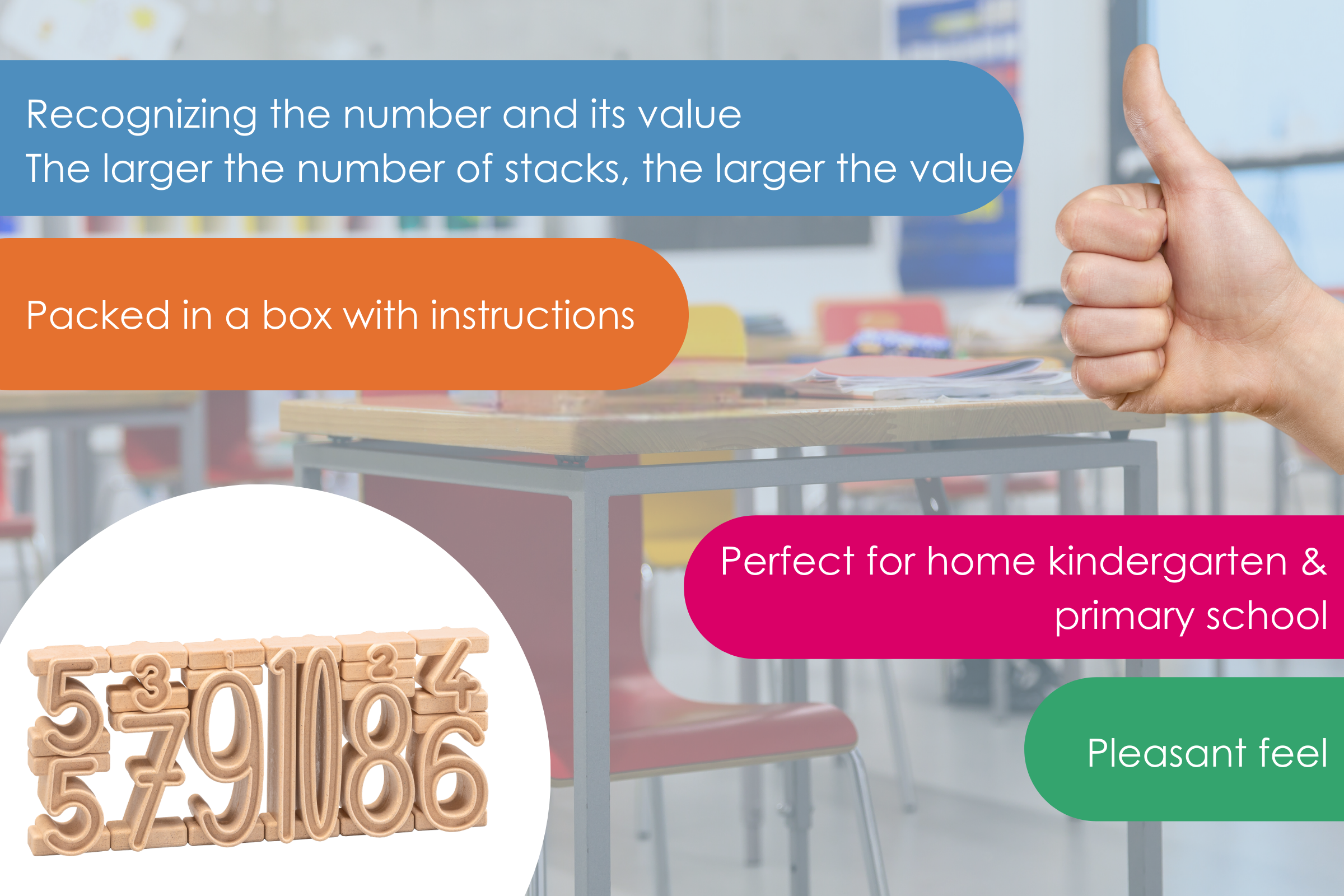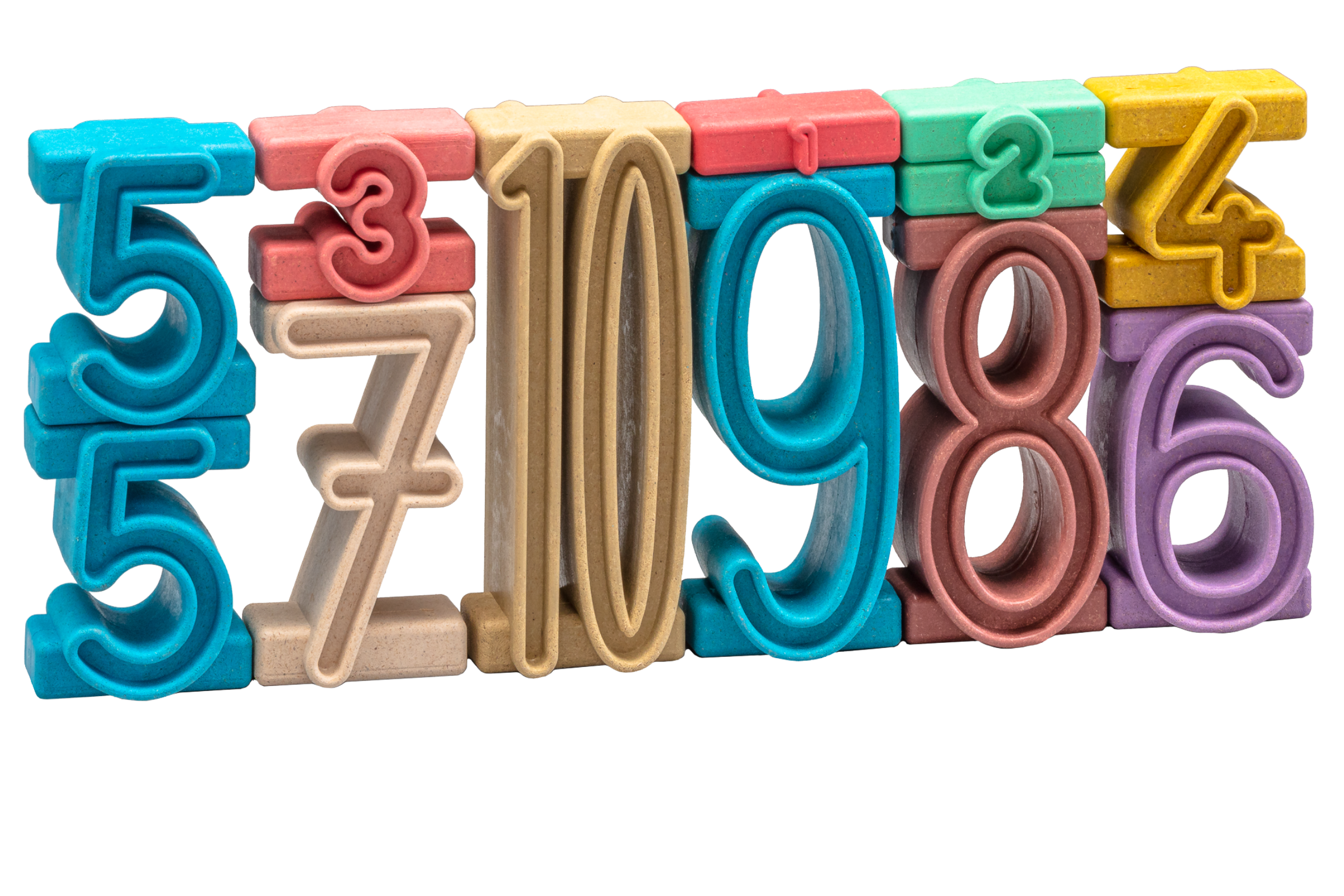 The value of the stacking numbers (made from solid material) corresponds to the height in centimeters. All numbers are 4 cm wide and 3 cm deep.