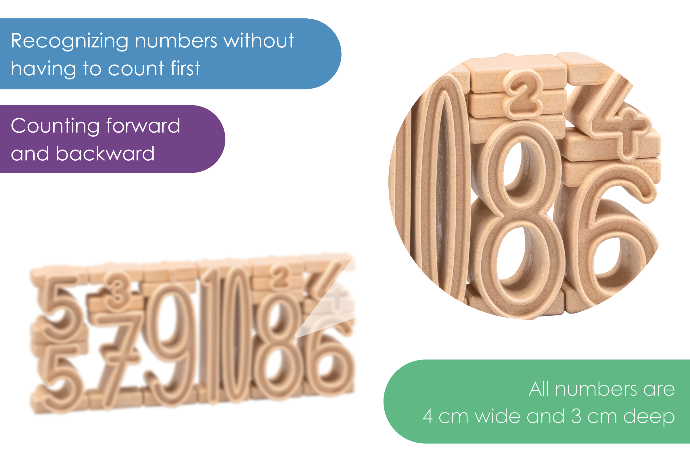 The value of the stacking numbers (made from solid material) corresponds to the height in centimeters.