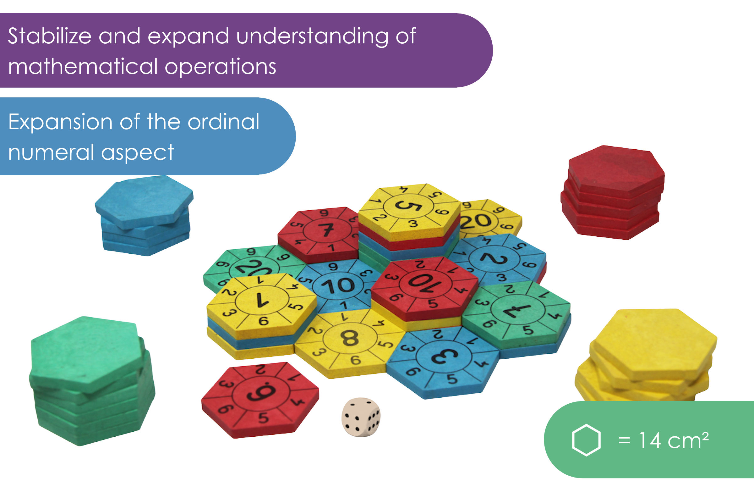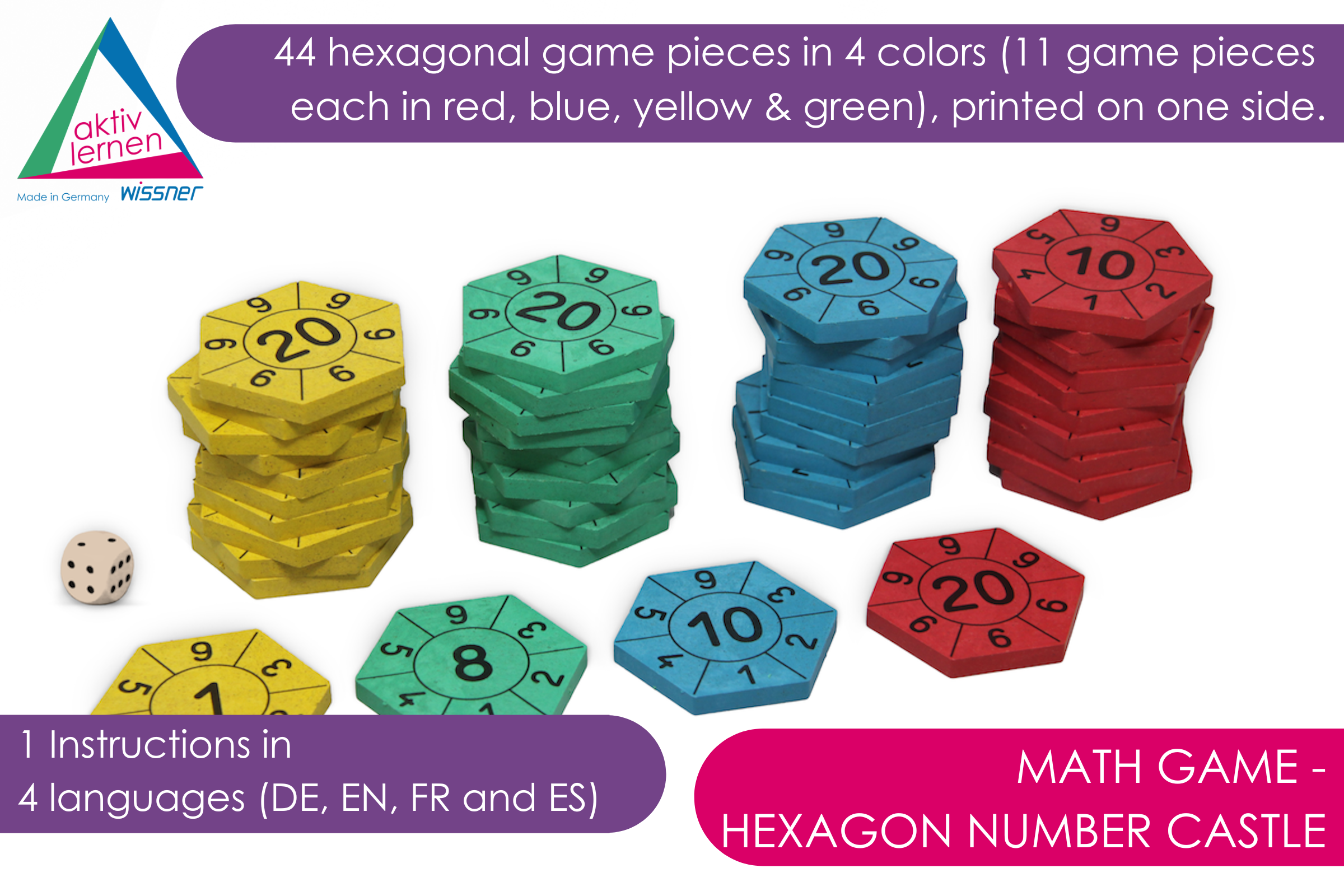 44 hexagonal game pieces in 4 colors (11 pieces each in red, blue, yellow and green) printed on one side1 dice