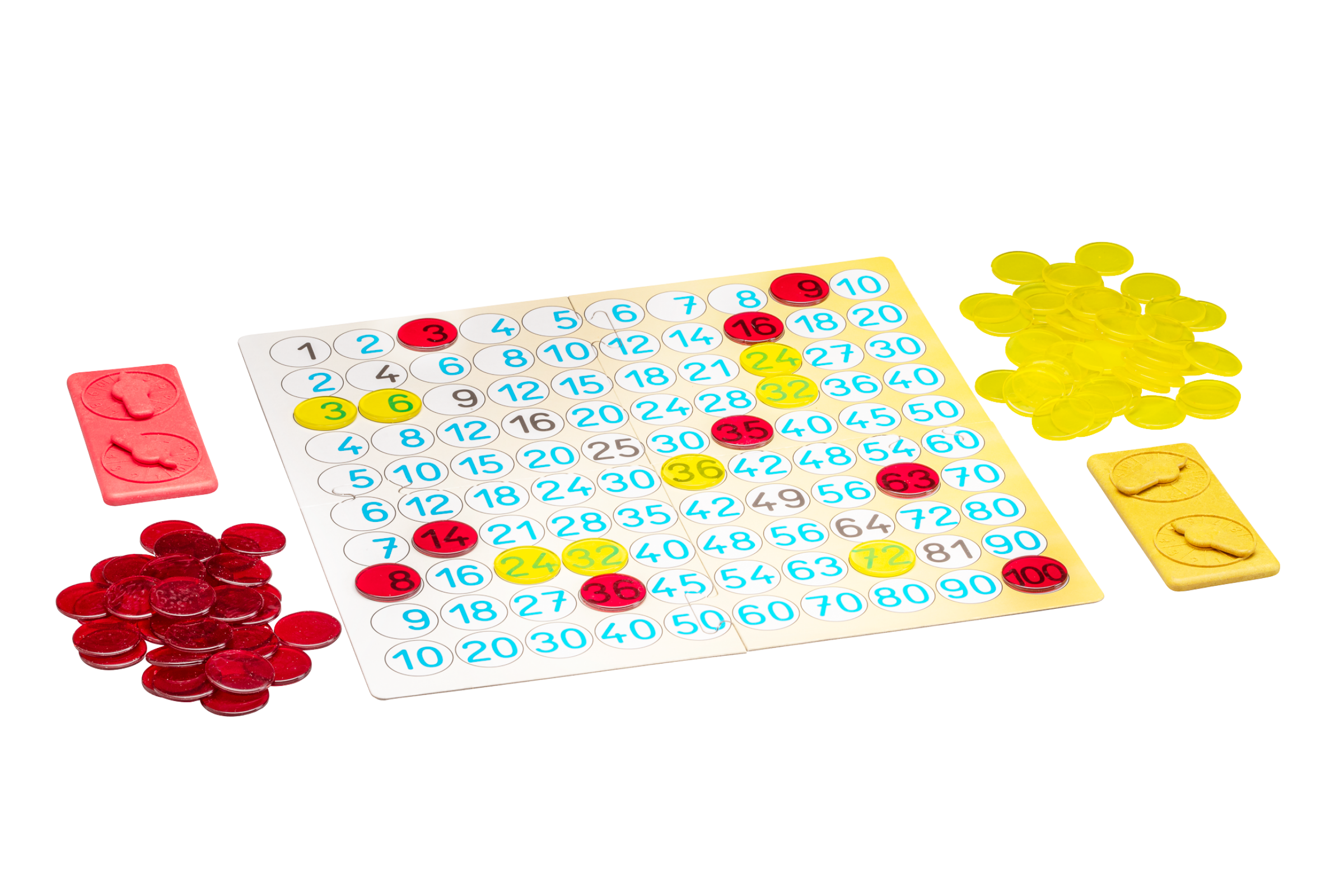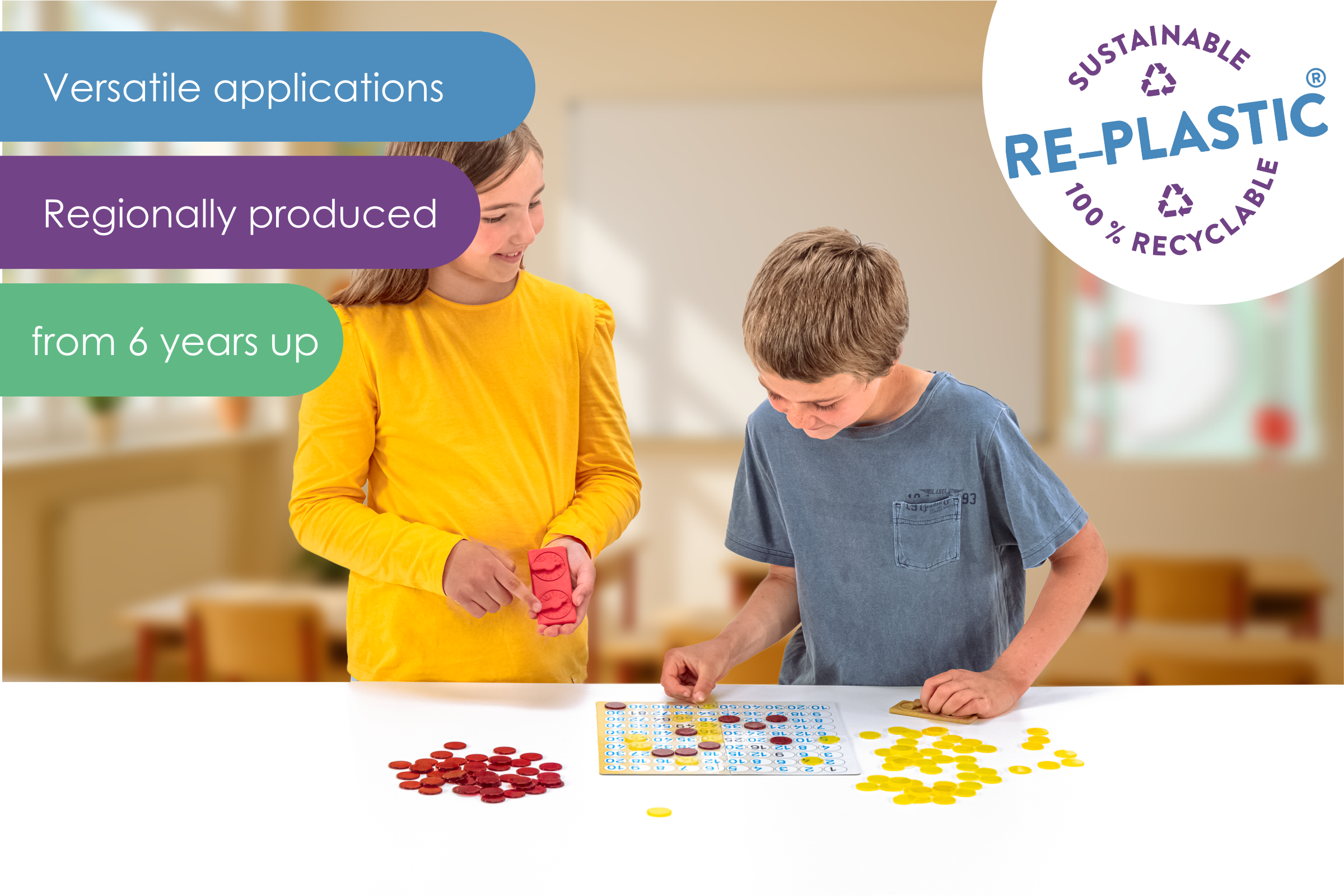 1 game board, 55 red and 55 yellow transparent tiles each made of RE-Plastic®, 2 random generators with 2 spinning wheels made of RE-Wood®, 1 instruction in 4 languages (DE, EN, FR and ES) with solution table.