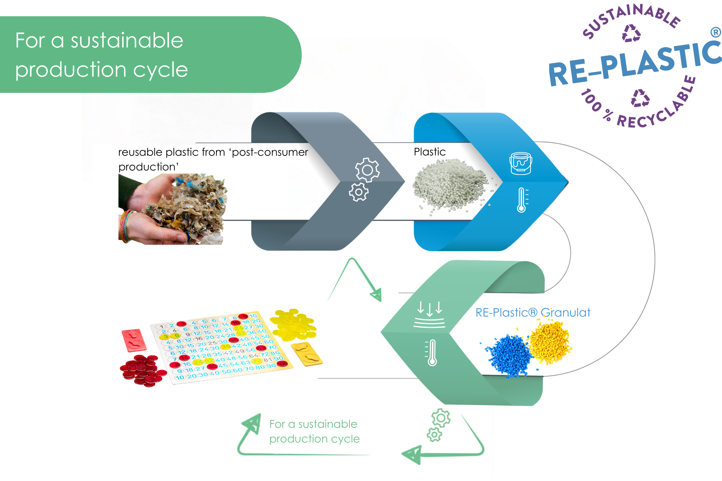 RE-Plastic is 100% post-consumer recycled plastic which is 100% recyclable again.