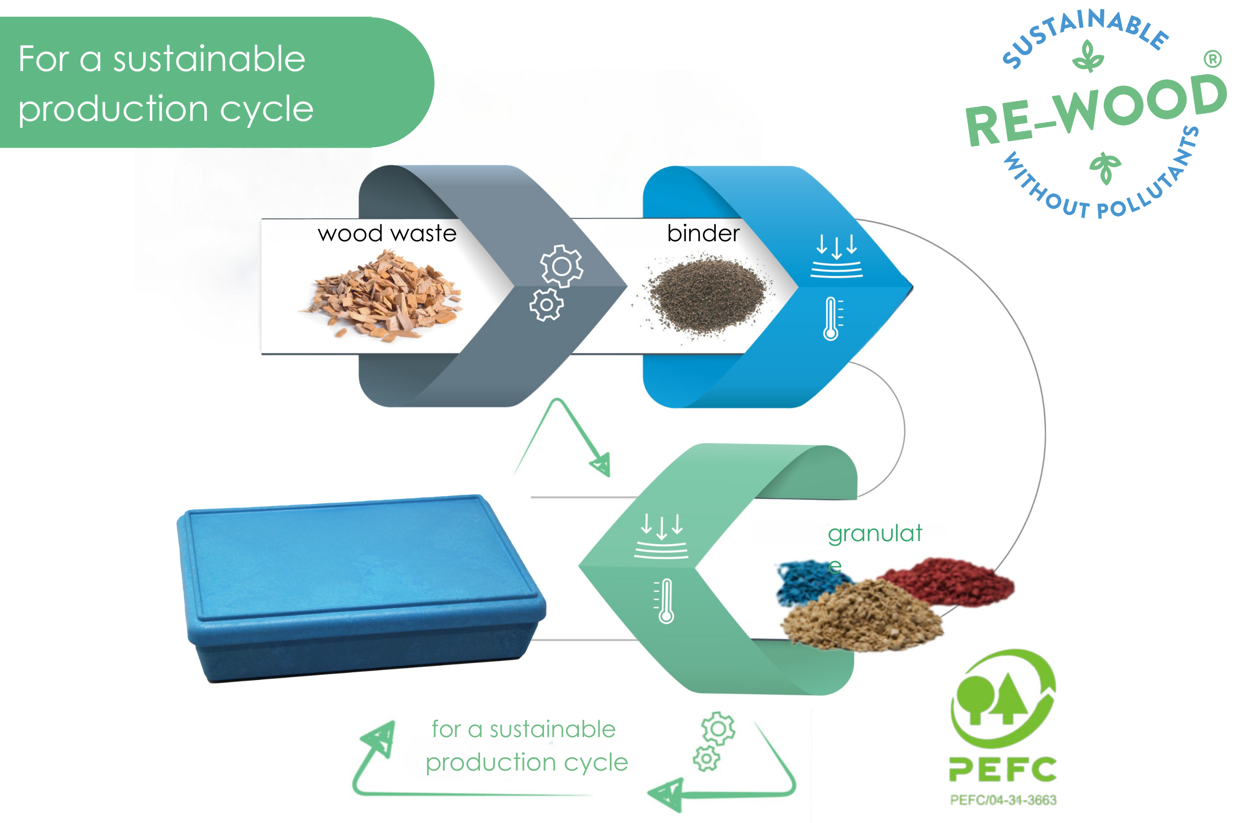 RE-Wood is made from 100% recycled materials (up to 80% from regional wood waste), PEFC certified and can be recycled again and again after use.
