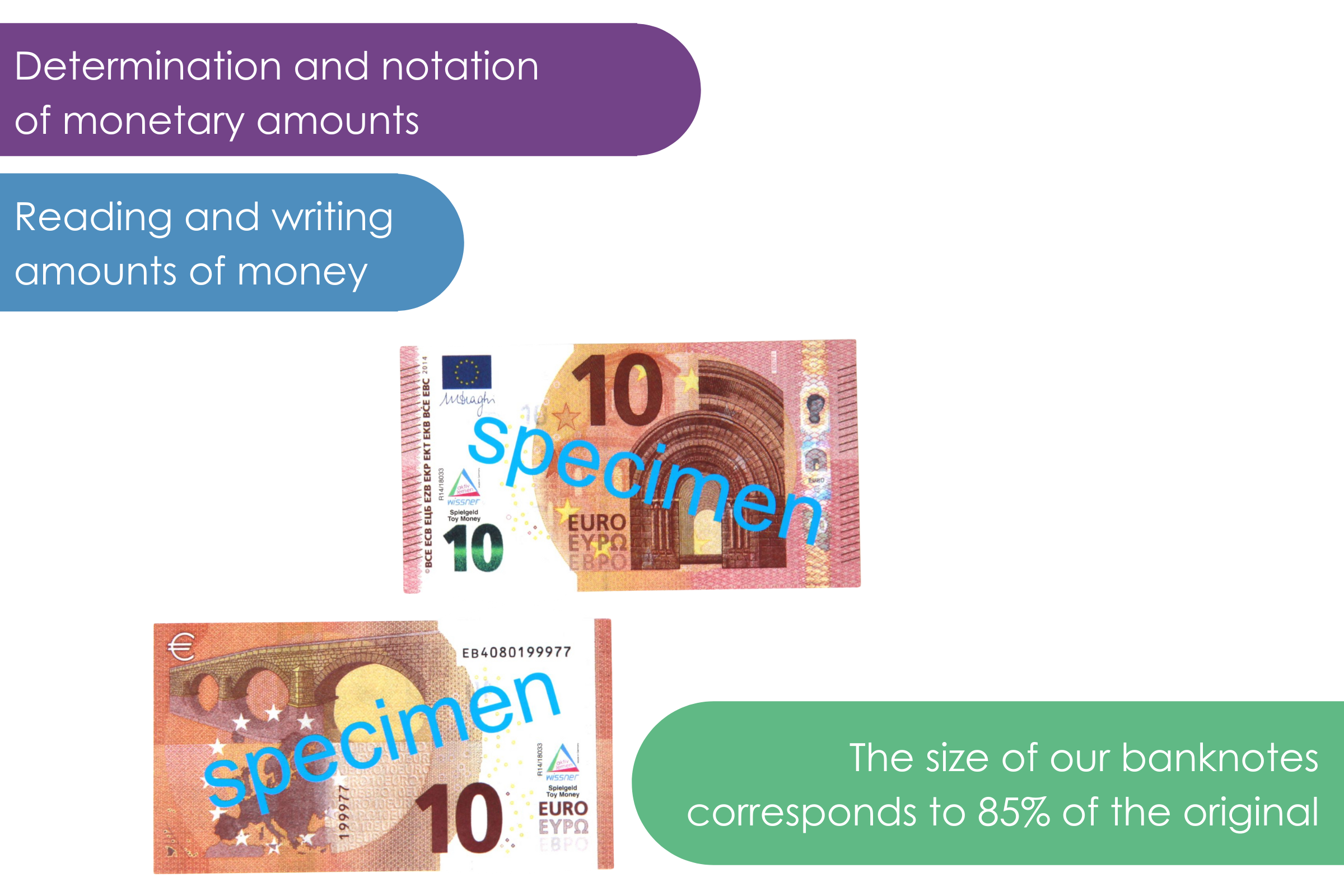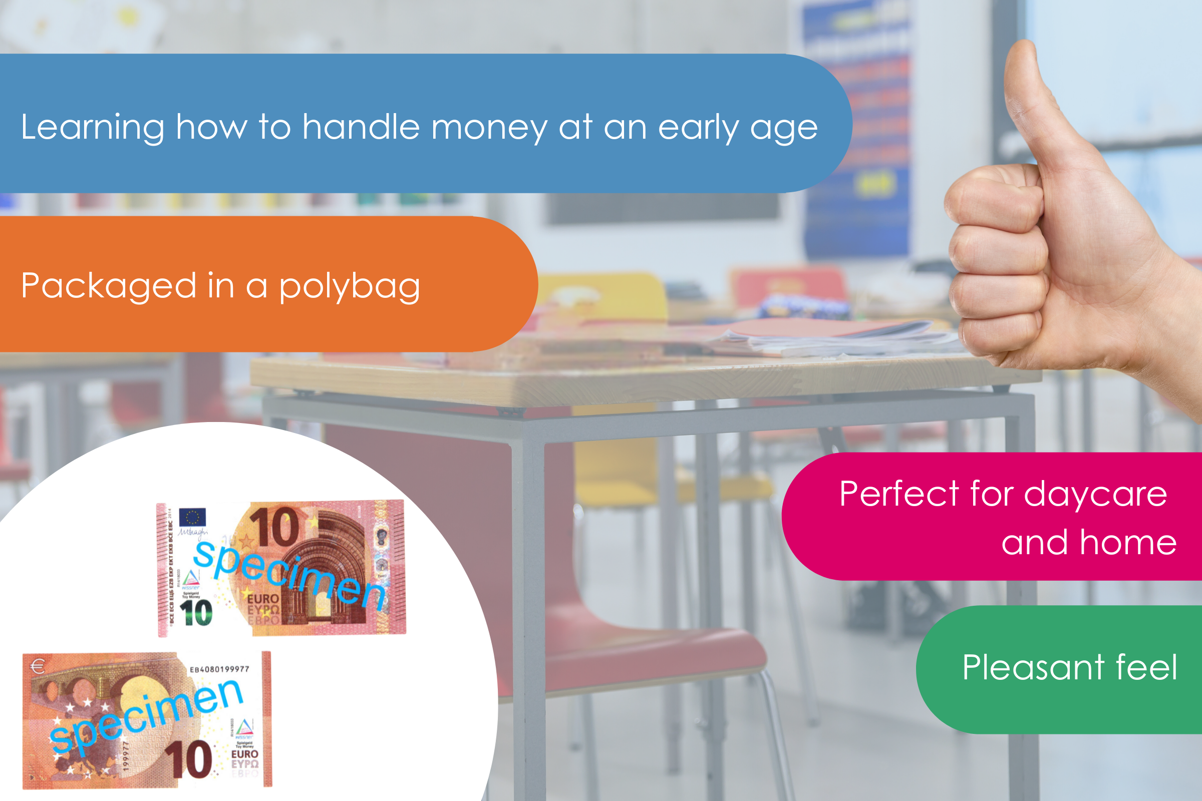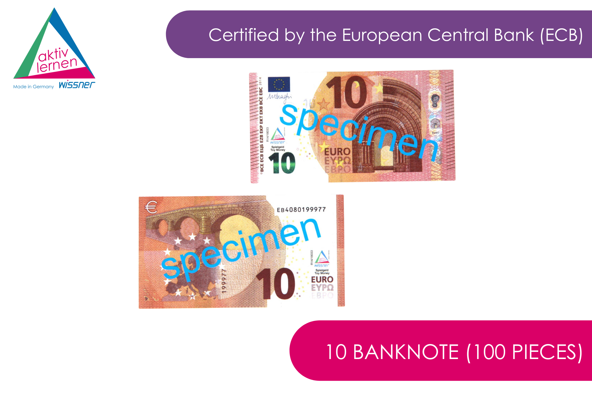 140 banknotes, printed on both sides of paper. 20 pieces each.  Certified by the European Central Bank ECB. Our banknotes are made of reinforced paper, printed on both sides and with a color SPECIMEN imprint, so that they can be easily distinguished from real banknotes. The size of our banknotes is 85% the same as the original. ECB No. R14/18033.Packed in a reclosable FSC-certified paper bag.