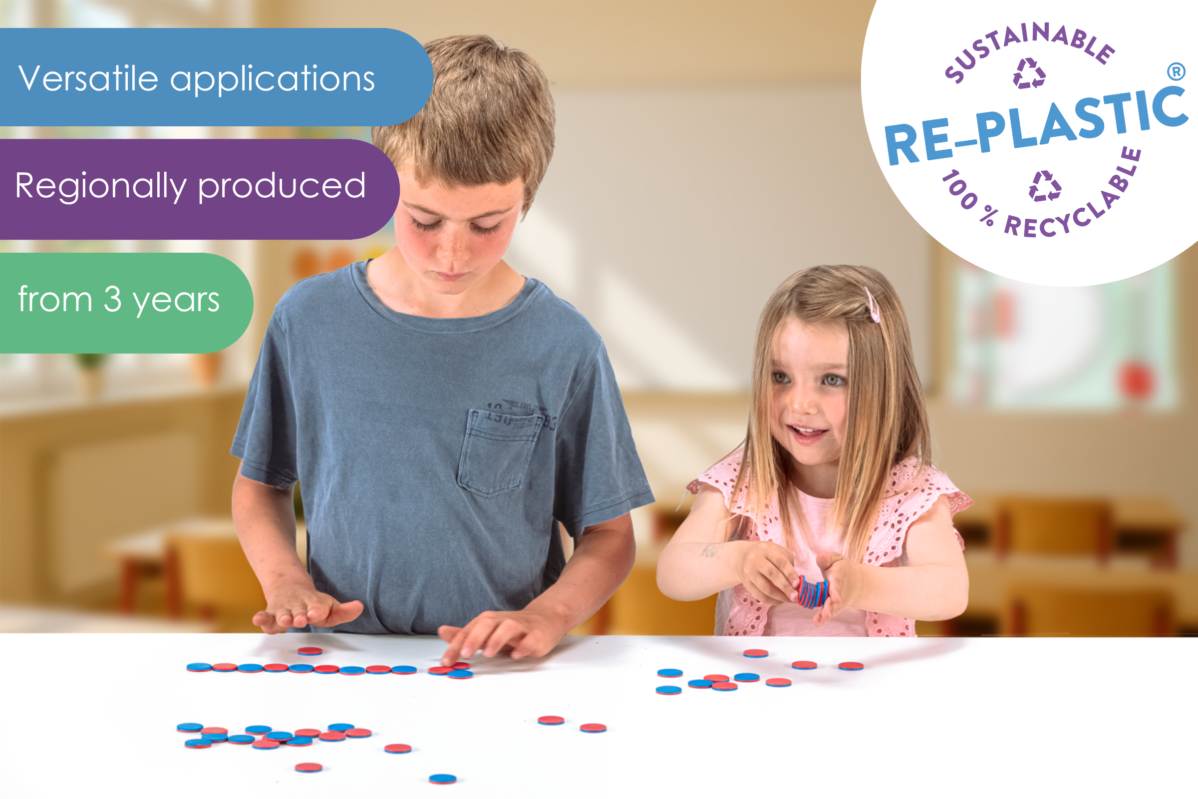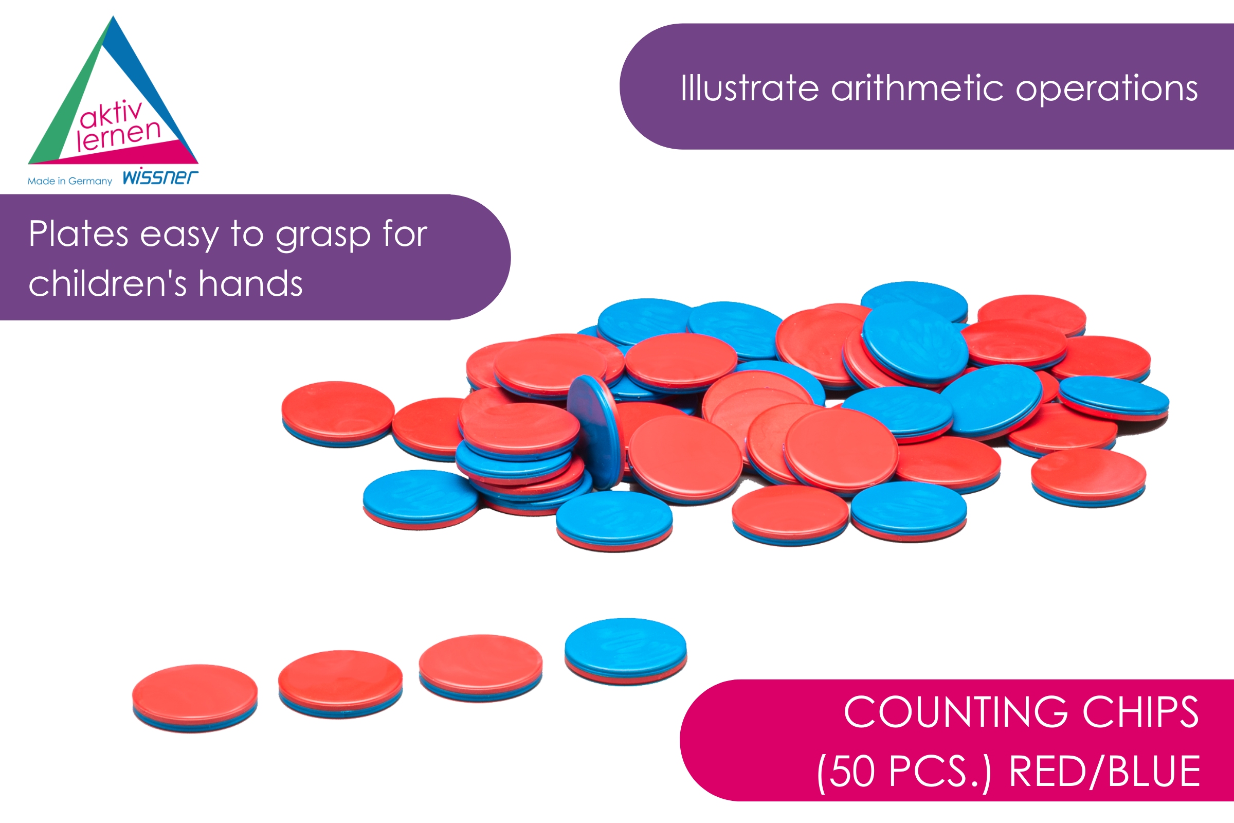 Printed on one side with numbers 1-20, the other unprinted and writable with non-permanent markers.Front side printed with numbers 1-20, back side empty circles to fill in yourself.22 counting chips (Ø 2.5cm) and 10 arithmetic signs. With a diameter of 2.5 cm and a thickness of 0.4 cm, the chips are easy to grasp for children's hands.Packed in polybag.