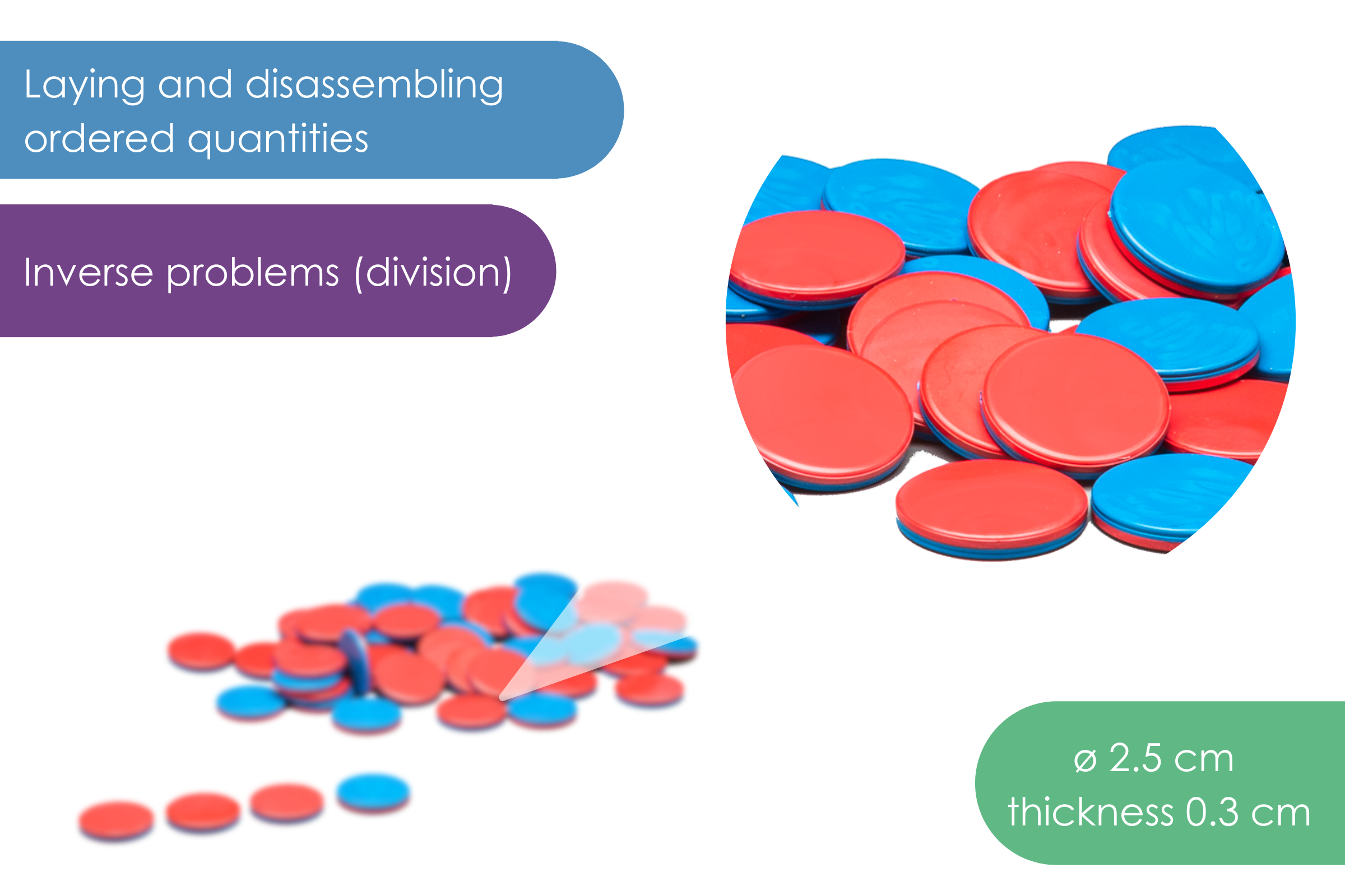 100 magnetic counters red / blue and 25 magnetic arithmetic signs (Ø 5cm).Packed in RE-Wood box with insert and cardboard insert.