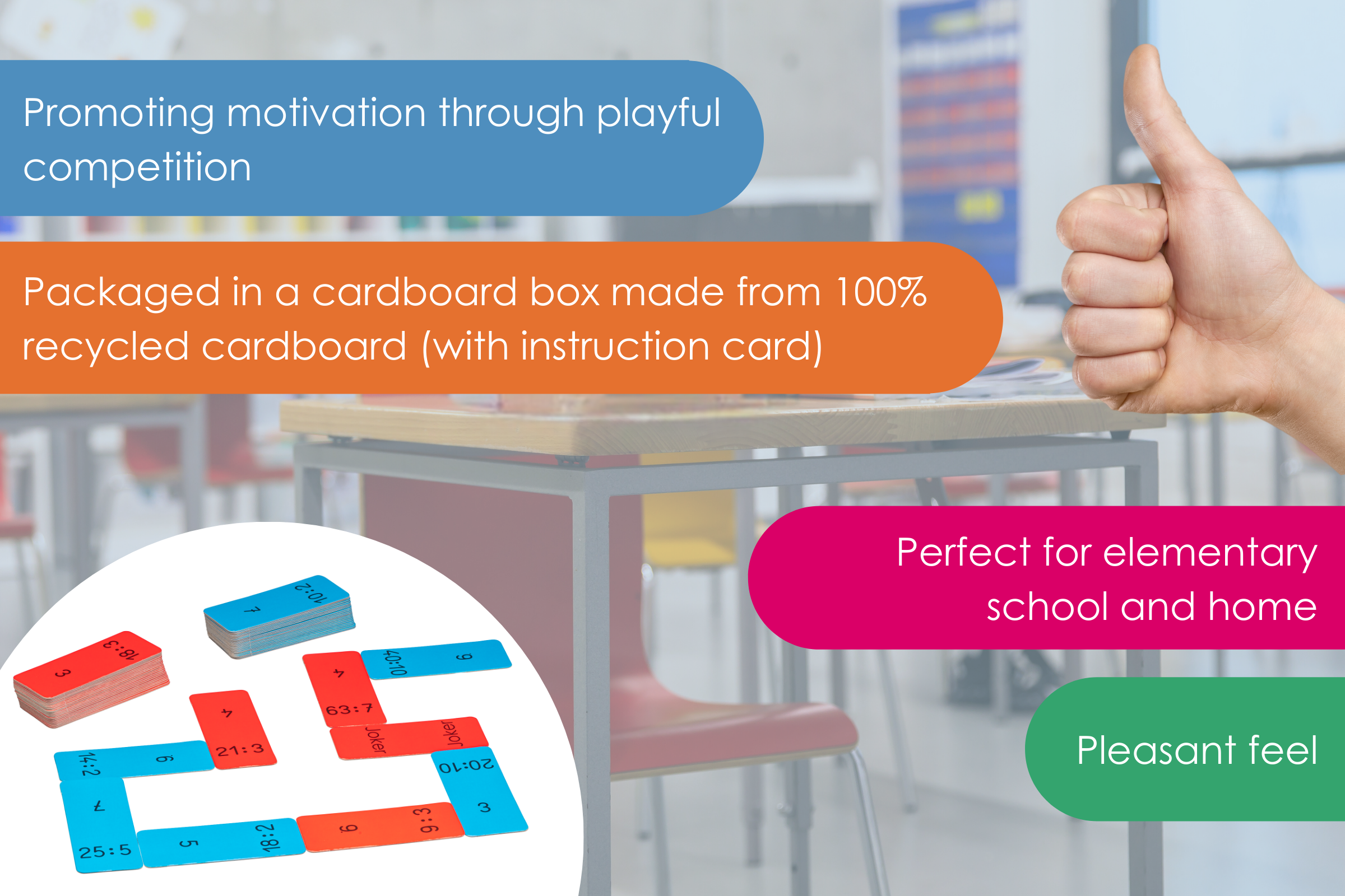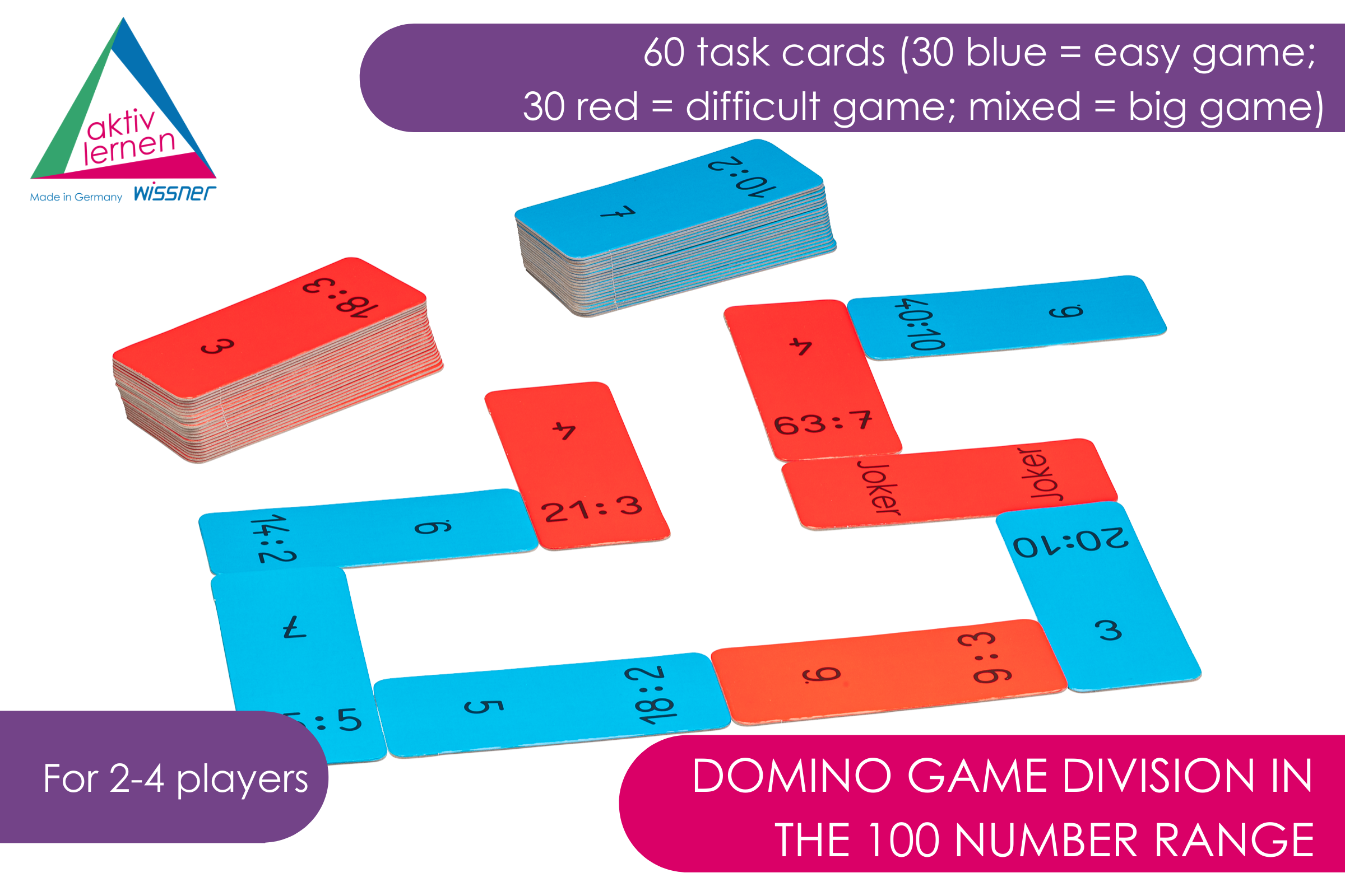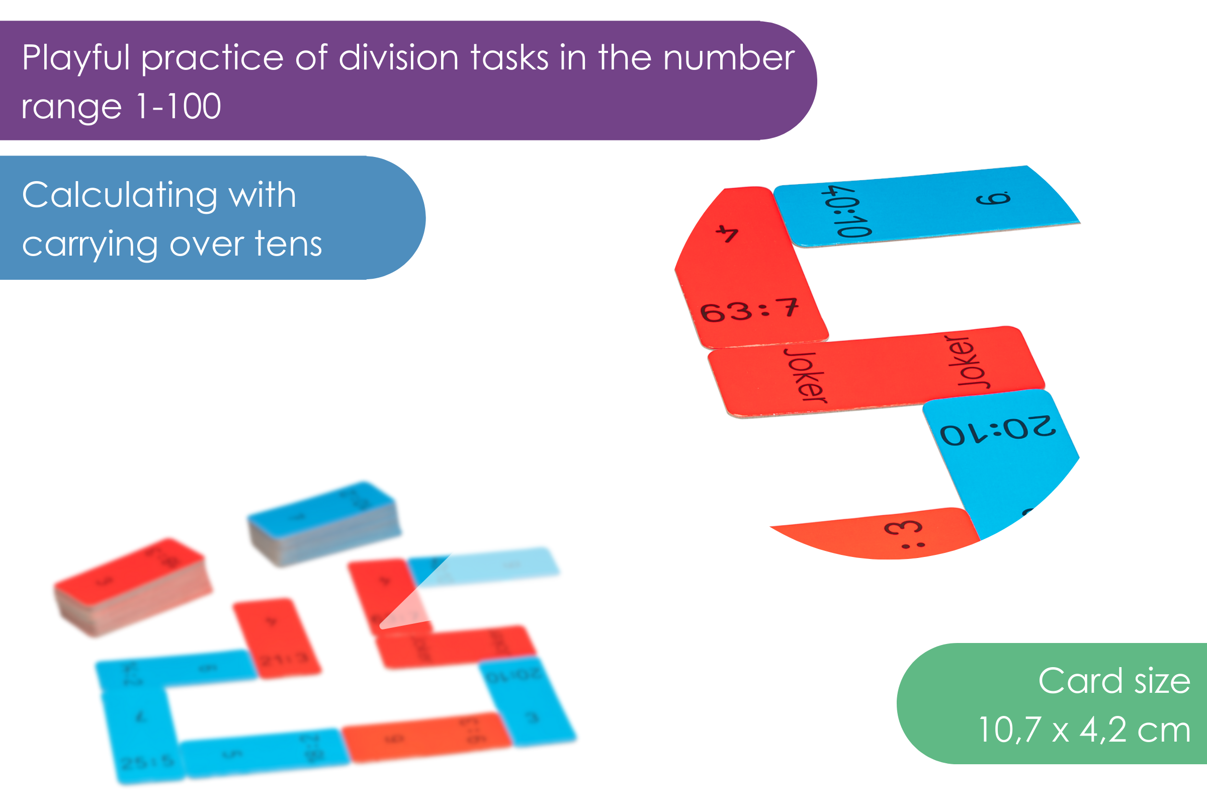 60 task cards (30 blue = easy game; 30 red = difficult game; mixed = large game).Playful practice of division tasks in the number range 1-100.