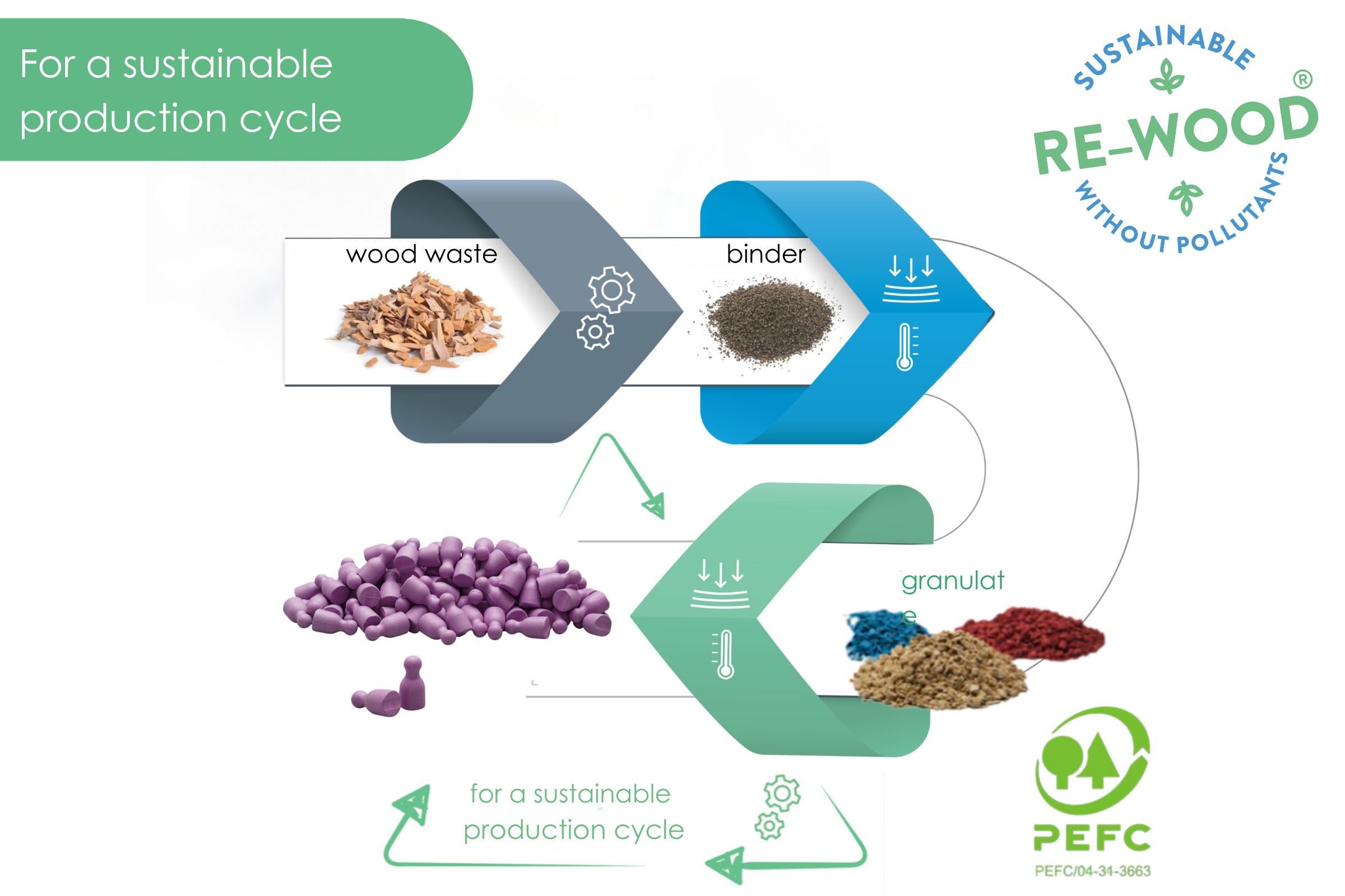 RE-Wood is made from 100% recycled materials (up to 80% from regional wood waste), PEFC certified and can be recycled again and again after use.