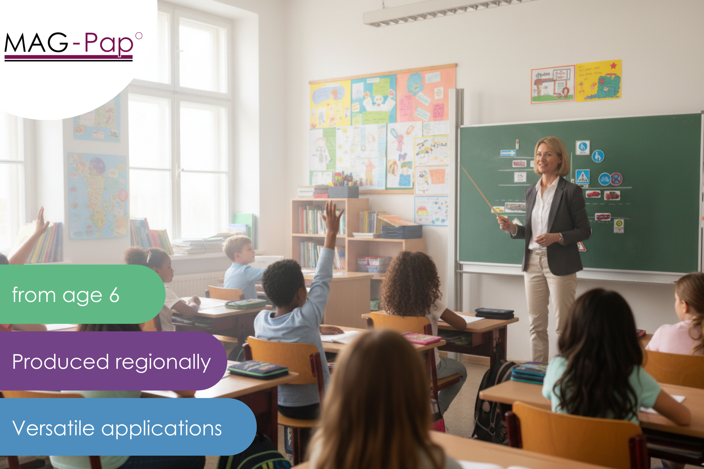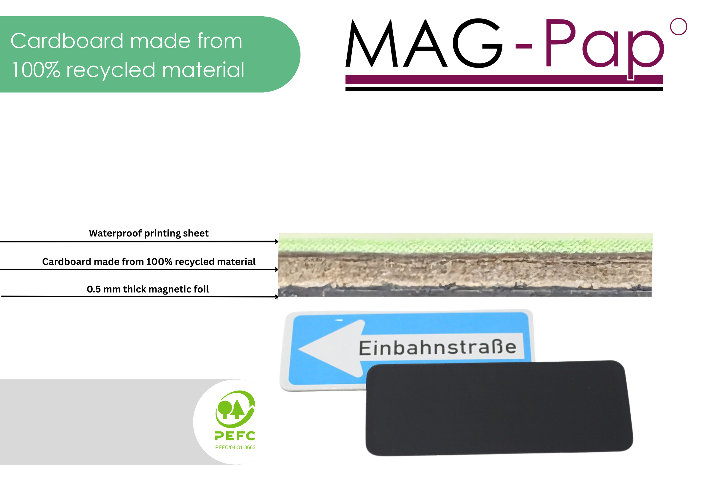 Magnetic foil meets recycled cardboard, surface laminated for long-lasting use - ideal for blackboards, whiteboards & co.