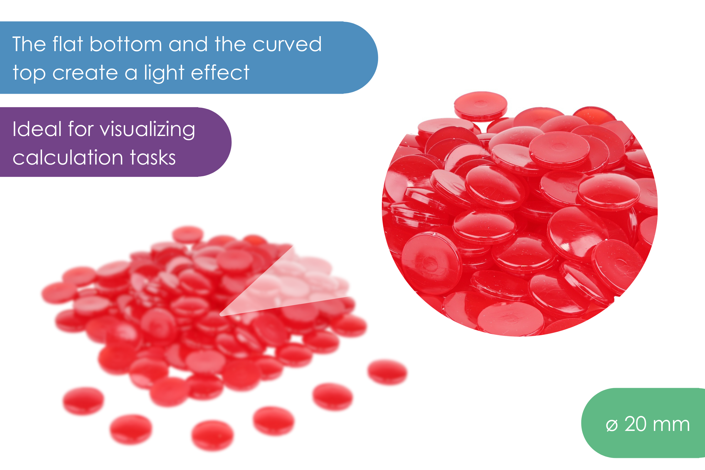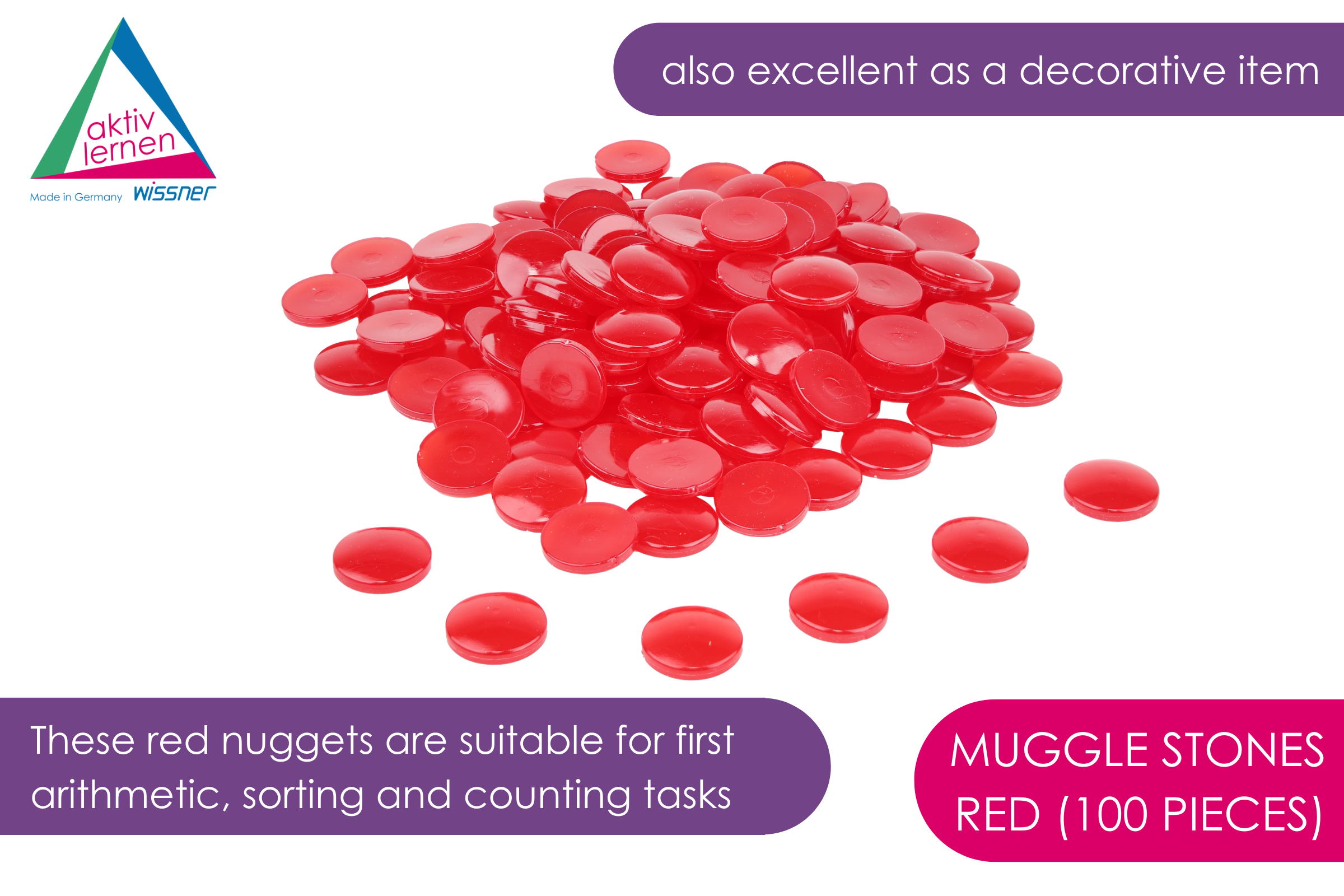 These red nuggets are suitable for first arithmetic, sorting and counting tasks. The flat bottom and curved top create a light effect, which makes the Muggle bricks suitable for use as a magnifying glass and for teaching the basics of optics. This laying material is also ideal as a decorative item