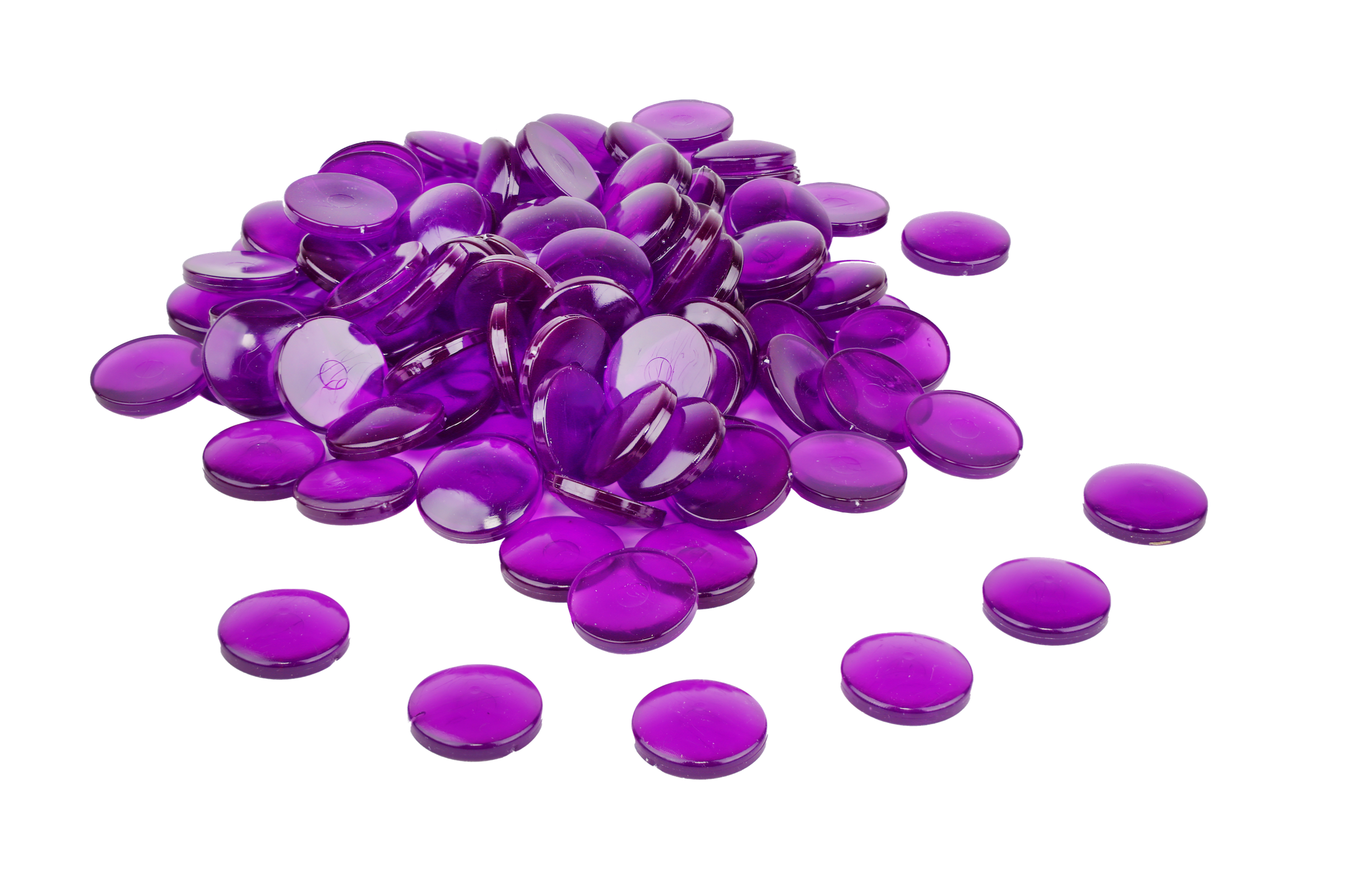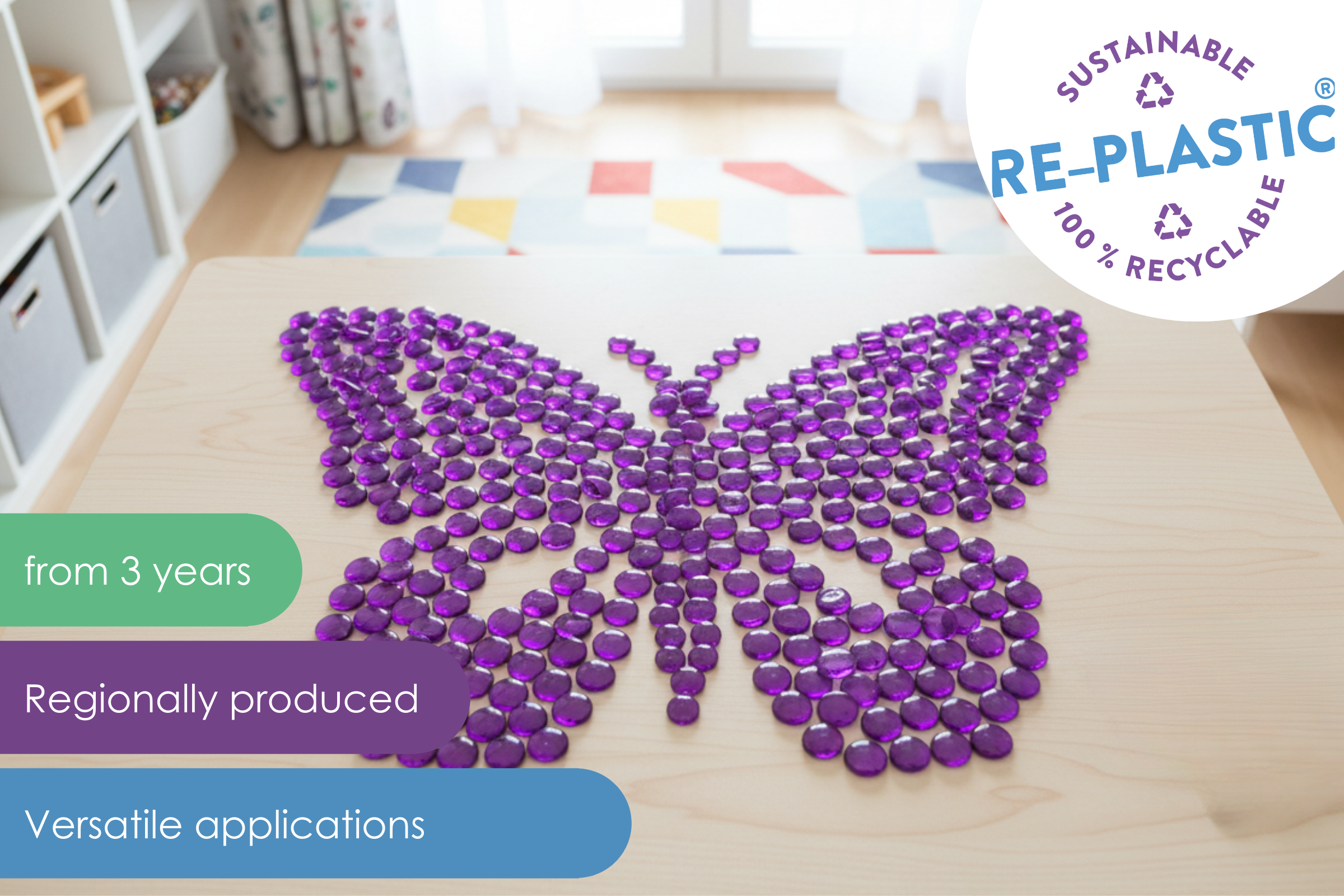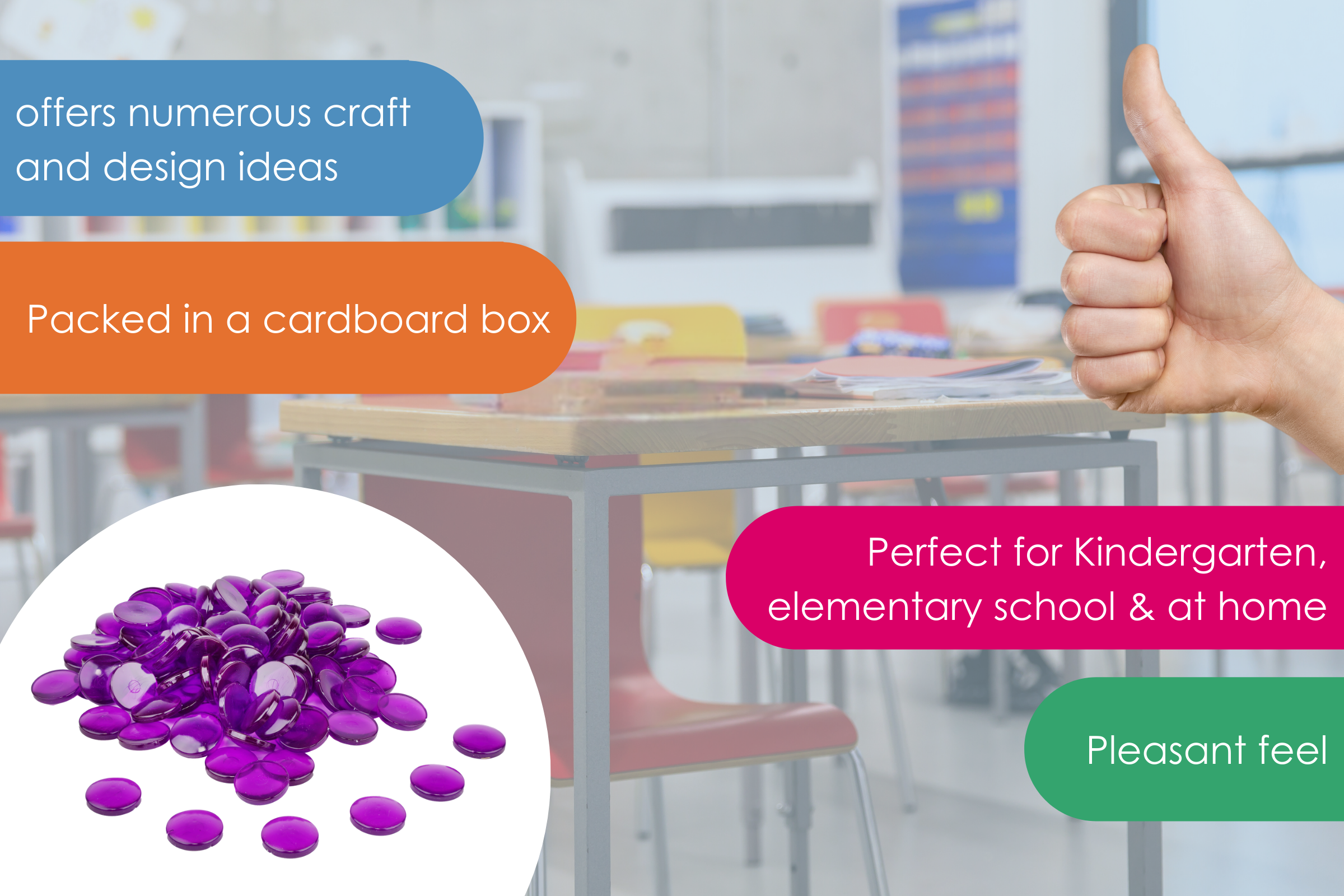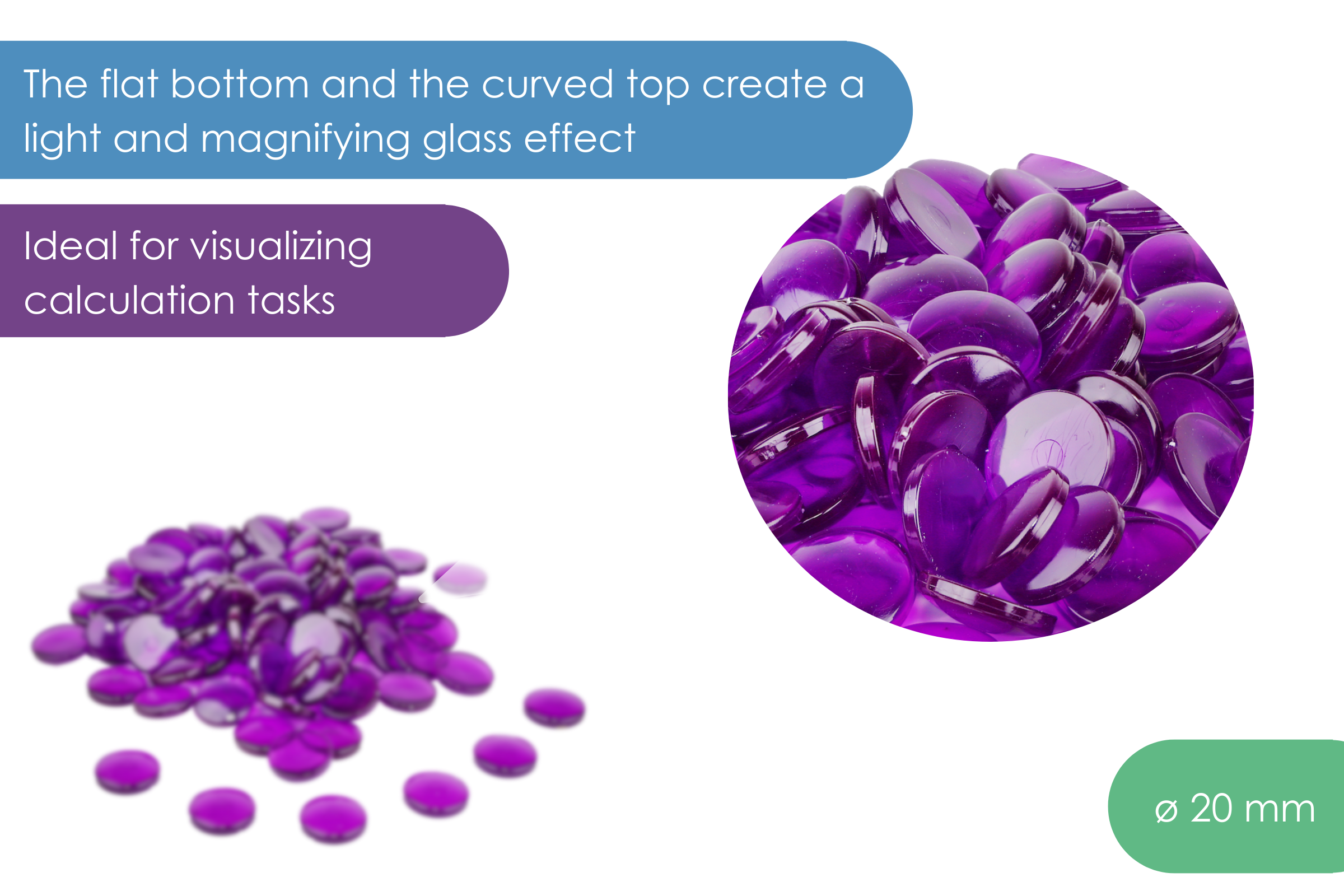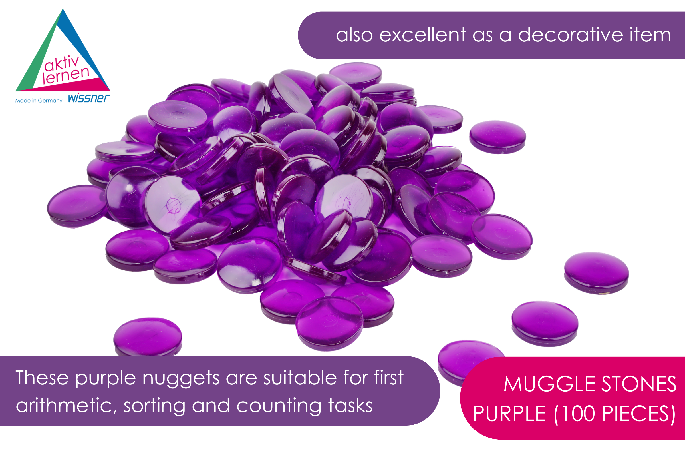 These purple nuggets are suitable for first arithmetic, sorting and counting tasks. The flat bottom and curved top create a light effect, which makes the Muggle bricks suitable for use as a magnifying glass and for teaching the basics of optics. This laying material is also ideal as a decorative item