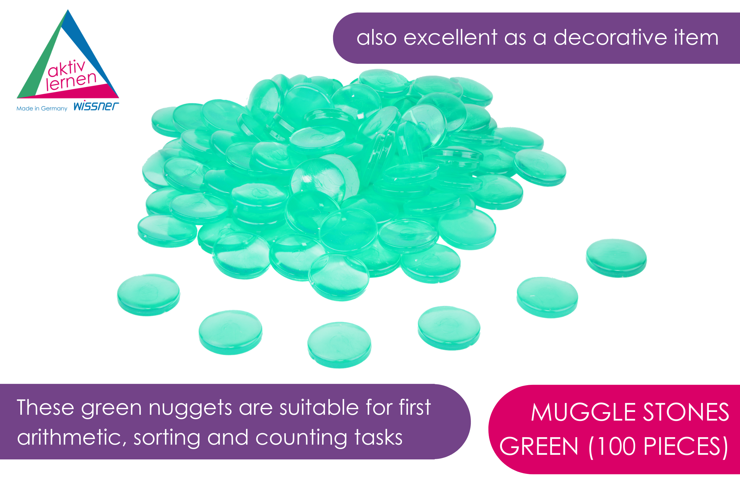 These green nuggets are suitable for first arithmetic, sorting and counting tasks. The flat bottom and curved top create a light effect, which makes the Muggle bricks suitable for use as a magnifying glass and for teaching the basics of optics. This laying material is also ideal as a decorative item