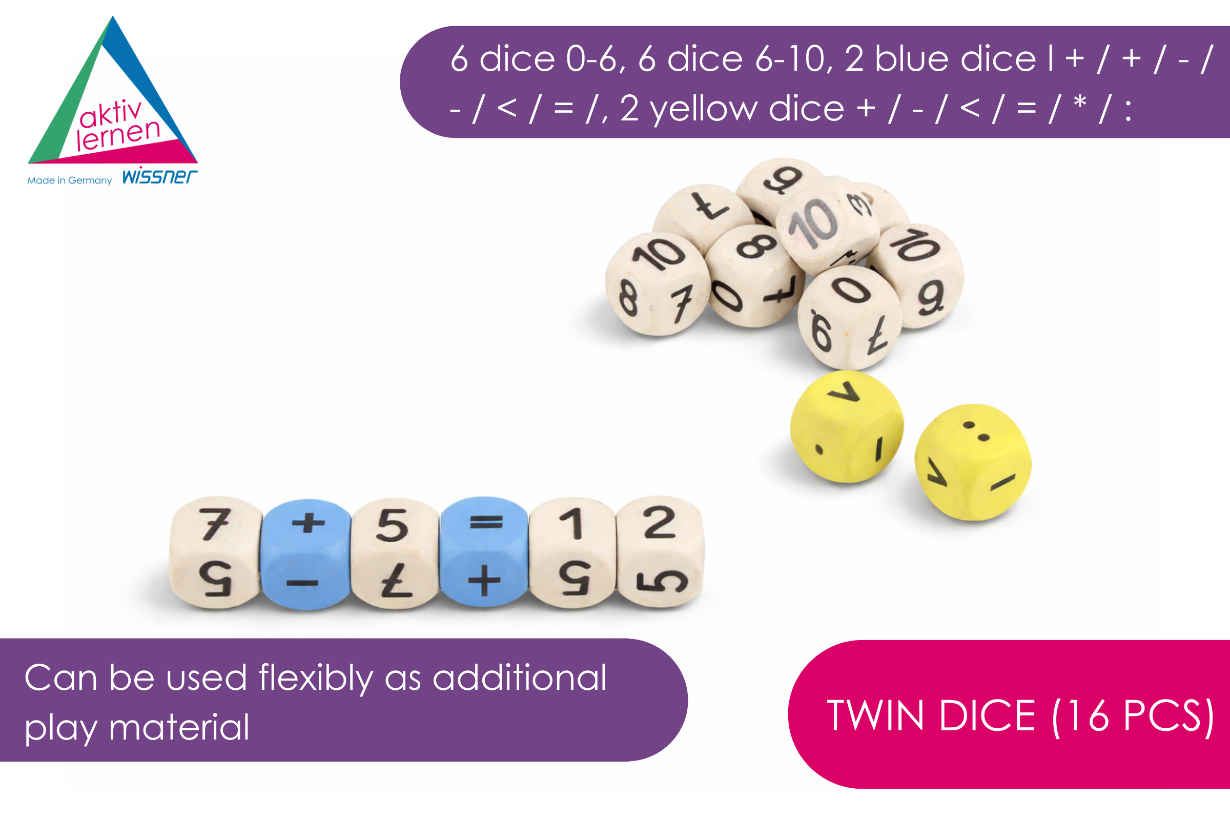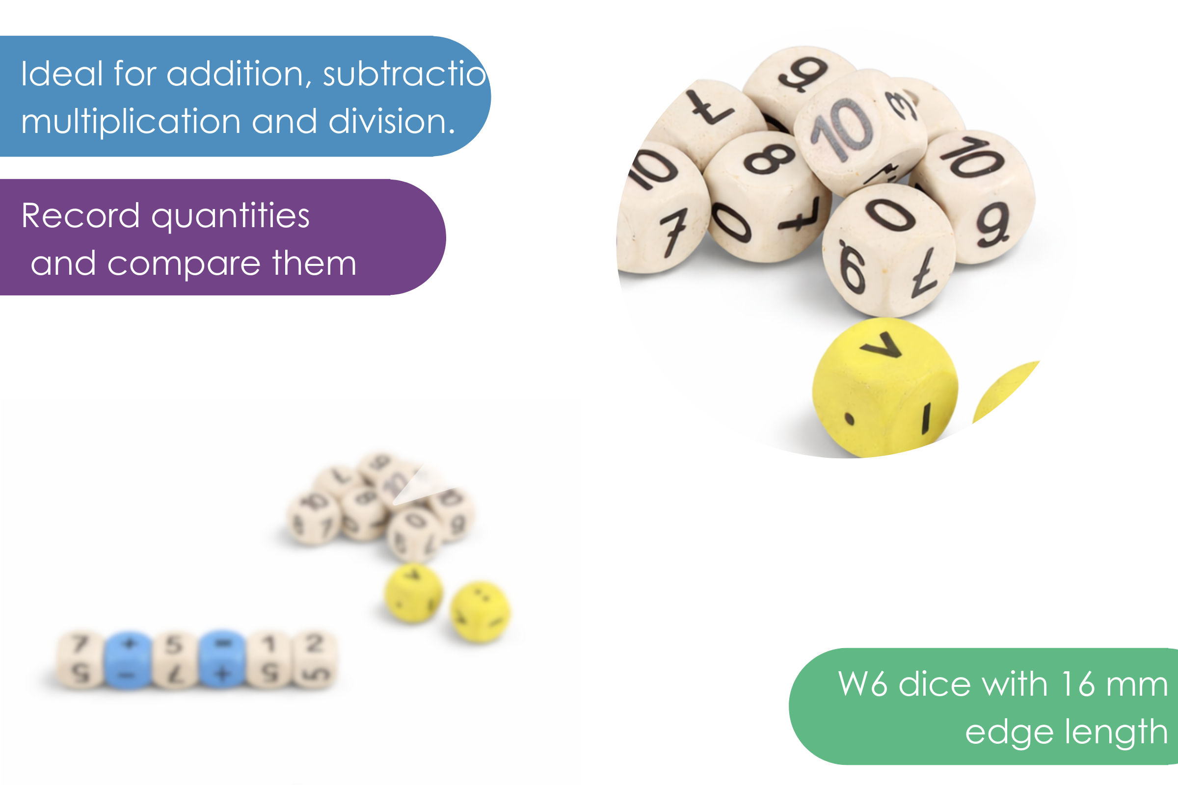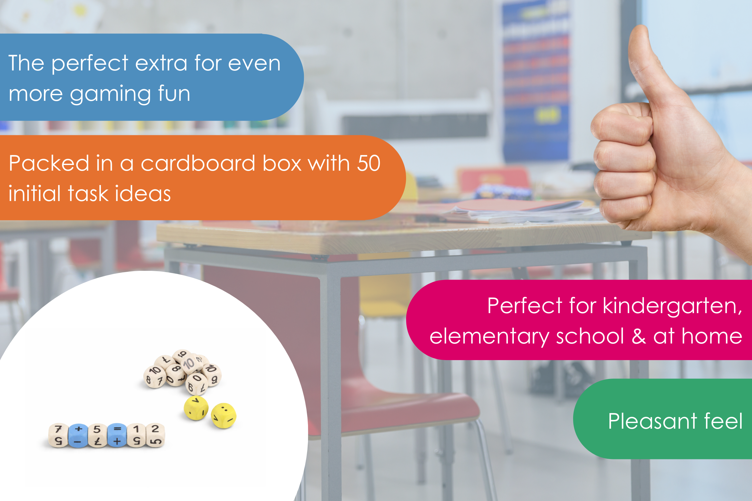 The number cubes make arithmetic playful and lively. Children set tasks, form equations and discover numbers, arithmetic symbols and results at their own pace.