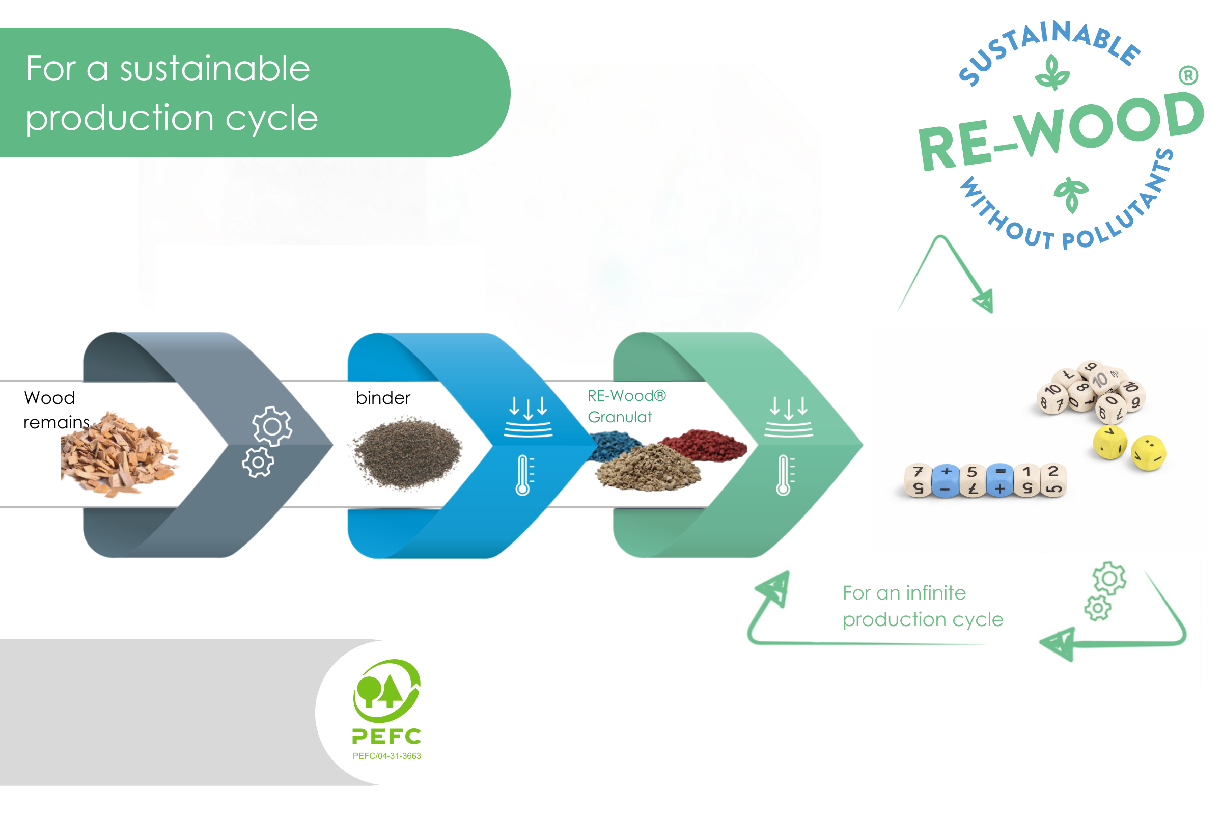 RE-Wood is made from 100% recycled materials (up to 80% from regional wood waste), PEFC certified and can be recycled again and again after use.
